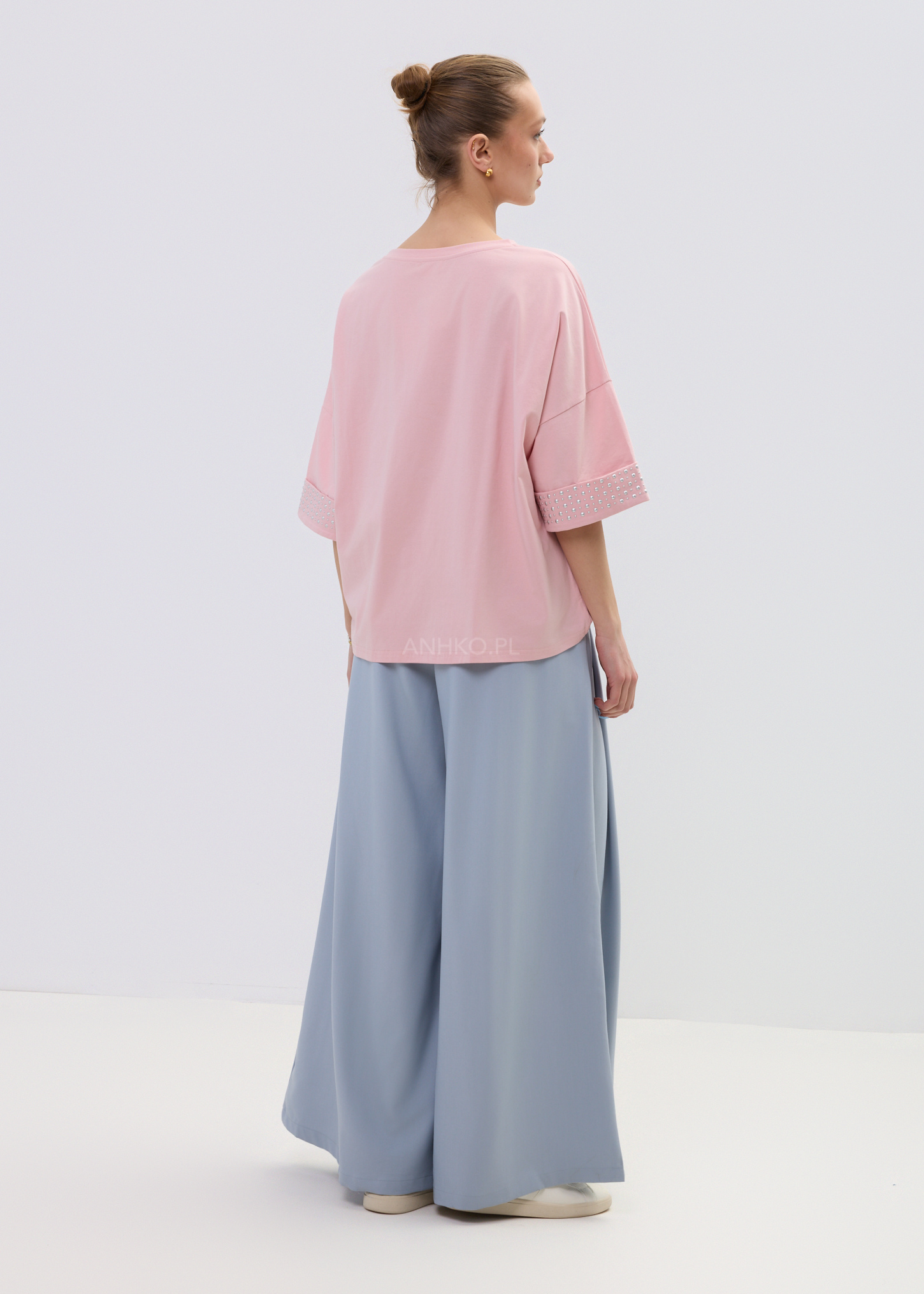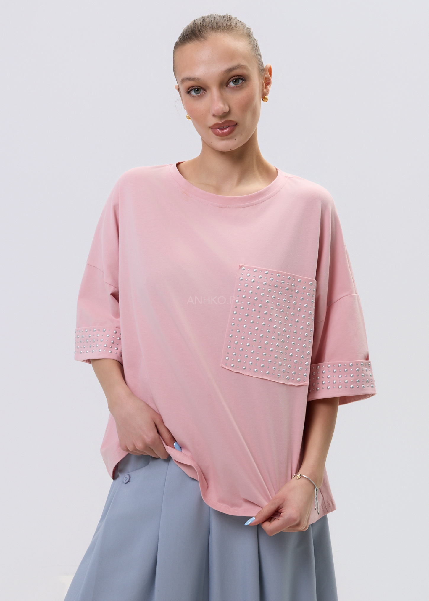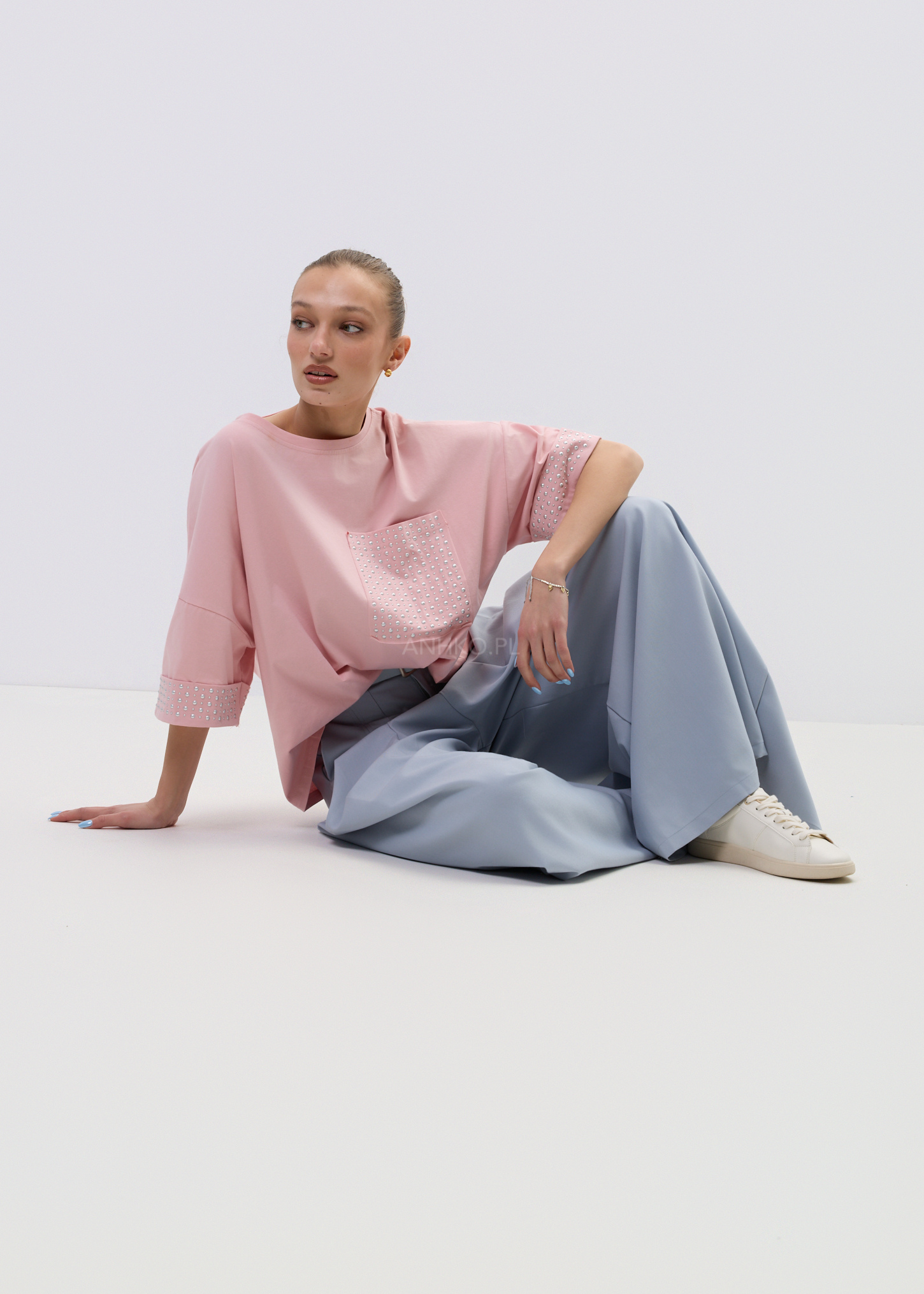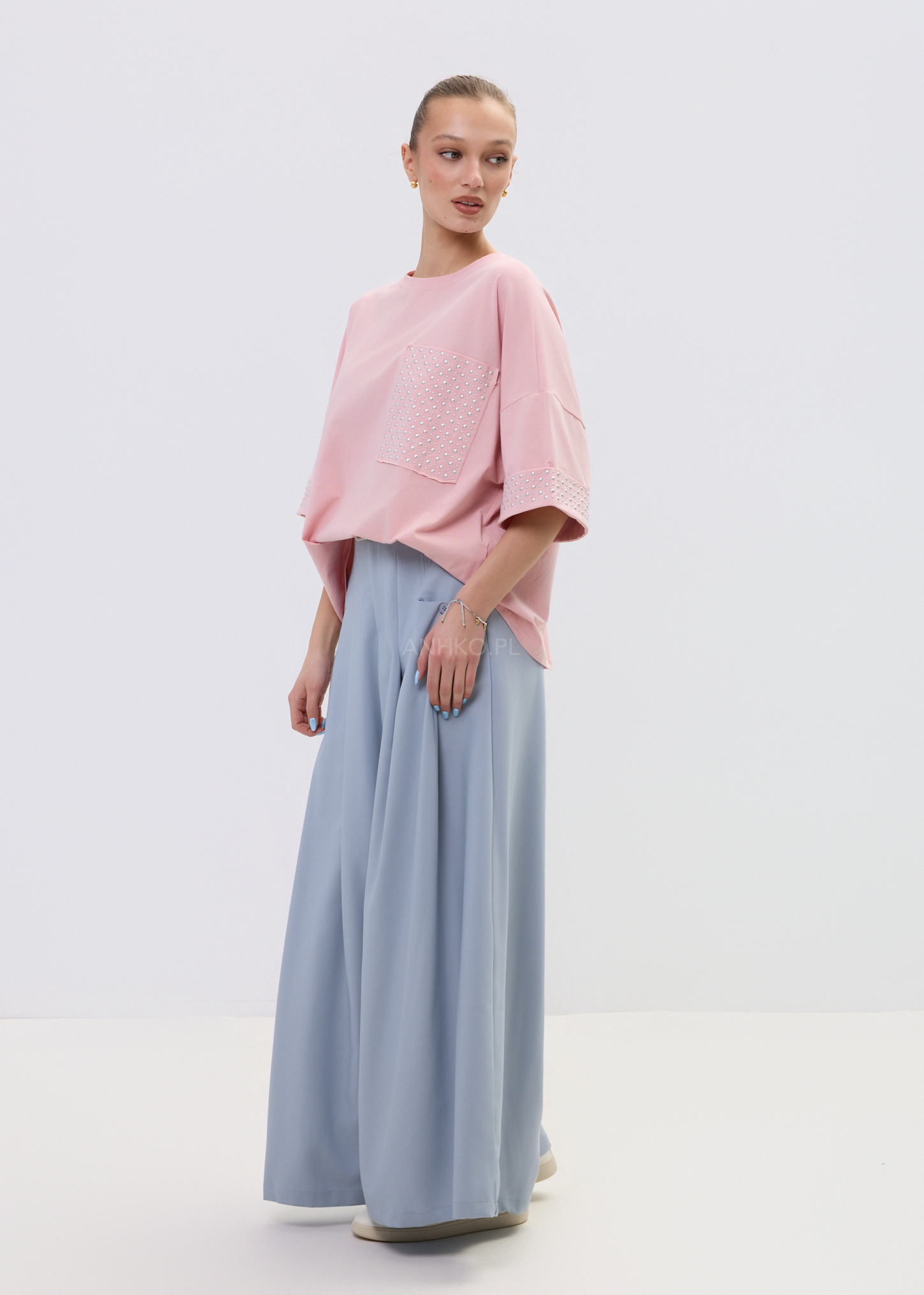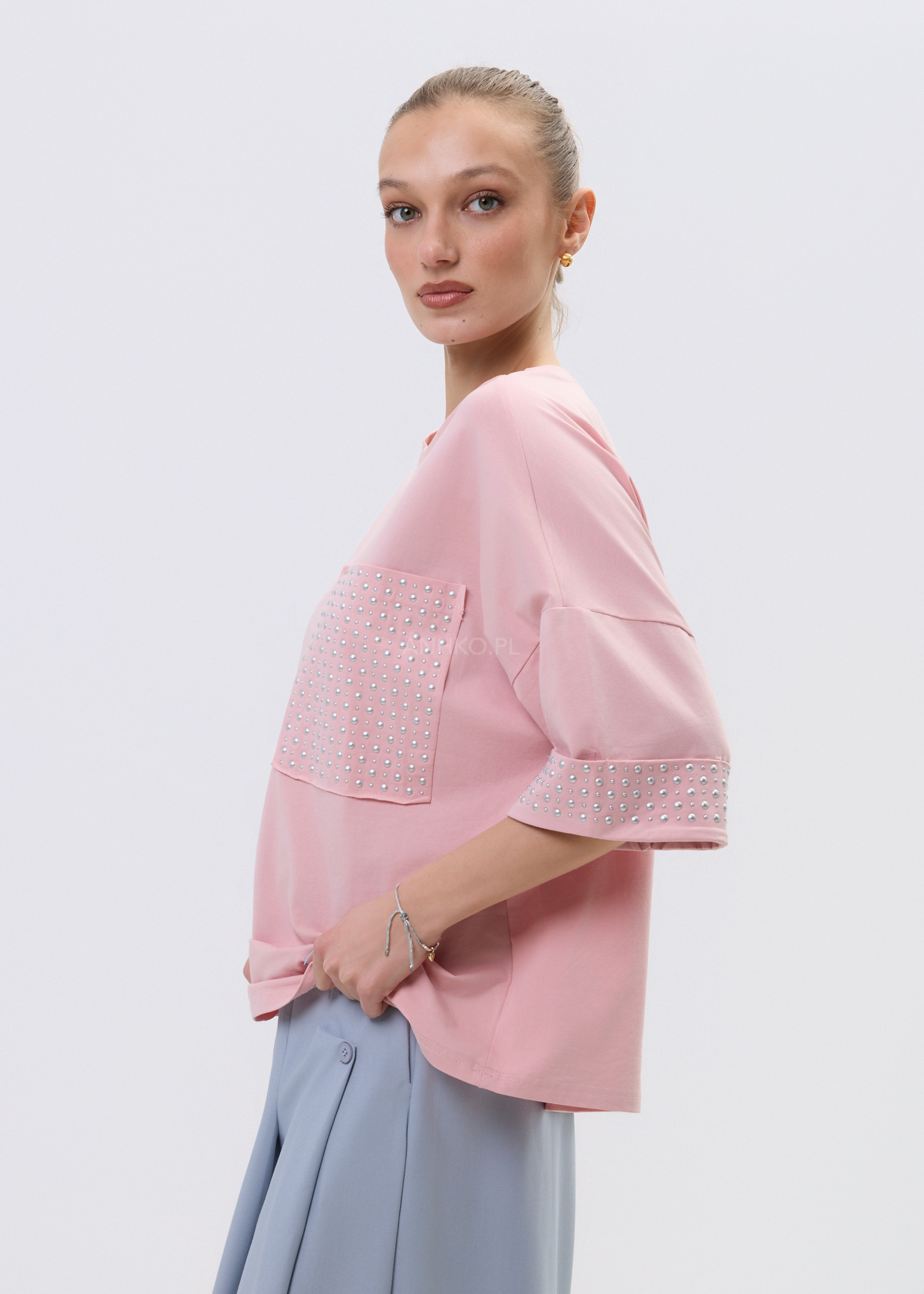 Model wyróżniają także szerokie rękawy wykończone dekoracyjnymi detalami, które spójnie nawiązują do zdobienia kieszeni. Dzięki temu bluzka łączy w sobie swobodny krój oversize, ozdobne aplikacje z perełek oraz uniwersalny różowy kolor. To świetna baza stylizacji – dobrze wygląda zarówno z jeansami, jak i z eleganckimi spodniami lub spódnicą, tworząc miejski, dopracowany zestaw.