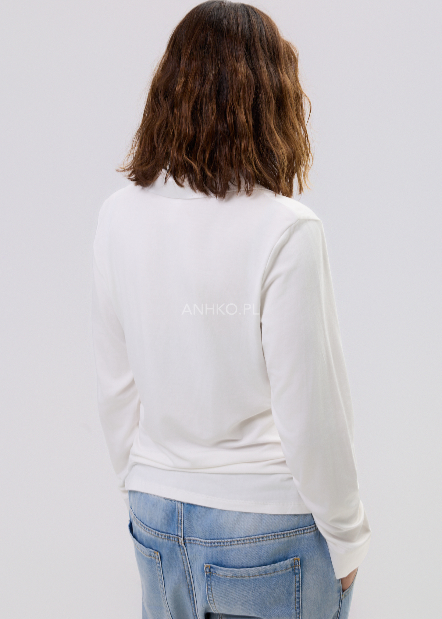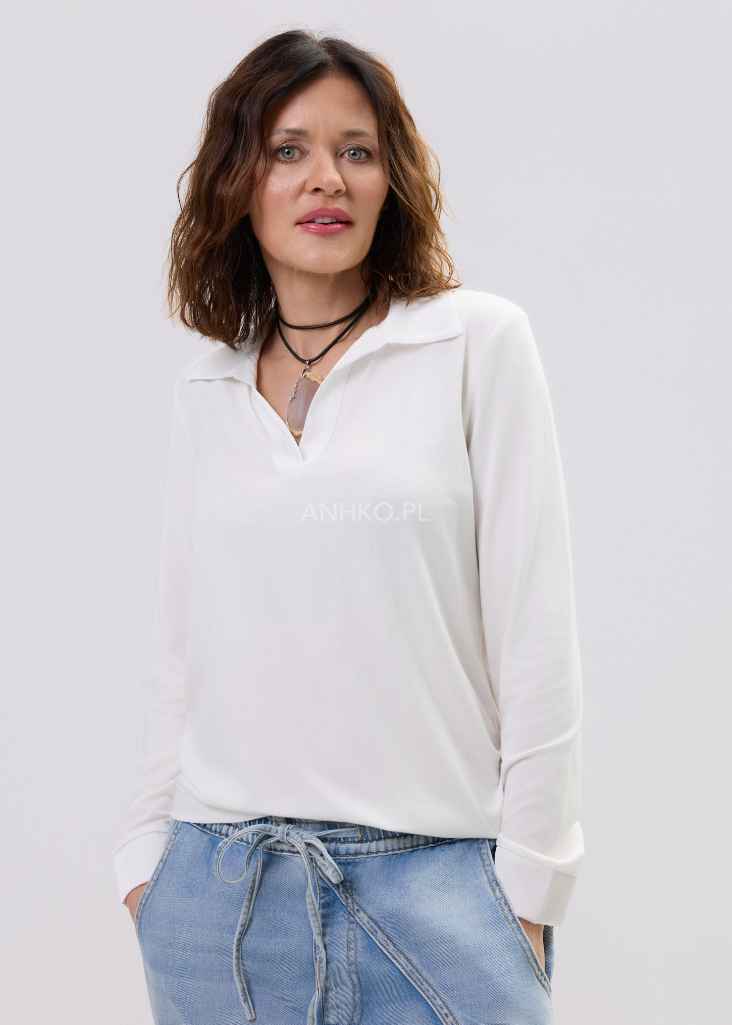 Model wyróżnia się dekoltem polo z miękkim kołnierzykiem, który nadaje całości subtelnie sportowego charakteru. Miękki, elastyczny materiał sprawia, że bluzka jest przyjemna w noszeniu i dopasowuje się do ruchów ciała. To uniwersalny element garderoby, który świetnie sprawdzi się w stylizacjach casualowych, biurowych oraz w nowoczesnym miejskim looku.