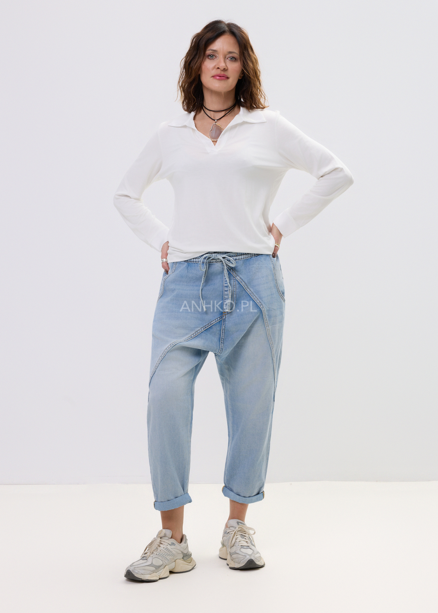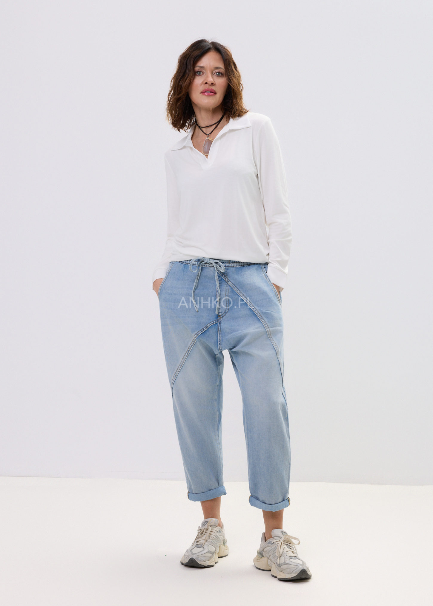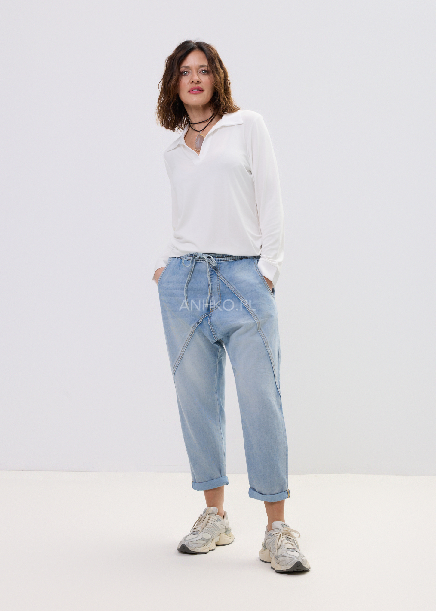 Jeansy Urbano Flowe Denim - Luźne jeansy w nowoczesnym wydaniu. Miękki denim, elastyczna talia z troczkiem i charakterystyczne, asymetryczne przeszycia tworzą miejski, swobodny look. Idealne na co dzień – wygodne, stylowe i bardzo łatwe do stylizowania.