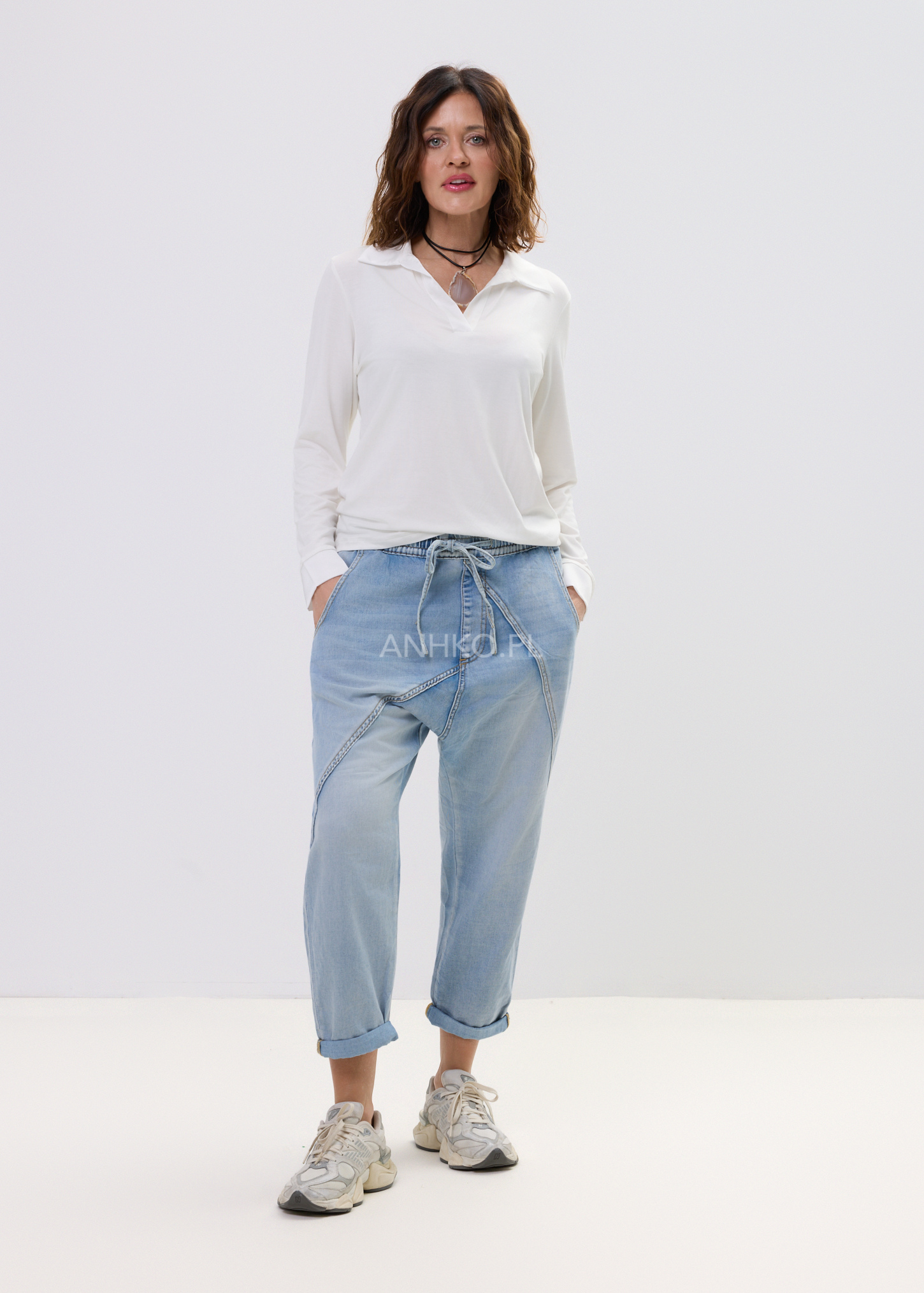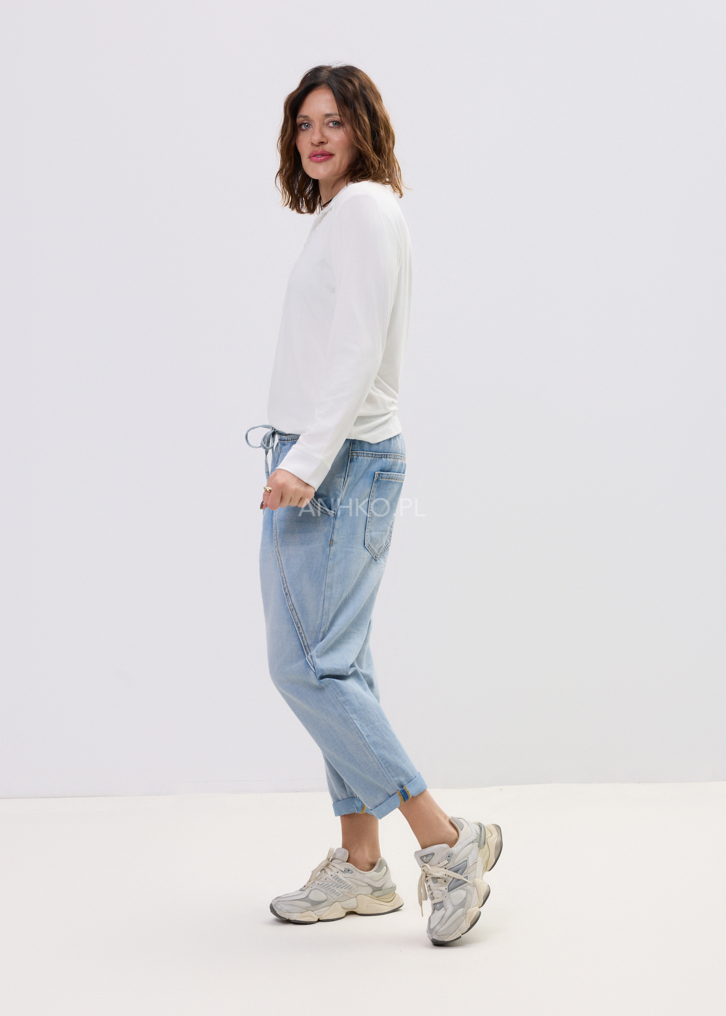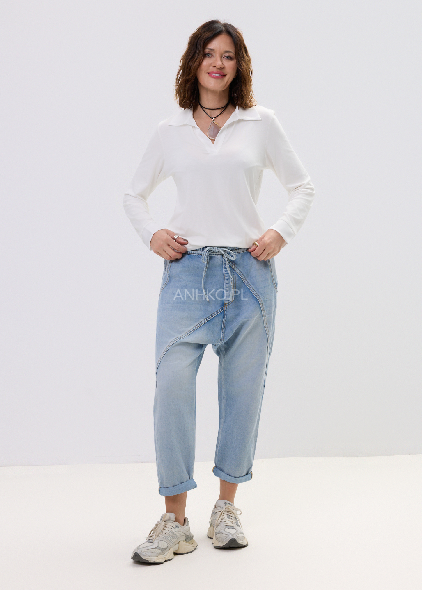 Jeansy Urbano Flowe Denim - Luźne jeansy w nowoczesnym wydaniu. Miękki denim, elastyczna talia z troczkiem i charakterystyczne, asymetryczne przeszycia tworzą miejski, swobodny look. Idealne na co dzień – wygodne, stylowe i bardzo łatwe do stylizowania.