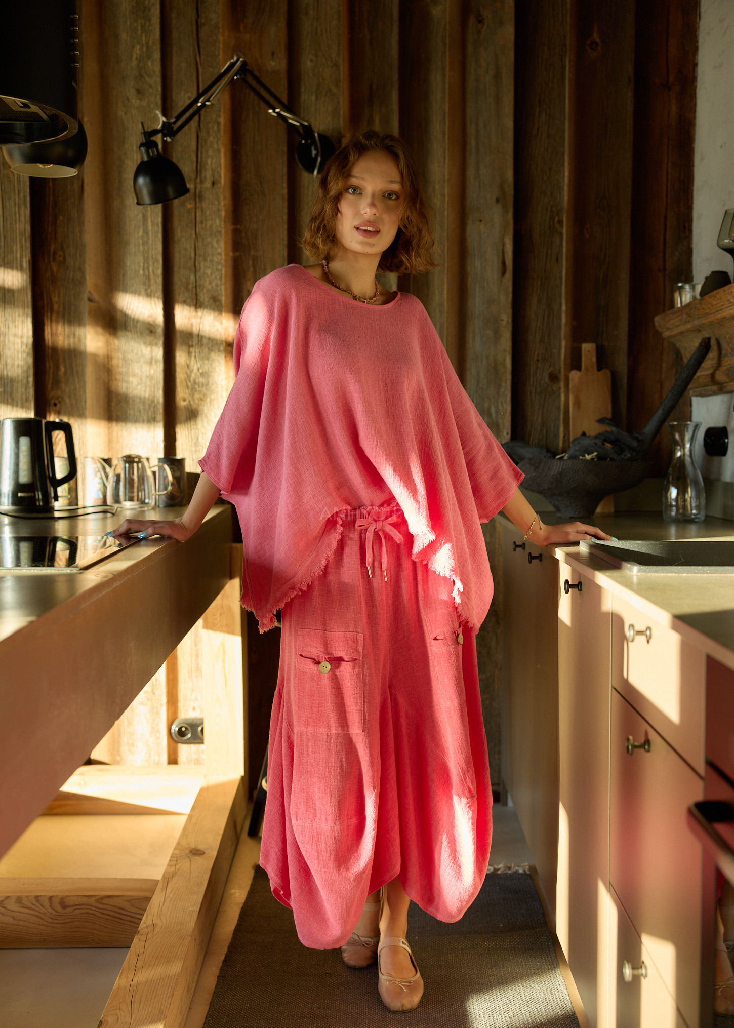 Model wyróżnia się surowym, postrzępionym wykończeniem, które podkreśla jego artystyczny vibe, oraz lekkością tkaniny z dodatkiem lnu, zapewniającą komfort noszenia przez cały dzień. To propozycja dla kobiet ceniących luźny, boho styl i szybkie, efektowne stylizacje bez wysiłku.