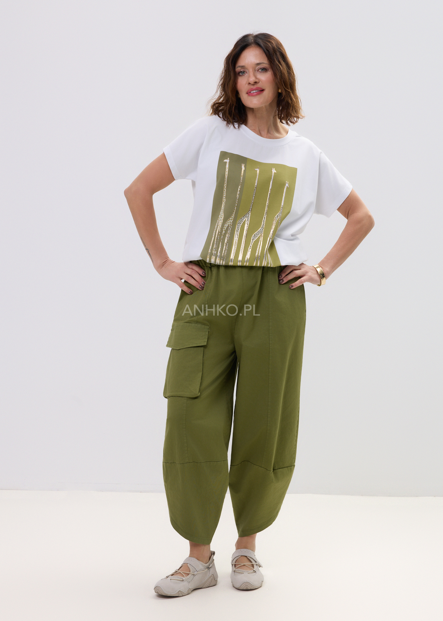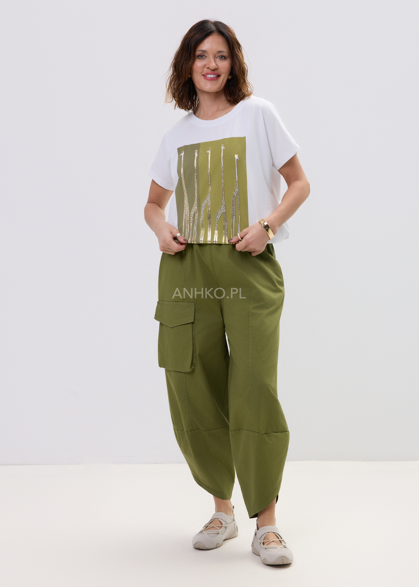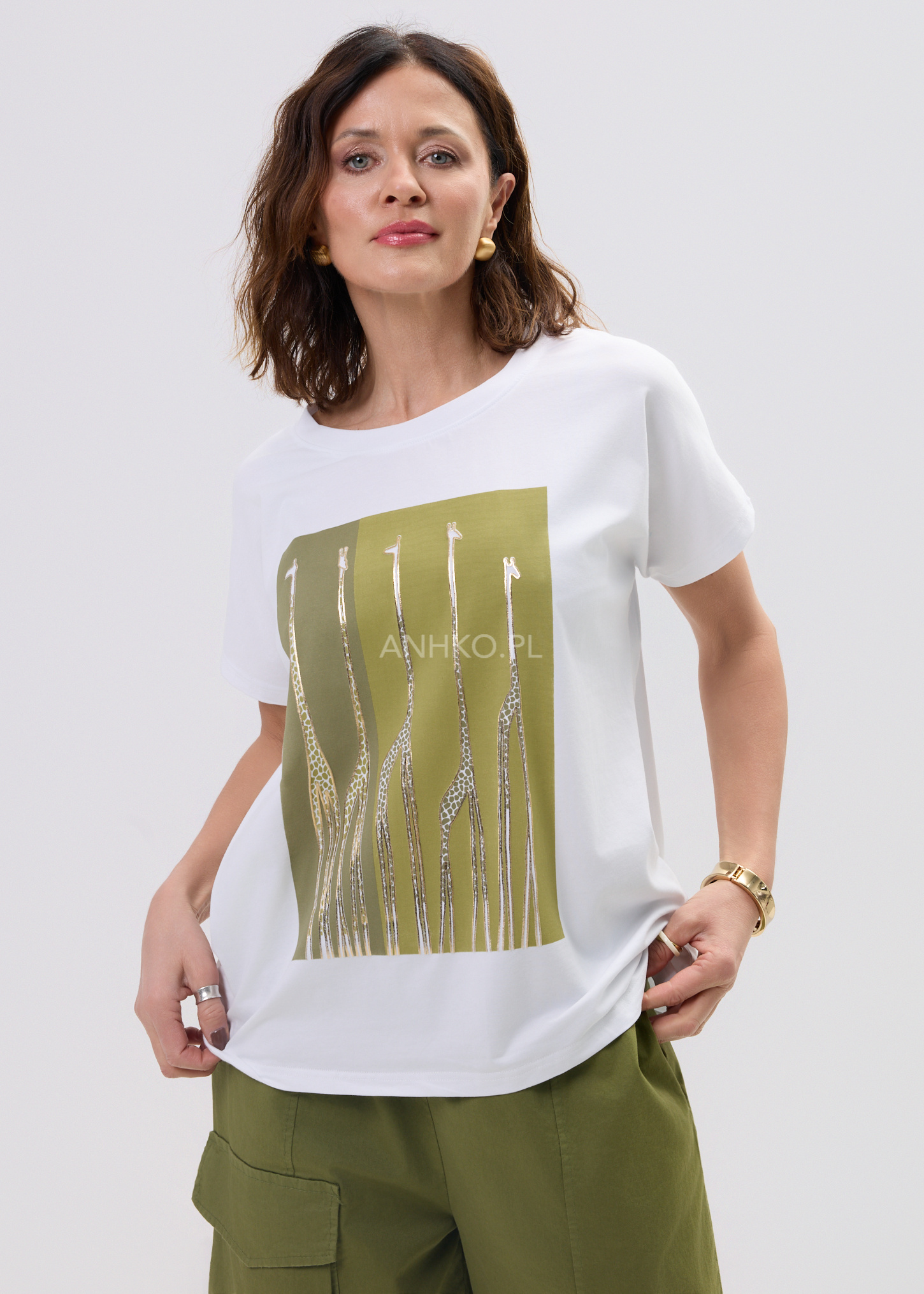 Na froncie uwagę przyciąga wyrazisty nadruk – złote żyrafy na oliwkowym tle, które nadają całości charakteru i wyróżniają look. Okrągły dekolt oraz klasyczny krótki rękaw podkreślają uniwersalność modelu, dzięki czemu z łatwością dopasujesz go do jeansów, spodni materiałowych czy marynarki.