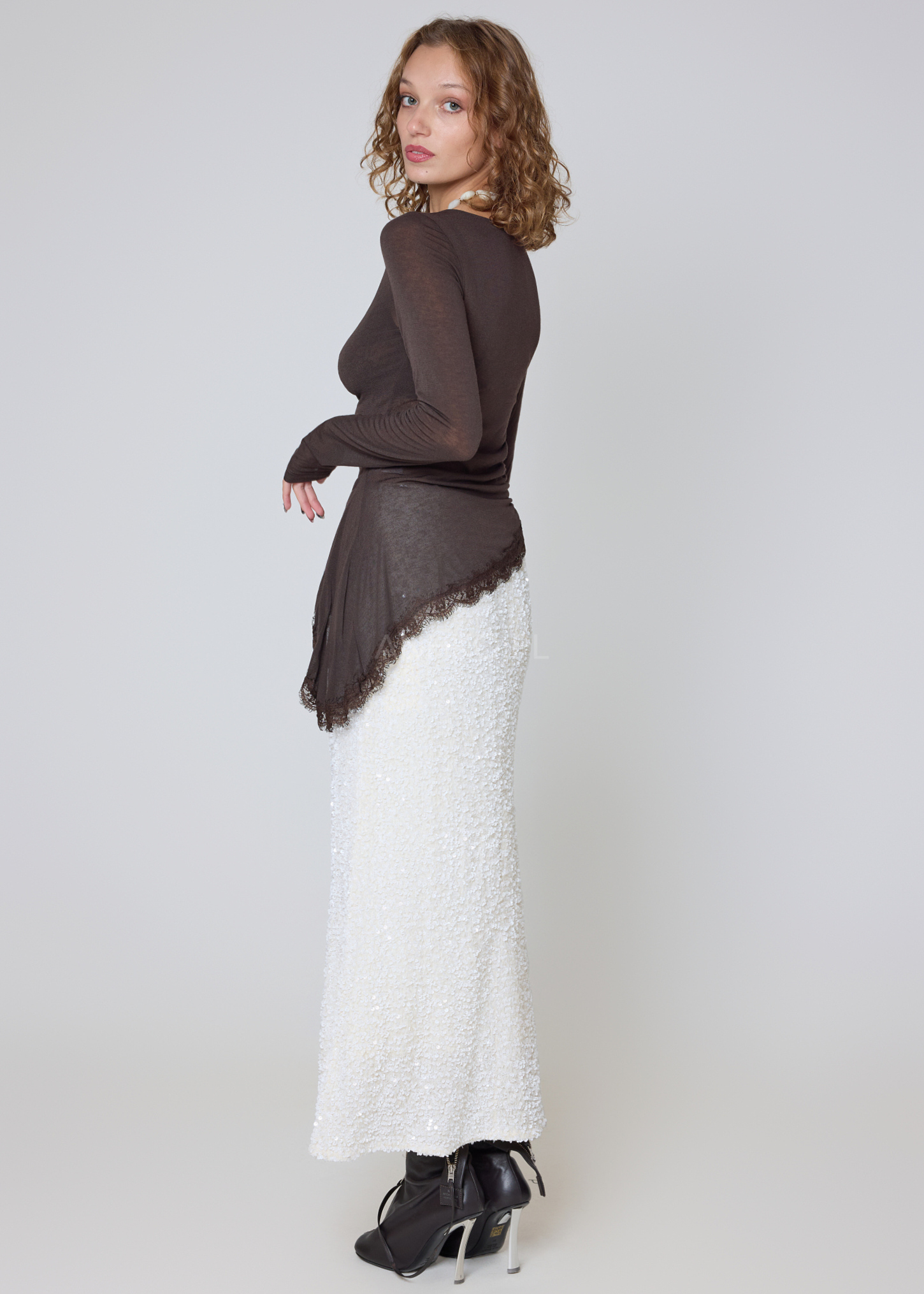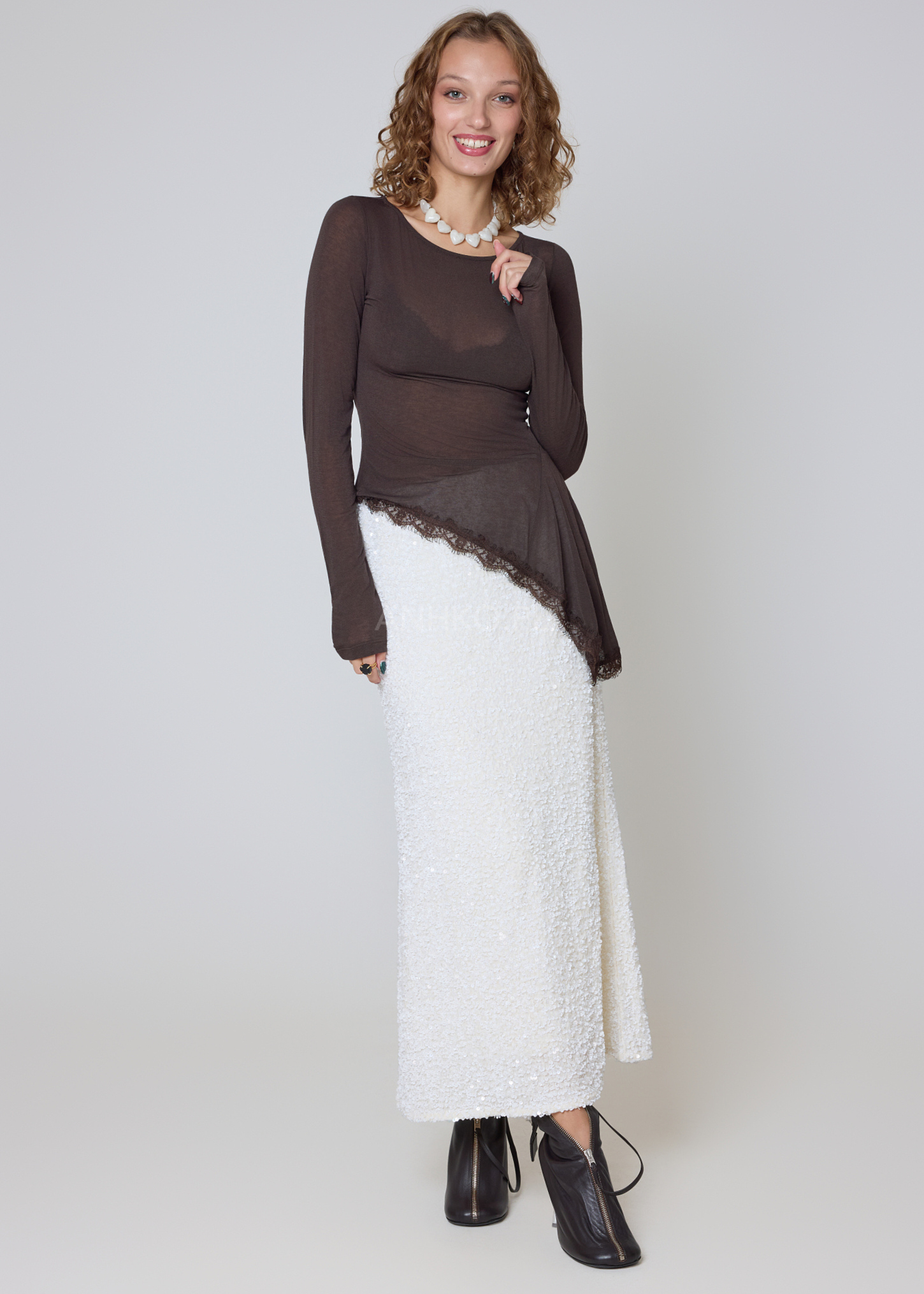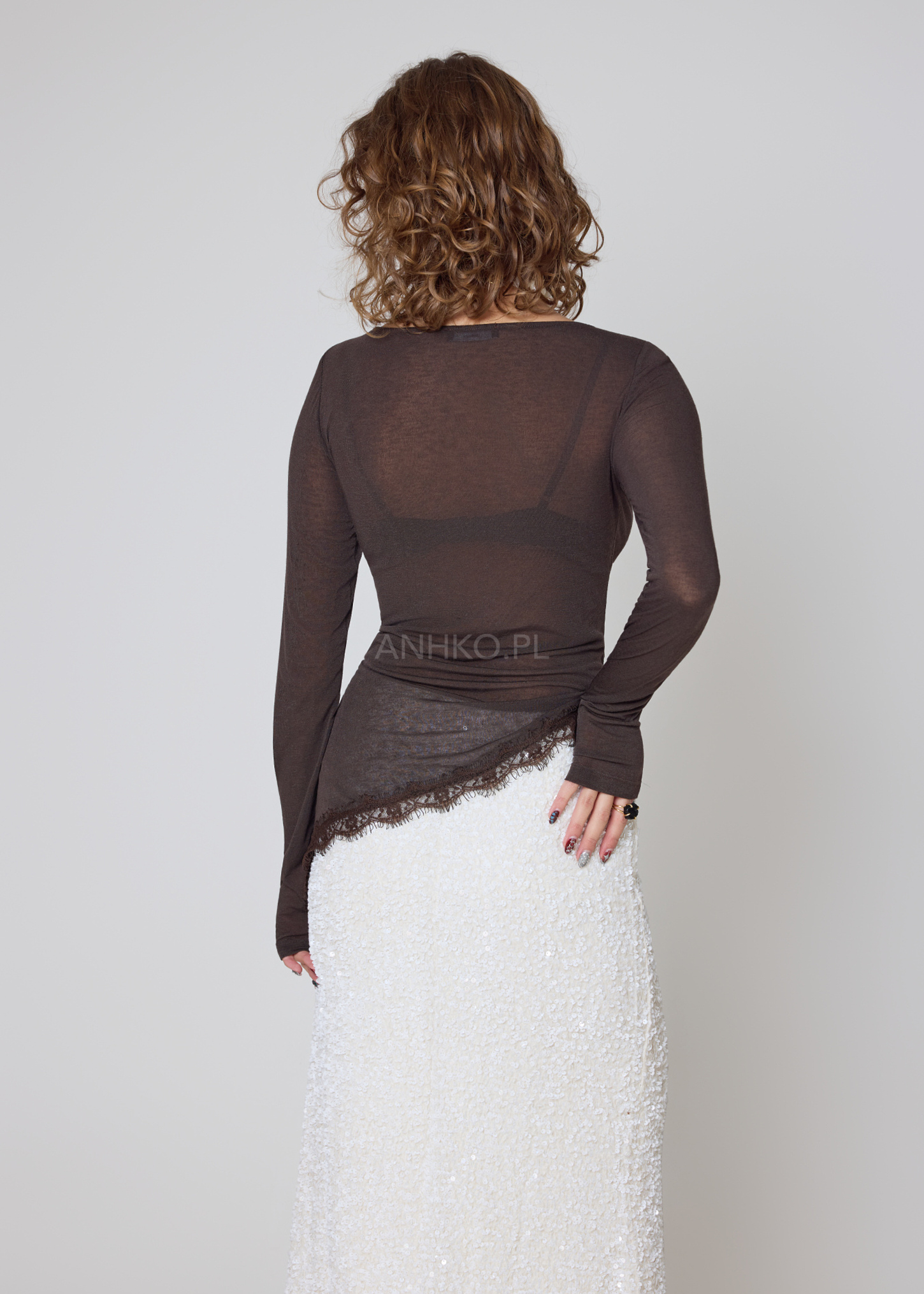 Ta wyjątkowa bluzka o asymetrycznym kroju to doskonałe połączenie lekkości, kobiecości i komfortu. Wykonana z miękkiej, elastycznej tkaniny z dodatkiem kaszmiru, zapewnia przyjemność noszenia przez cały dzień. Subtelna transparentność dodaje jej zmysłowego charakteru, a wykończenie delikatną koronką wzdłuż nieregularnego dołu tworzy unikatowy detal, który wyróżnia ją na tle klasycznych modeli. Bluzka świetnie sprawdzi się w eleganckich stylizacjach z cygaretkami, spodniami z wysokim stanem czy spódnicą, ale równie dobrze podkreśli casualowy look z jeansami. Idealna na wieczorne spotkania, randki, imprezy i sytuacje, w których chcesz wyglądać stylowo, ale z subtelną nutą finezji. Model nie posiada kieszeni ani podszewki.