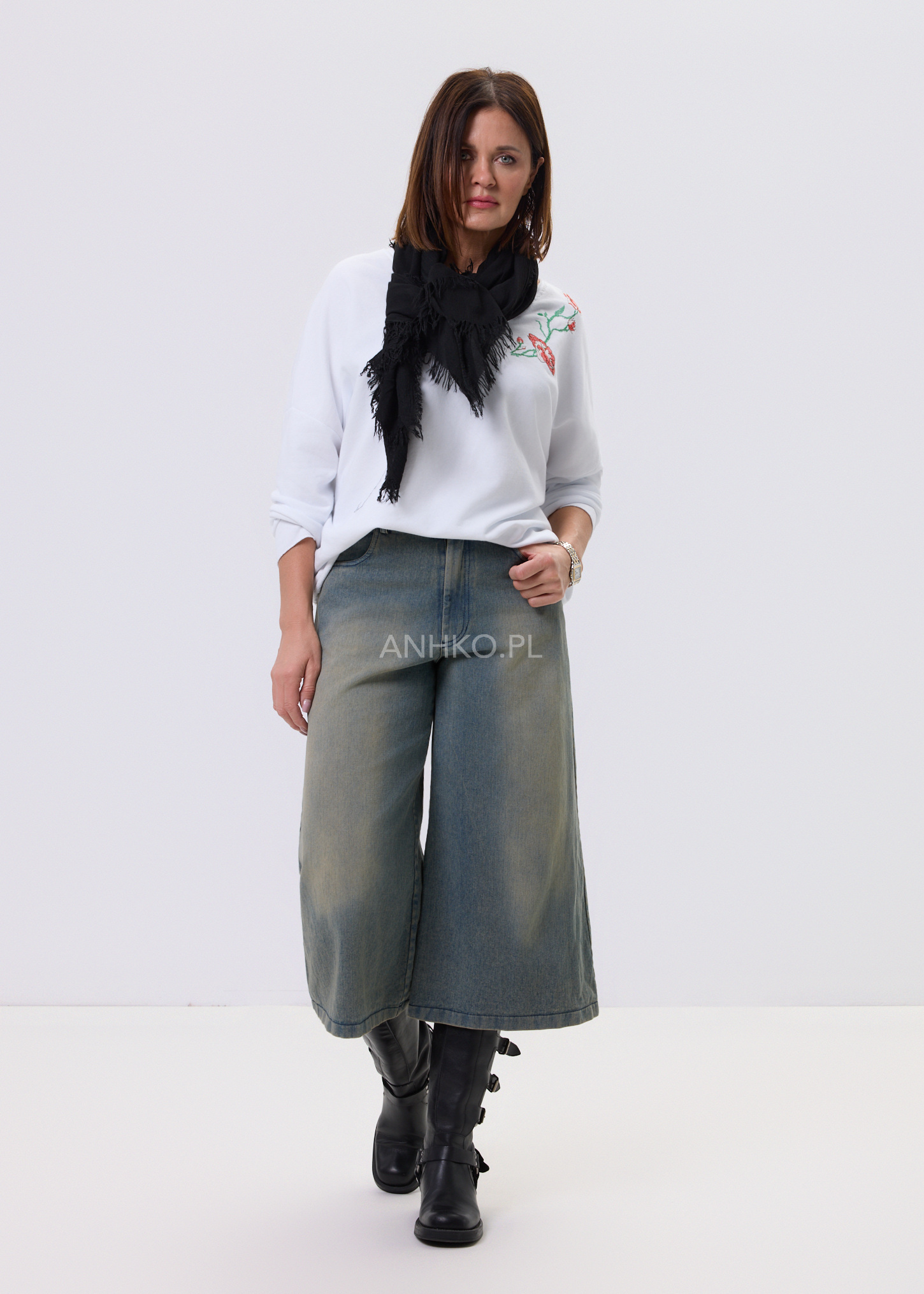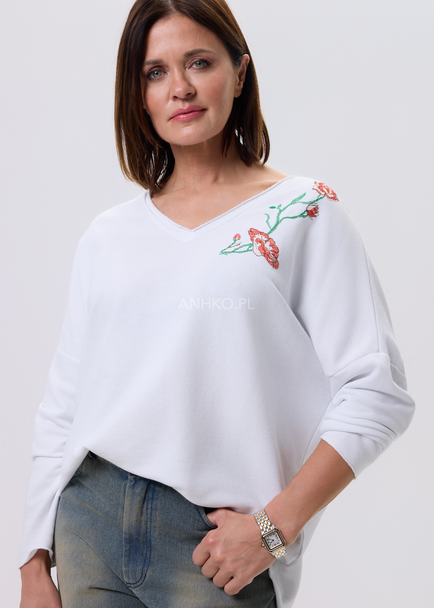Swobodna, wygodna i z wyrazistym detalem – ta bluzka świetnie sprawdzi się w codziennych stylizacjach. Luźny krój z opuszczoną linią ramion nadaje jej lekko nonszalancki charakter, a dekolt w kształcie litery V subtelnie podkreśla szyję. Kwiatowy haft po lewej stronie przy dekolcie dodaje całości kobiecego akcentu i przełamuje klasyczną formę. Lekko dłuższy tył sprawia, że bluzka dobrze układa się na sylwetce i pasuje do wielu fasonów spodni.