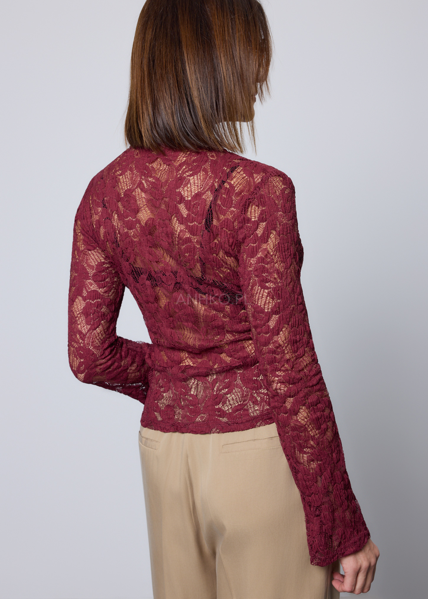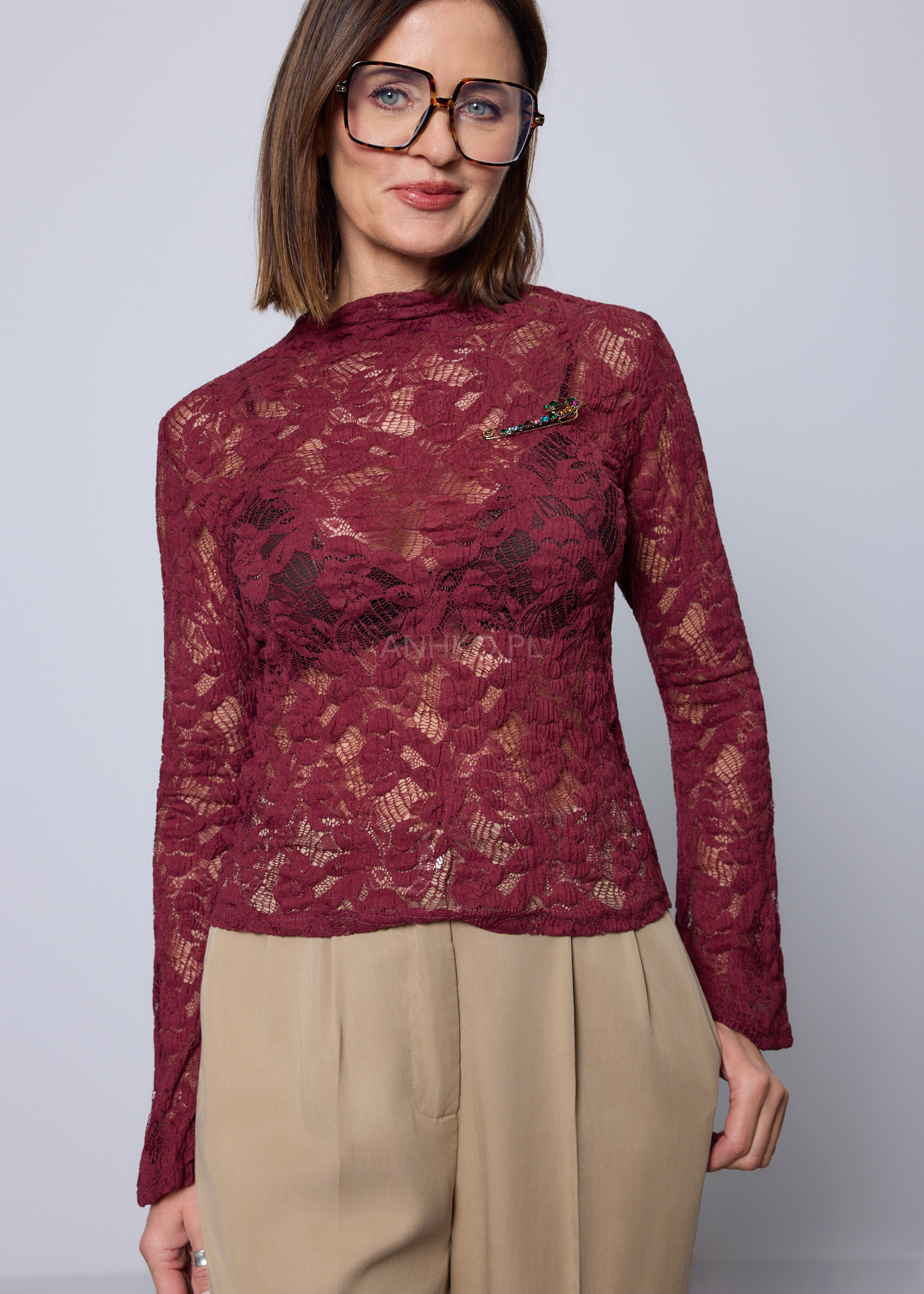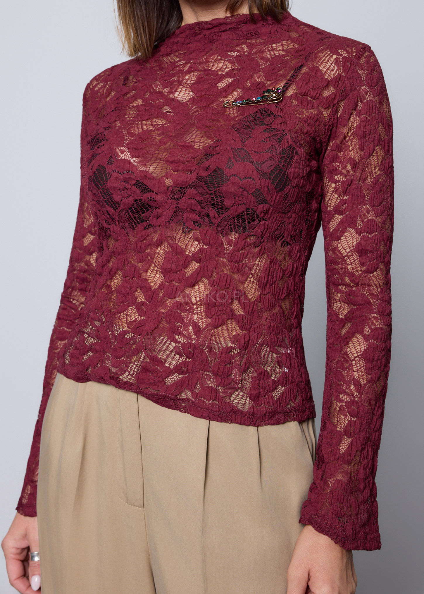 Ta wyjątkowa, koronkowa bluzka została zaprojektowana z myślą o kobietach, które lubią łączyć elegancję z delikatną zmysłowością. Ażur tworzy piękny, półtransparentny efekt, a elastyczna tkanina dopasowuje się do sylwetki, podkreślając jej kształt. Model nie posiada podszewki ani kieszeni, dzięki czemu pozostaje lekki i idealny do warstwowych stylizacji – świetnie wygląda noszony na topie, body lub bralette. Długie rękawy i wąski krój sprawiają, że bluzka idealnie komponuje się zarówno z eleganckimi spódnicami, jak i klasycznymi jeansami. Doskonała na wieczorne spotkania, randki, imprezy oraz wszelkie okazje, w których chcesz dodać stylizacji odrobinę wyrafinowanego charakteru.