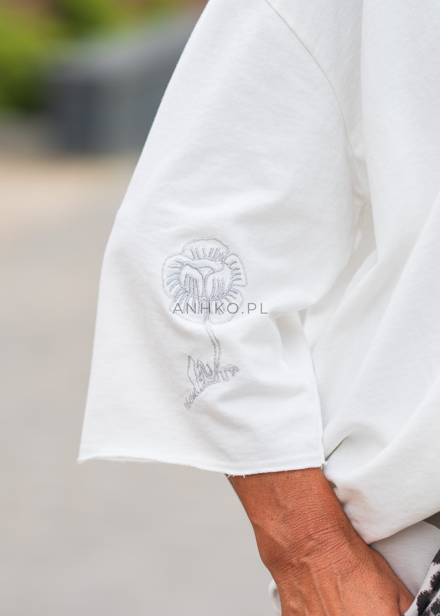 Biała kolorystyka podkreśla świeżość i uniwersalność, a delikatny haft na rękawie dodaje całości wyjątkowego detalu. Miękka dzianina, szerokie rękawy i komfortowy krój sprawiają, że to idealna baza do codziennych zestawów – od casualowych po bardziej dopracowane, warstwowe looki.