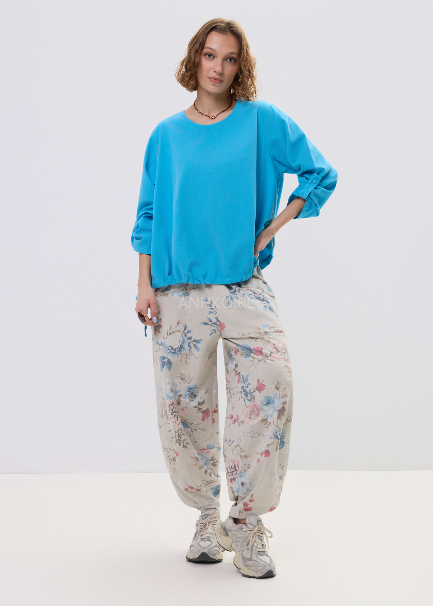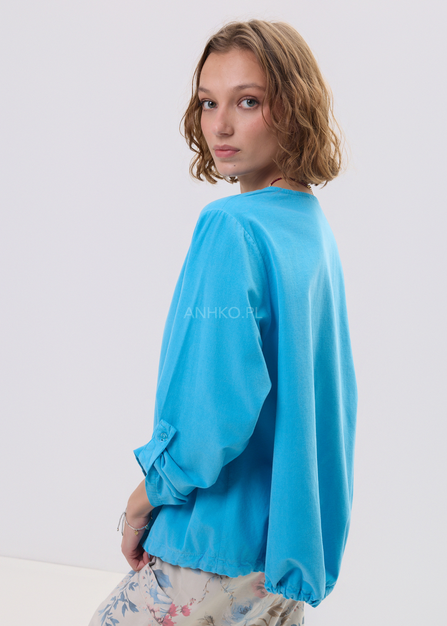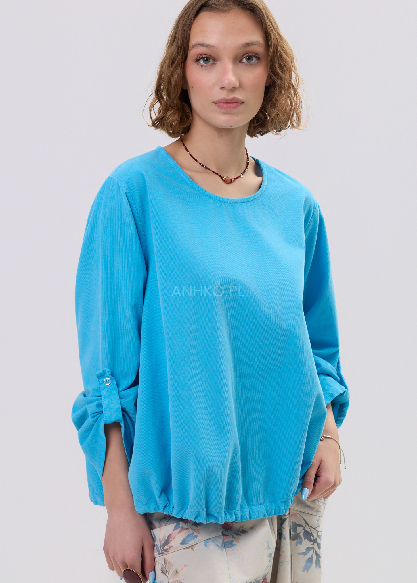 Głęboki baby blue przyciąga spojrzenia i pięknie komponuje się zarówno z printami, jak i minimalistycznymi dołami. Okrągły dekolt podkreśla linię szyi, a możliwość regulacji dołu sprawia, że bluzka świetnie wygląda zarówno puszczona luźno, jak i lekko podciągnięta. To baza, która odnajdzie się w stylizacjach casualowych, miejskich i bardziej eleganckich – zawsze z efektem „wow” bez wysiłku.