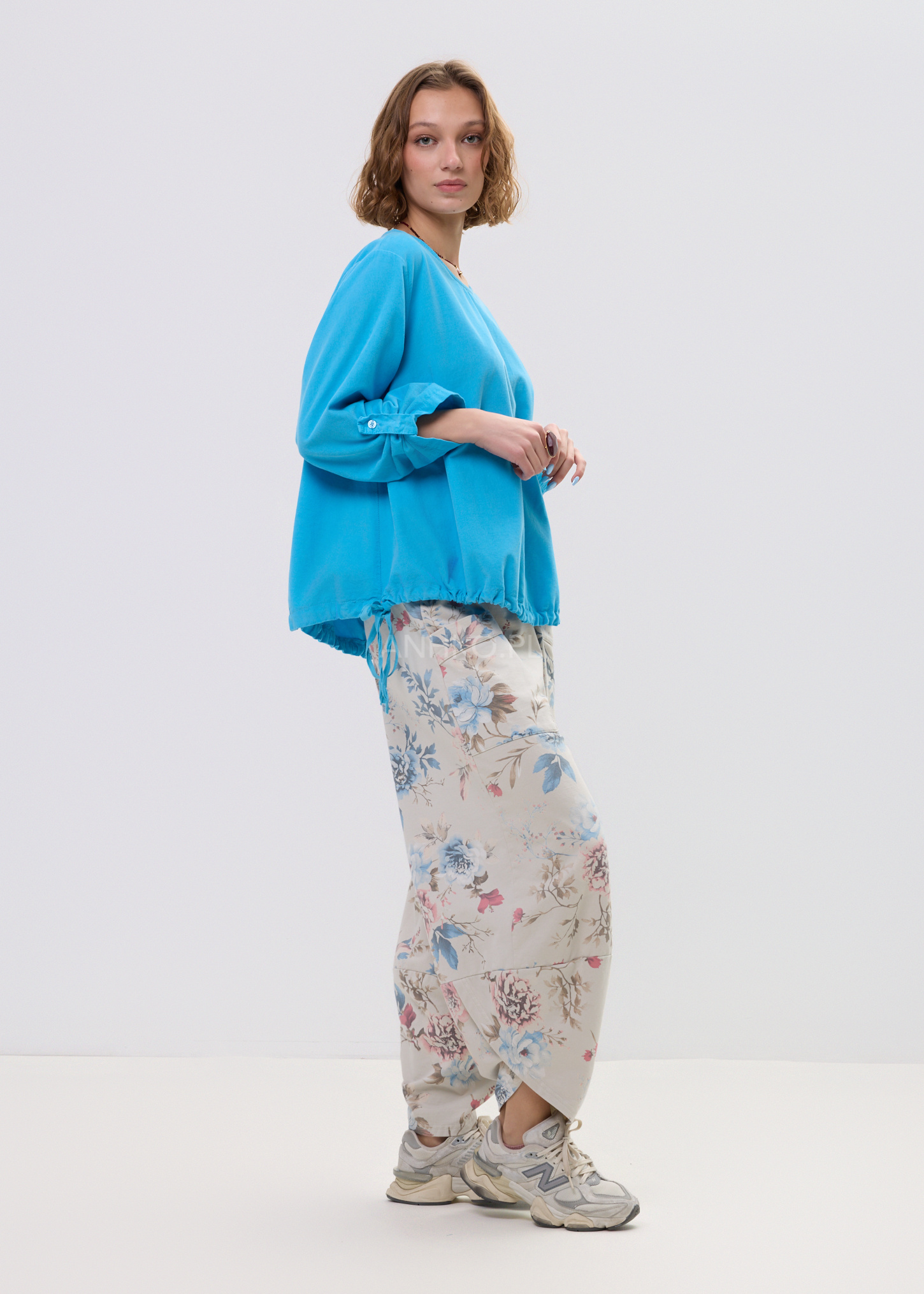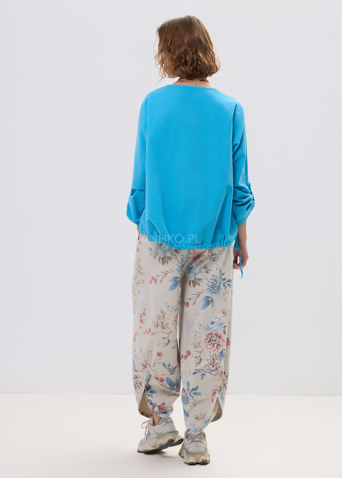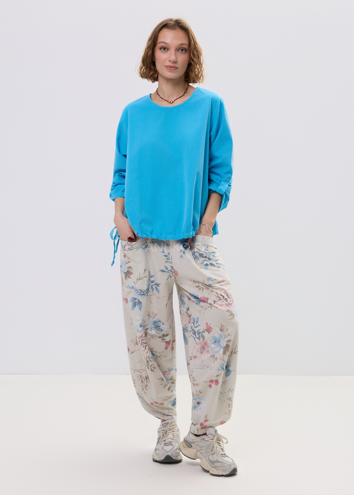Głęboki baby blue przyciąga spojrzenia i pięknie komponuje się zarówno z printami, jak i minimalistycznymi dołami. Okrągły dekolt podkreśla linię szyi, a możliwość regulacji dołu sprawia, że bluzka świetnie wygląda zarówno puszczona luźno, jak i lekko podciągnięta. To baza, która odnajdzie się w stylizacjach casualowych, miejskich i bardziej eleganckich – zawsze z efektem „wow” bez wysiłku.