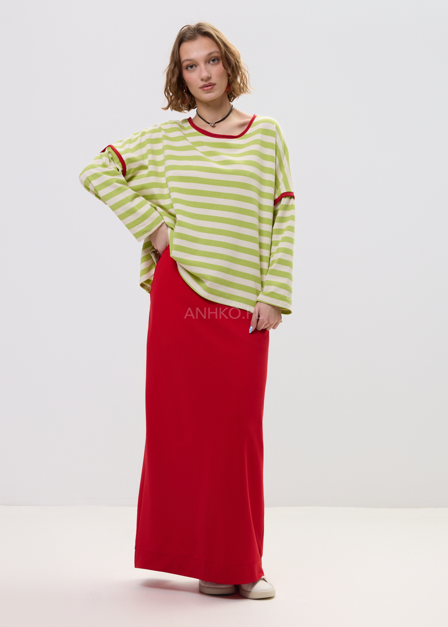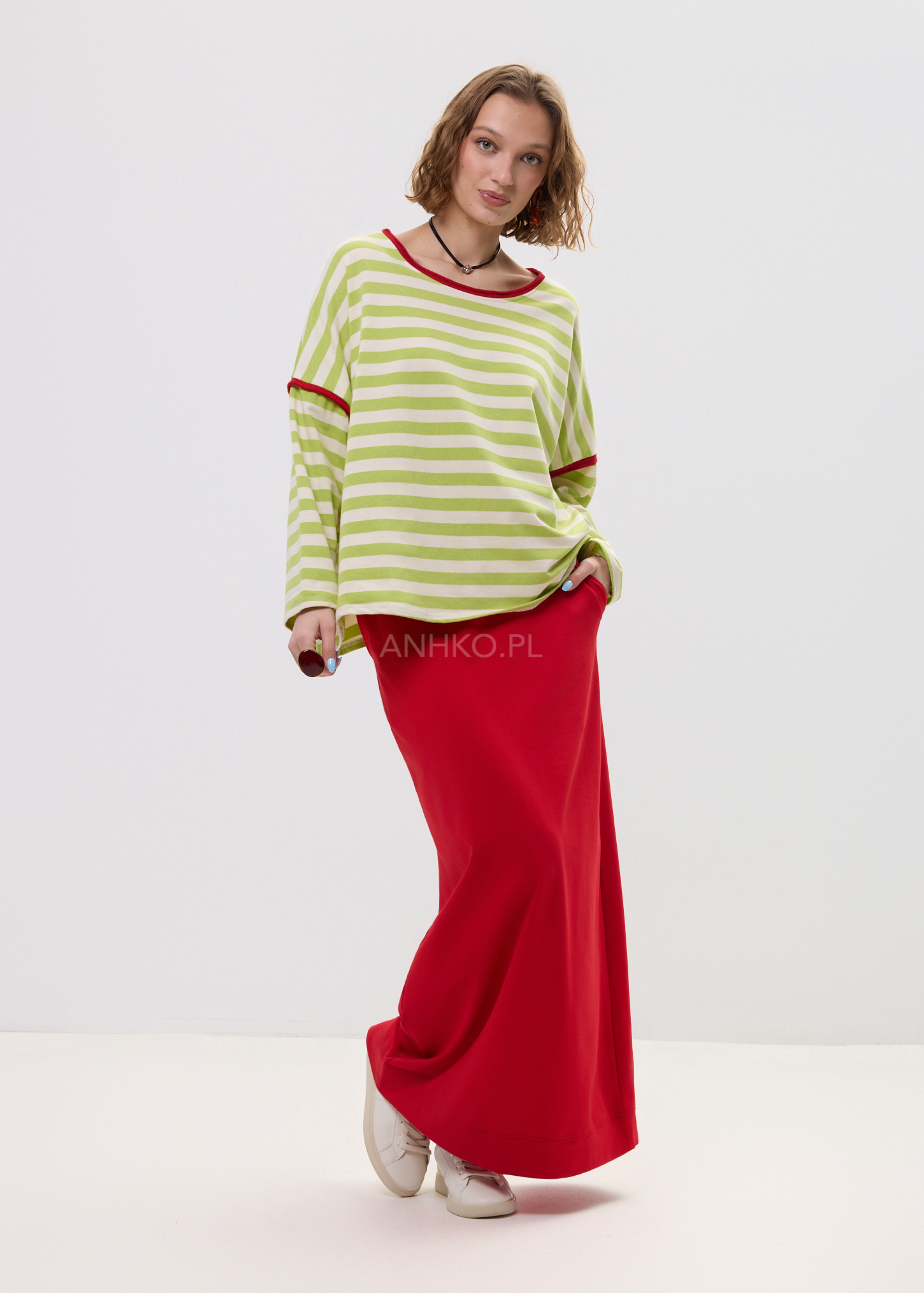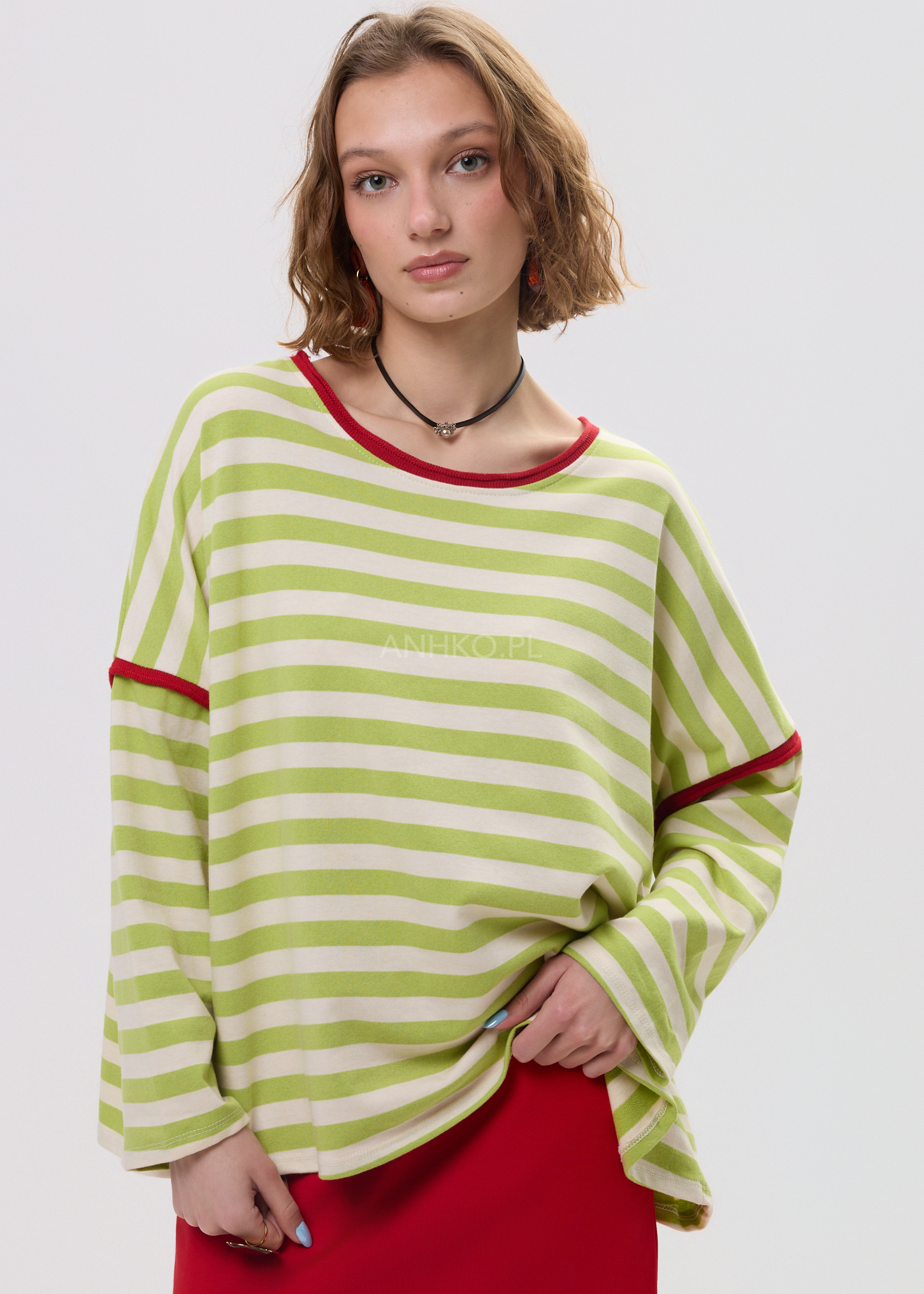 Ta bluza w paski o swobodnym kroju miękko układa się na sylwetce, tworząc nonszalancki, miejski efekt. limonki-ecru poziome pasy optycznie porządkują proporcje, a kontrastowa, czerwoną lamówka przy dekolcie i rękawach dodaje całości energii. Luźna linia ramion i lekko rozszerzany dół zapewniają komfort oraz naturalny ruch tkaniny.