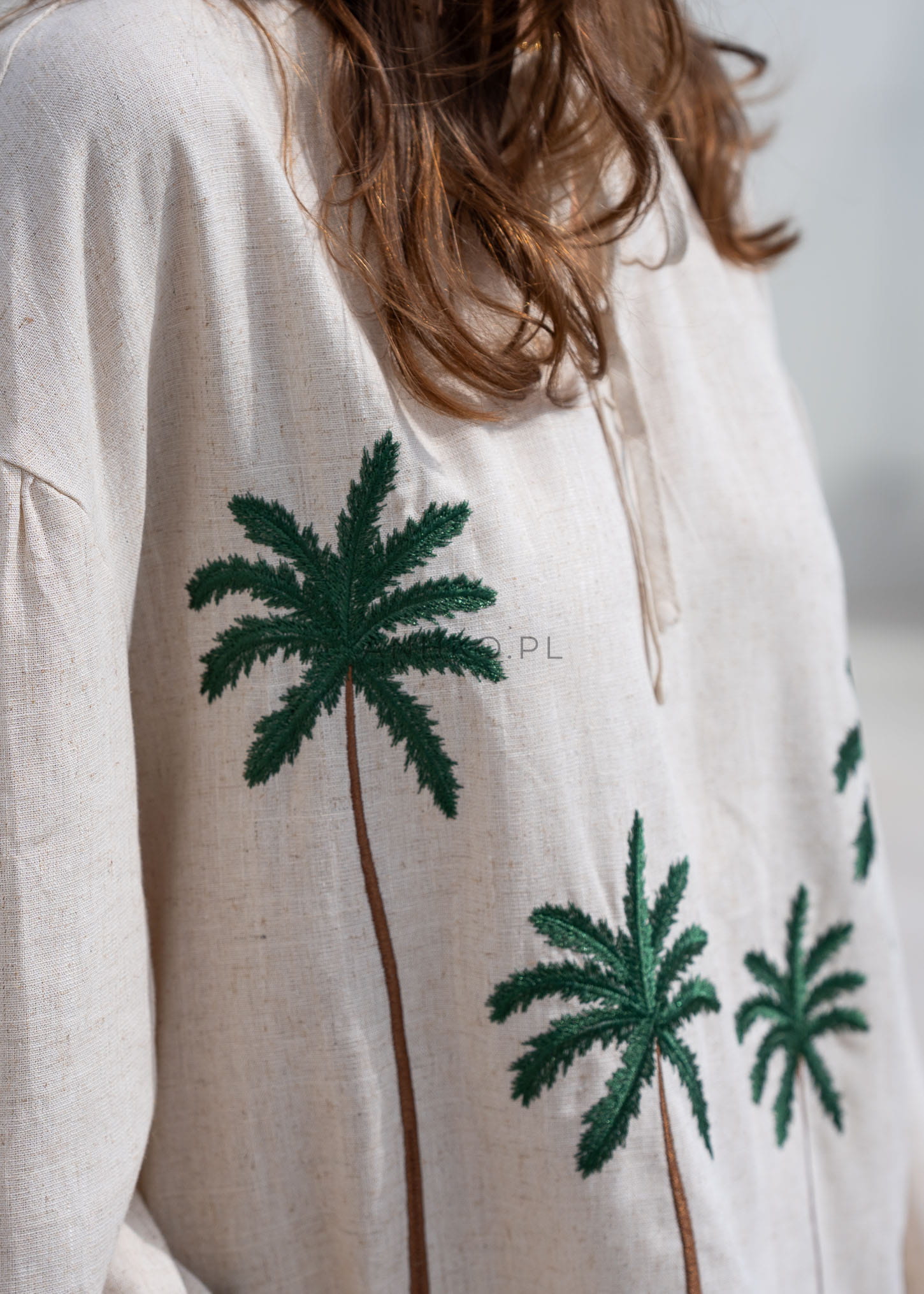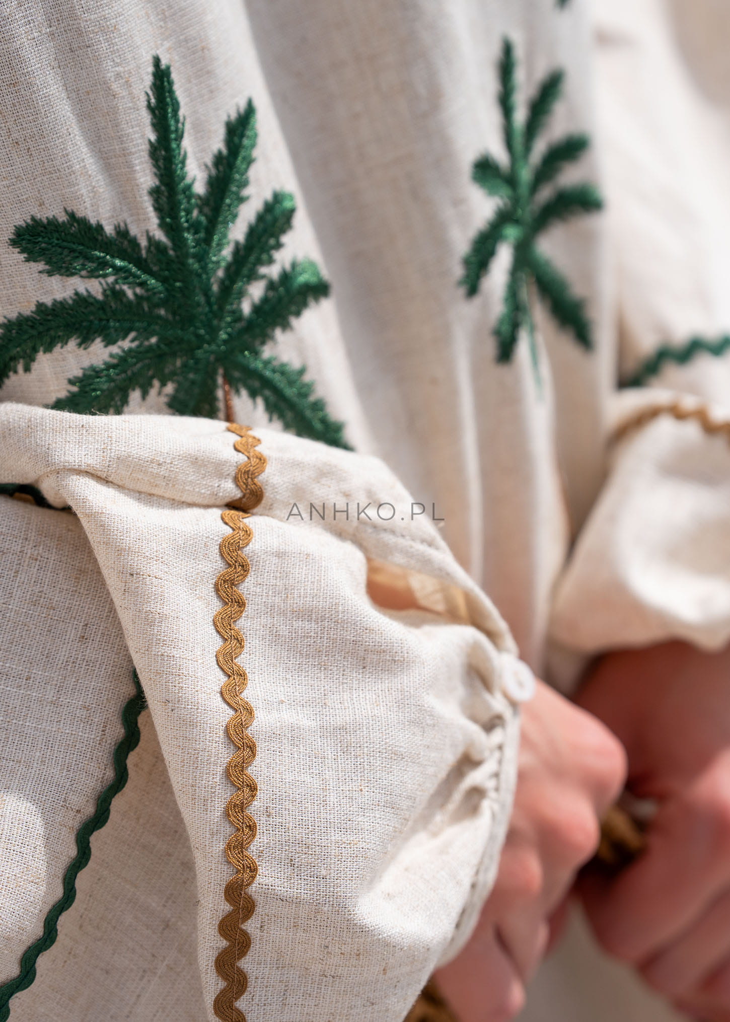 To lekka, luźna bluzka wykonana z przyjemnej mieszanki lnu i wiskozy. Czarna tkanina ozdobiona jest efektownym haftem przedstawiającym zielone palmy, które nadają jej wyjątkowo wakacyjny charakter. Luźny krój oraz długie rękawy zakończone gumką zapewniają komfort i swobodę ruchów. Idealna na letnie spacery, festiwale, wakacje czy codzienne wyjścia w ciepłe dni. Świetnie komponuje się z jeansowymi szortami, lnianymi spodniami czy spódnicą maxi. To doskonały wybór dla kobiet ceniących lekkość, wygodę i styl z nutą egzotyki.