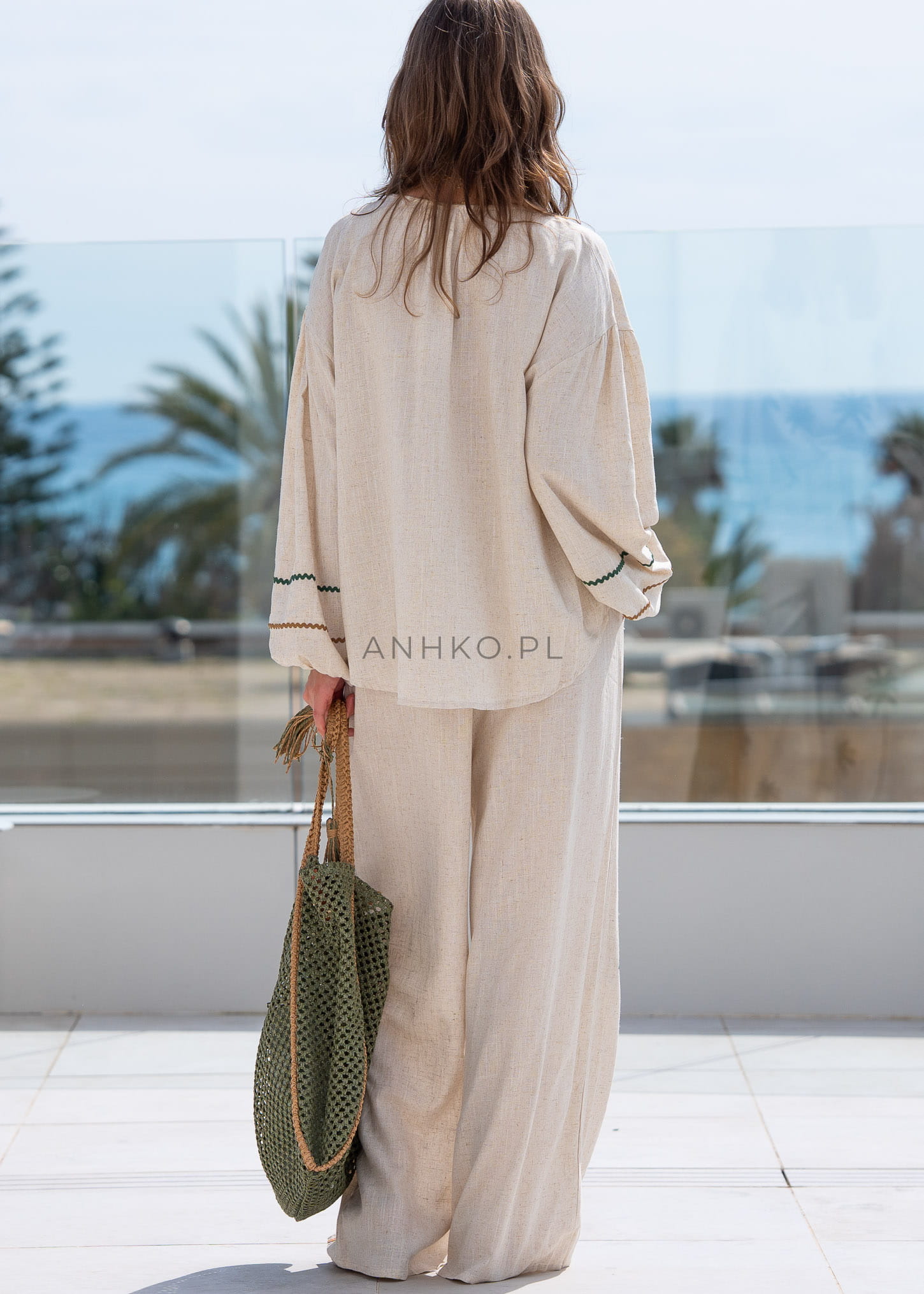 Spodnie z Dodatkiem Lnu Palmo Kremowe - Lekkie, kremowe spodnie z haftem palm – doskonałe na letnie dni, plażowe spacery i codzienne stylizacje w stylu boho.
