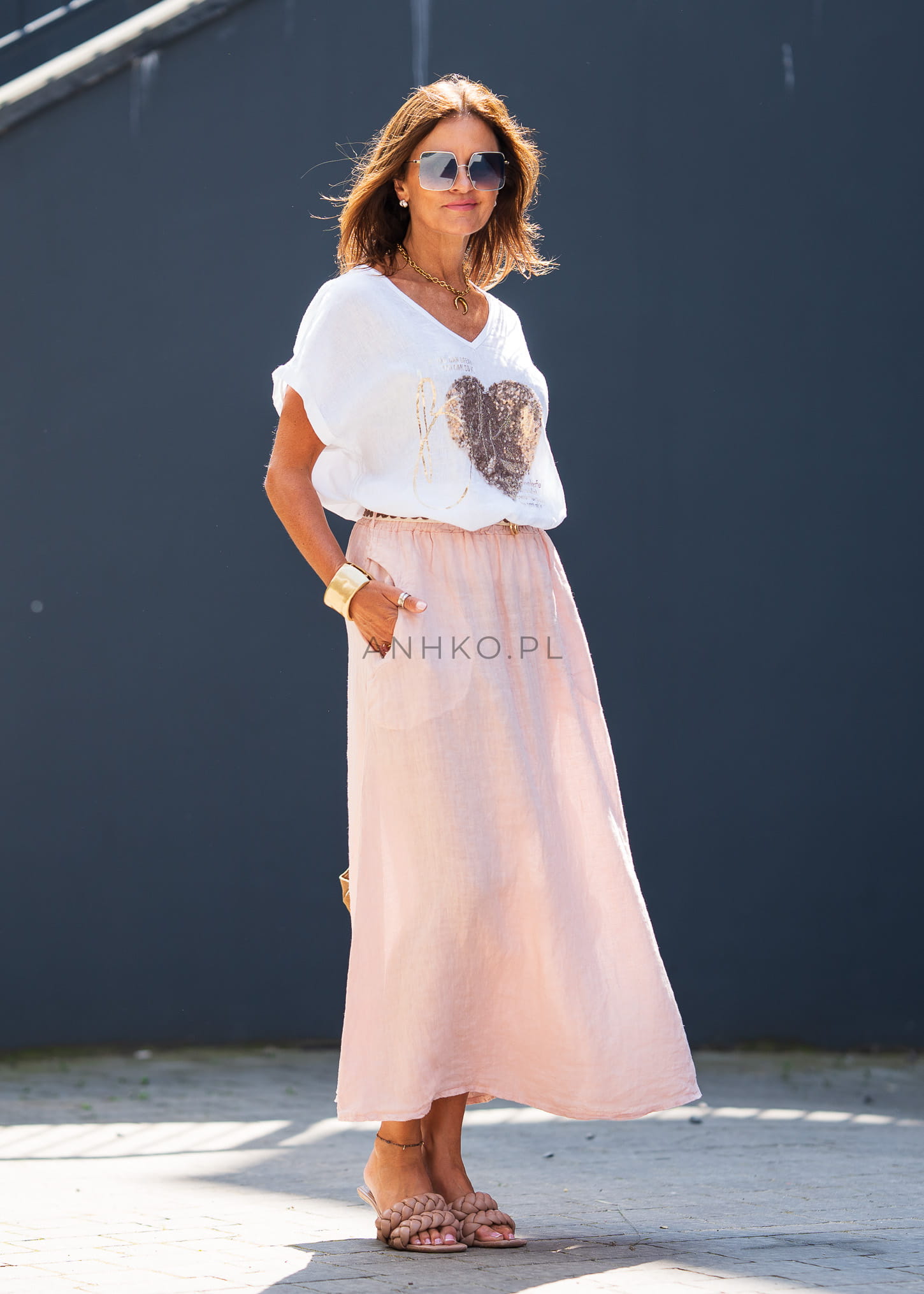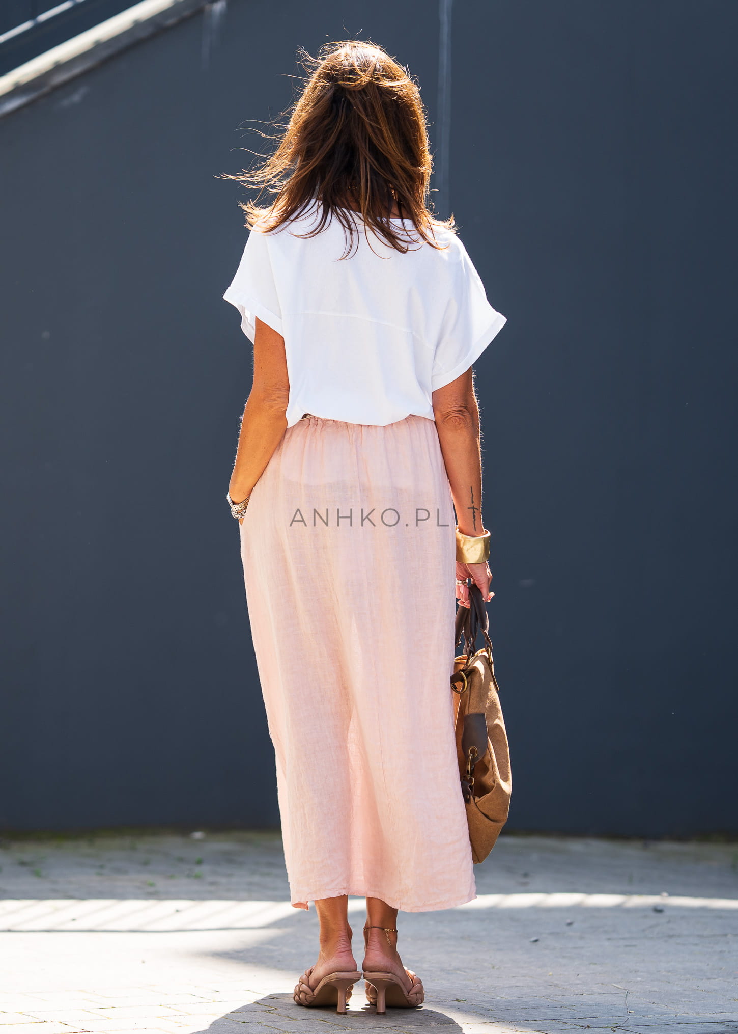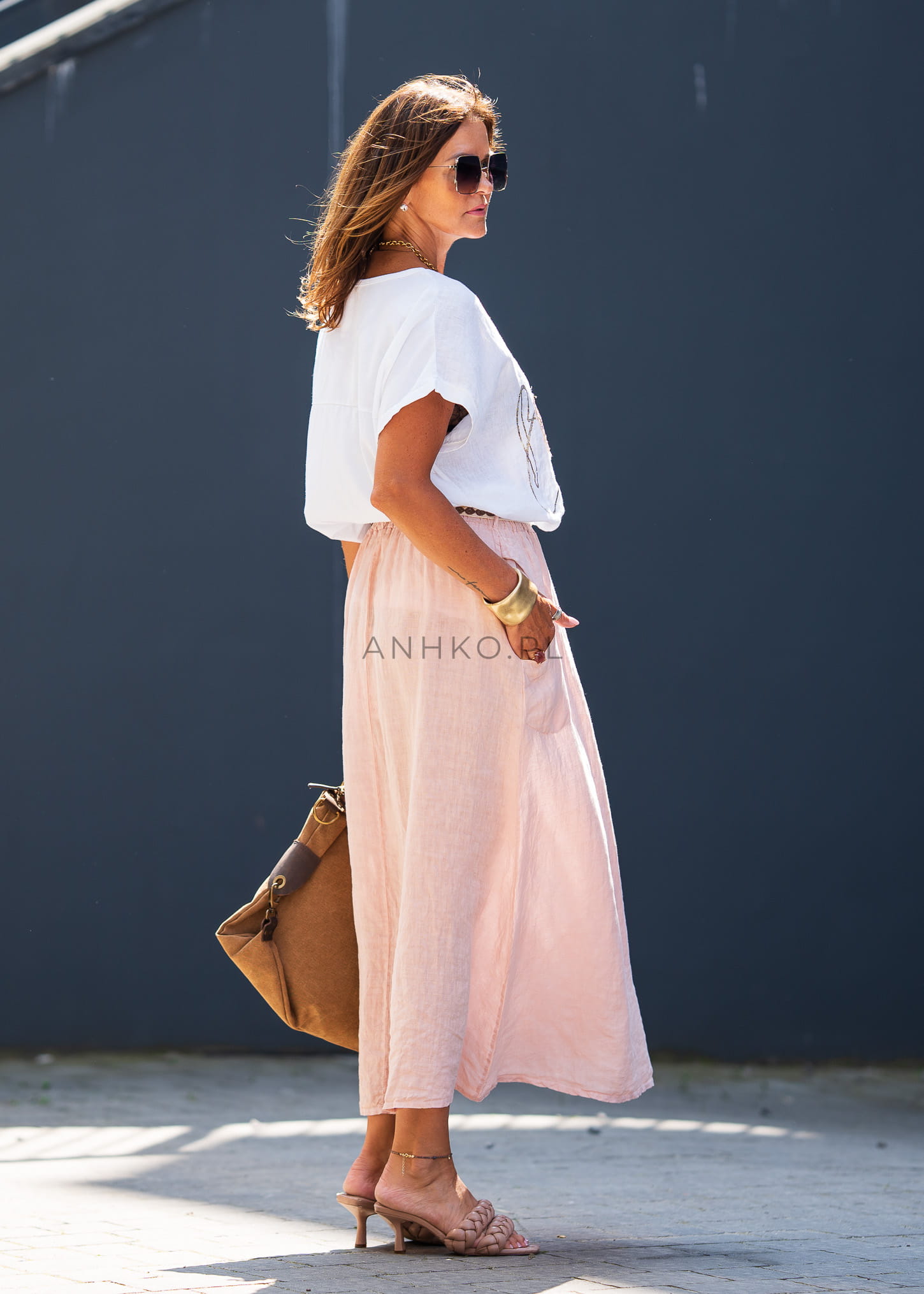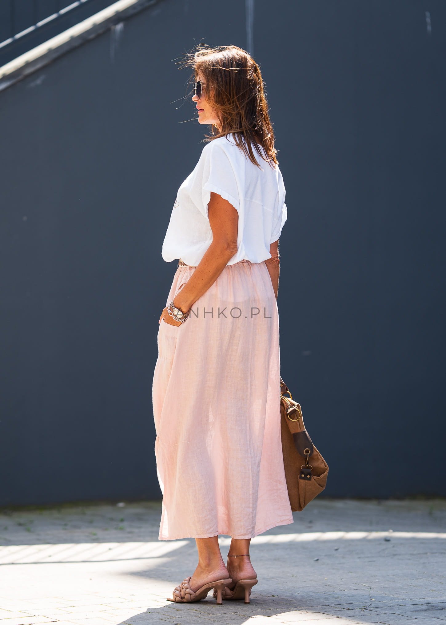 Spódnica Lniana Ricotta Jasnoróżowa - Letnia, lekka spódnica maxi z naturalnego lnu w pastelowym różu . Zwiewna forma i ozdobny pasek z haftem dodają jej boho charakteru. Idealna na ciepłe dni i stylizacje wakacyjne.