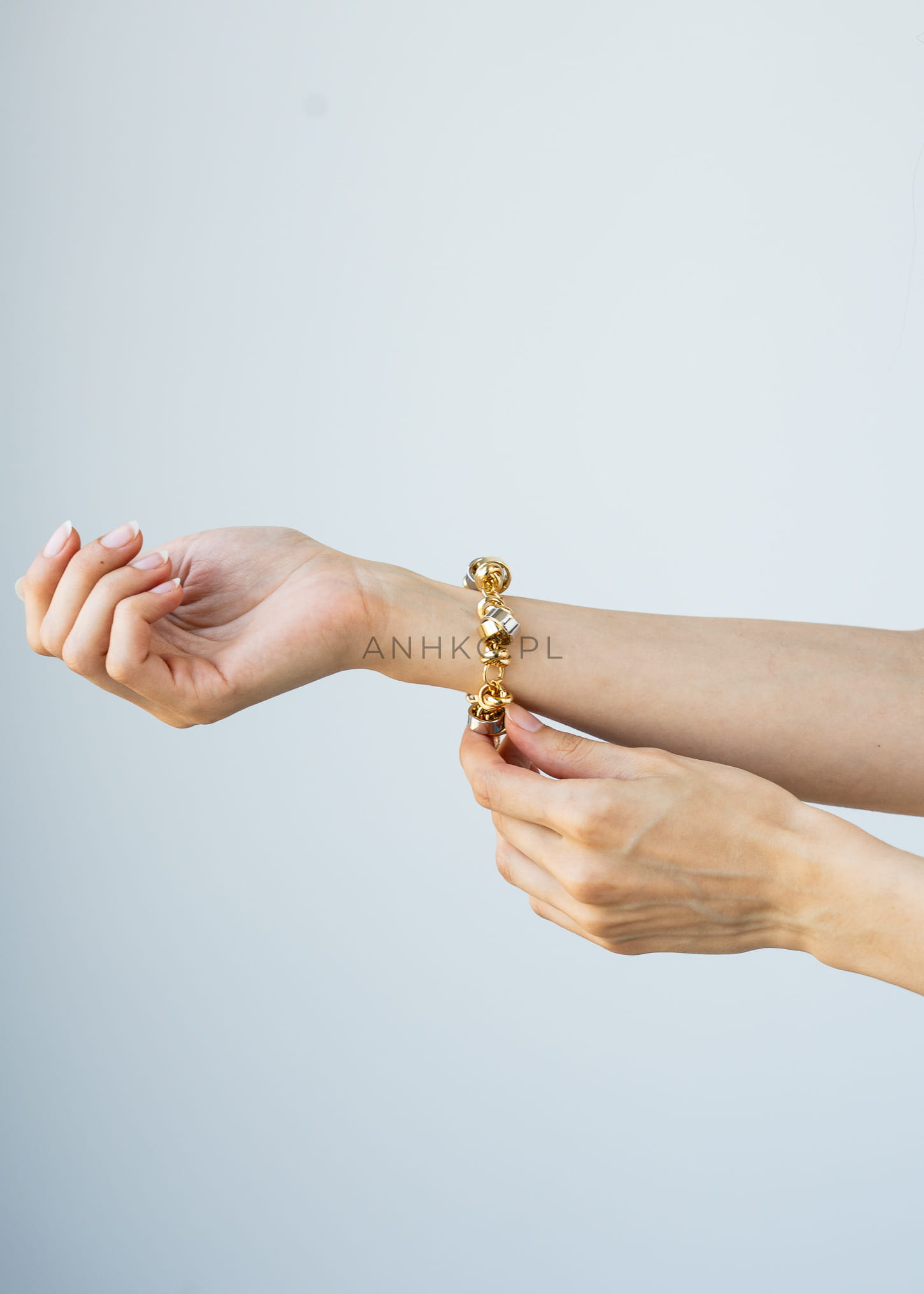 Bransoleta to hołd dla geometrycznych kształtów i kontrastów metali. Pośrodku znajdują się przesuwne dyski o różnych średnicach, plecione z drobnymi ogniwkami, które razem tworzą efekt trójwymiarowej kompozycji. Całość osadzono na grubszej, pozłacanej łańcuchowej podstawie z możliwością regulacji długości za pomocą lobster clasp. Świetnie uzupełni zarówno rockowy look z skórzaną ramoneską, jak i elegancką sukienkę koktajlową, dodając nowoczesnego charakteru. Mieszanka złota i srebra umożliwia łączenie z różną biżuterią, zapewniając uniwersalność w każdej stylizacji.