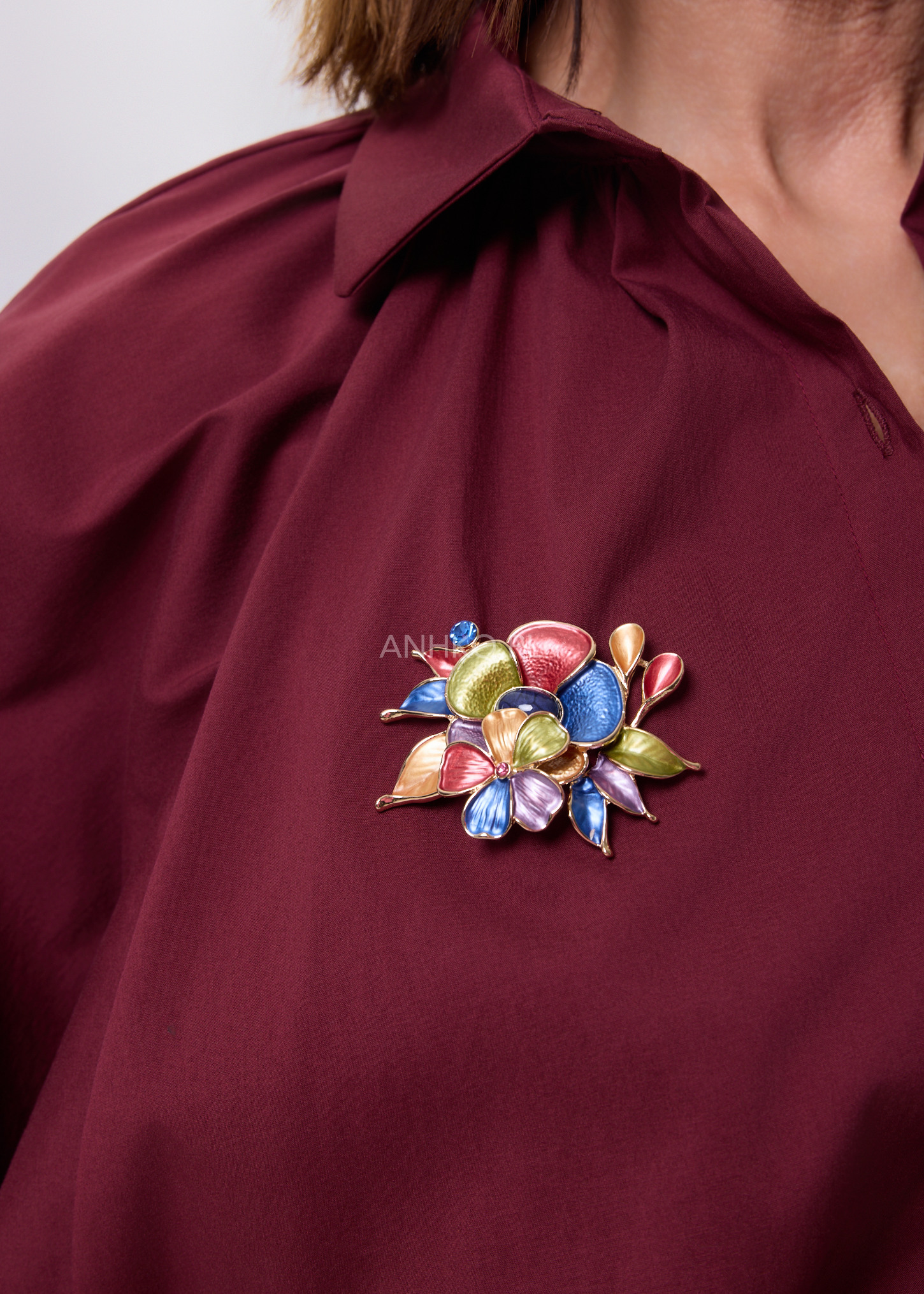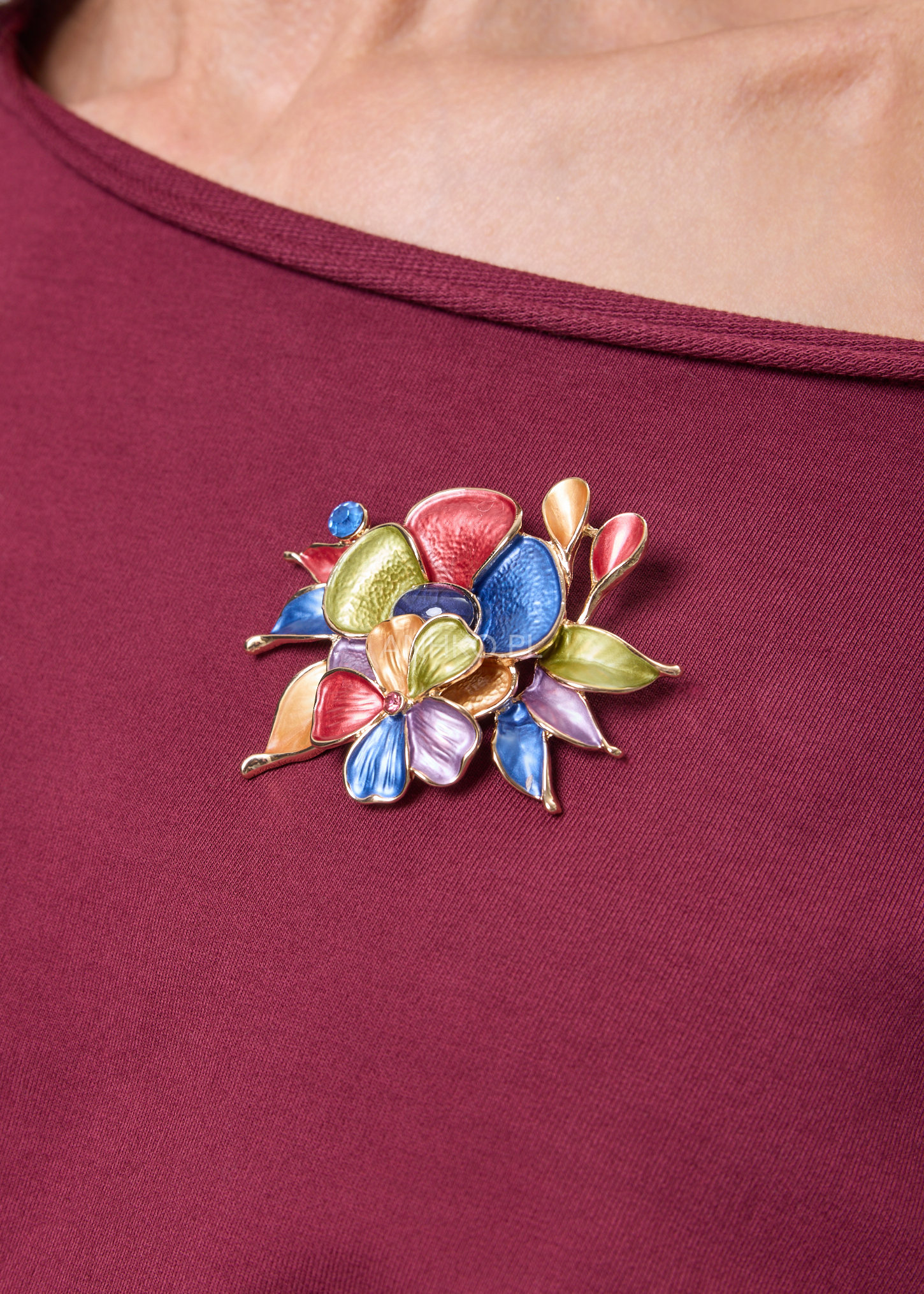 Wyjątkowa magnetyczna broszka inspirowana motywem kwiatów, wykonana z metalu w złotym odcieniu i ozdobiona wielobarwnymi, emaliowanymi elementami. Kompozycja płatków w odcieniach niebieskiego, czerwieni, zieleni, fioletu, żółci i różu nadaje jej radosnego, artystycznego charakteru. Centralny, połyskujący detal dodaje elegancji i przyciąga wzrok. Magnetyczne zapięcie pozwala na szybkie przypinanie bez przekłuwania materiału, dzięki czemu broszka jest bezpieczna dla delikatnych tkanin. Idealnie pasuje do marynarek, płaszczy, swetrów, sukienek, apaszek oraz torebek. Sprawdzi się na co dzień, do pracy, na spotkania, przyjęcia oraz jako oryginalny prezent