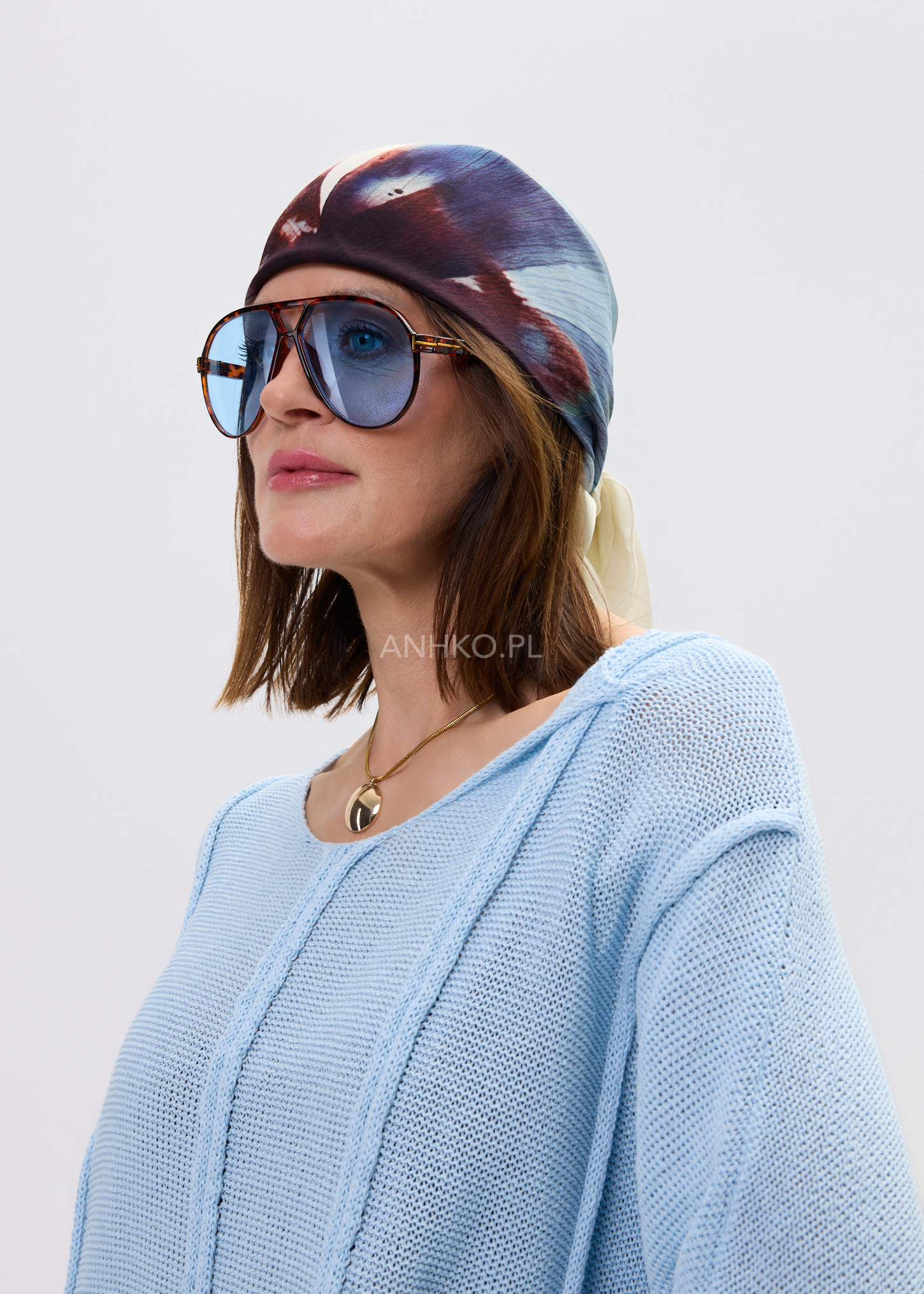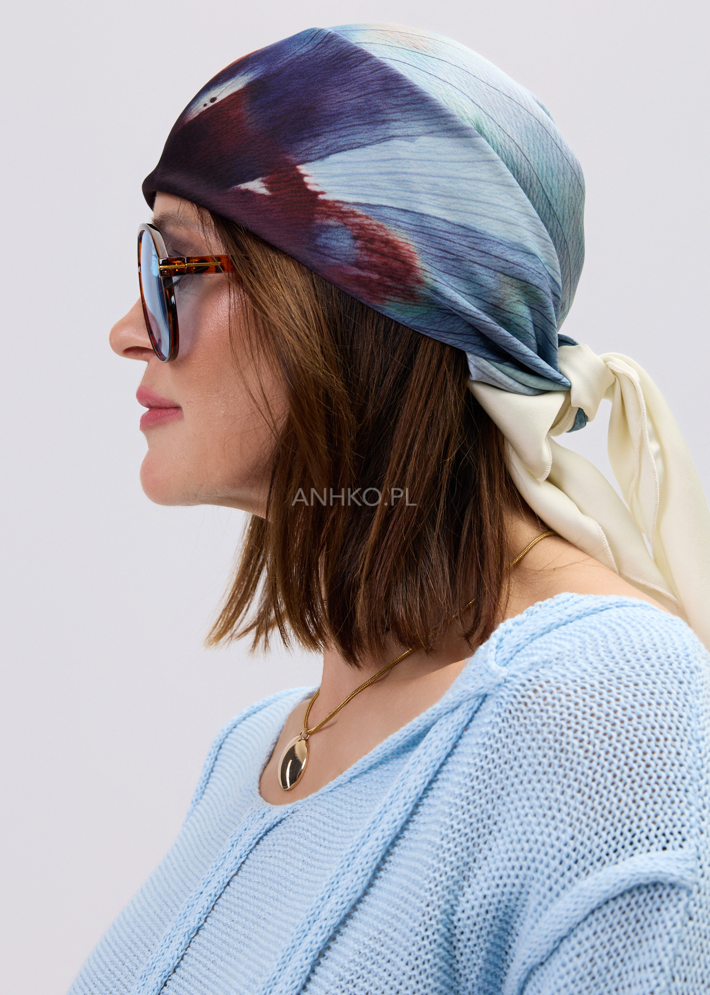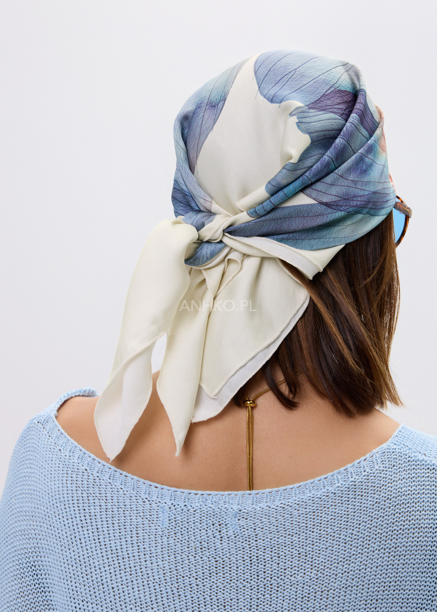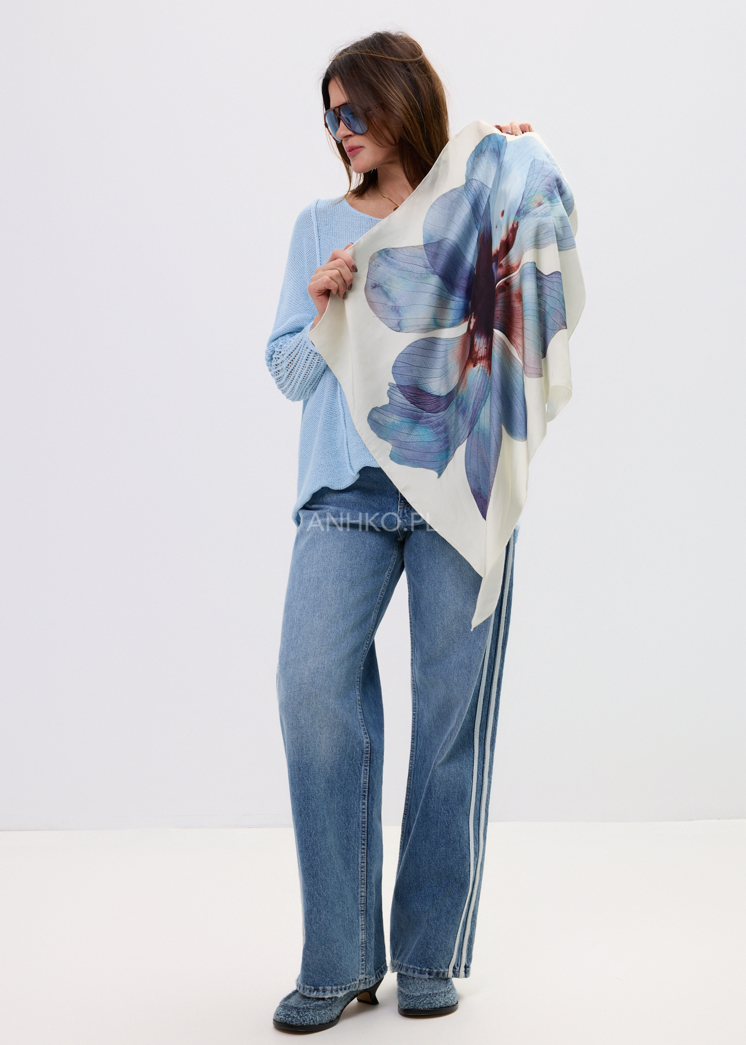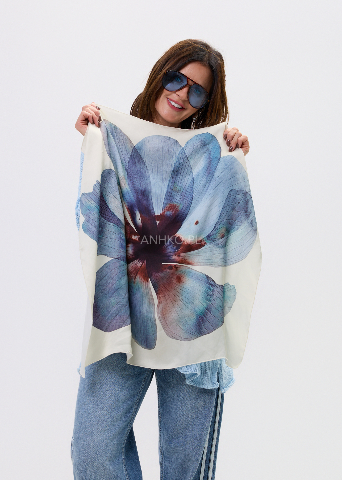 Stylowy dodatek, który nadaje charakteru nawet najprostszej stylizacji. Duży, malarski motyw kwiatu w odcieniach niebieskiego, granatu i subtelnego bordo tworzy efektowną, nowoczesną kompozycję na jasnym tle. Delikatna, miękka tkanina pięknie się układa, pozwalając nosić chustę na wiele sposobów — klasycznie na szyi, luźno narzuconą na ramiona, jako ozdobę torebki lub element letniej stylizacji. Sprawdzi się zarówno na co dzień, do koszul, swetrów i marynarek, jak i na bardziej eleganckie okazje, uzupełniając sukienki czy monochromatyczne zestawy. To ponadczasowy akcent, który podkreśla indywidualny styl.