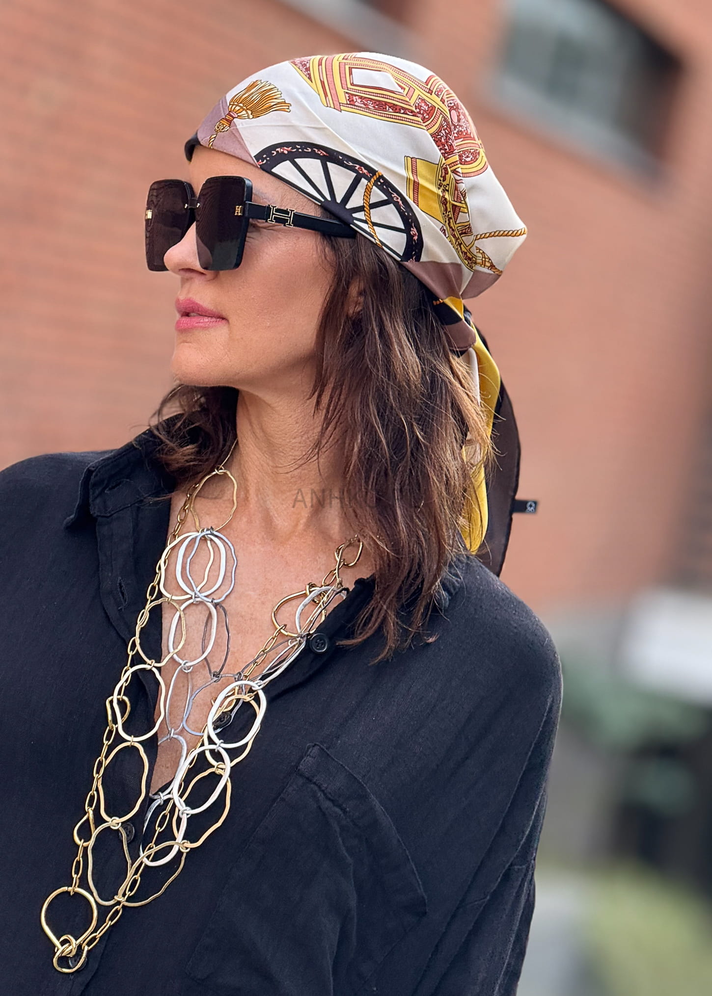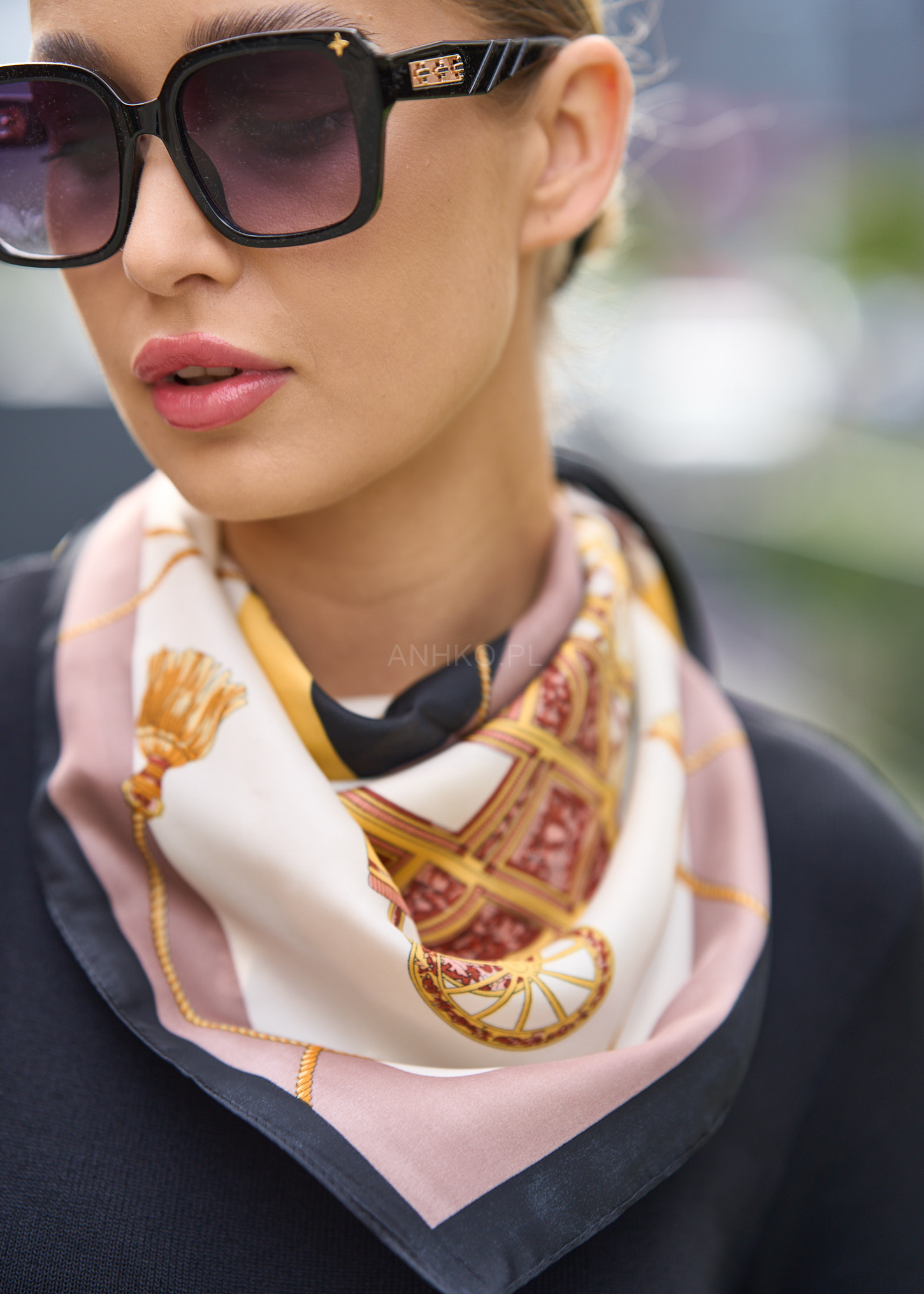 Kwintesencja klasy i stylu retro. Motyw w karoce, ozdobne liny i konie tworzą unikalną kompozycję, która przyciąga wzrok i podkreśla charakter stylizacji. Sprawdzi się zarówno do eleganckiej marynarki, jak i jako dodatek do klasycznej białej koszuli czy płaszcza. Idealna na oficjalne wyjścia, spotkania biznesowe oraz stylowe spacery po mieście. Można ją zawiązać na szyi, torebce, a nawet jako ozdobę włosów – wszechstronność i ponadczasowy design w jednym.