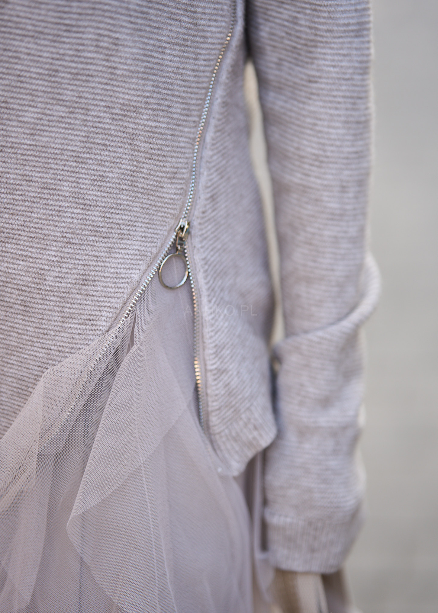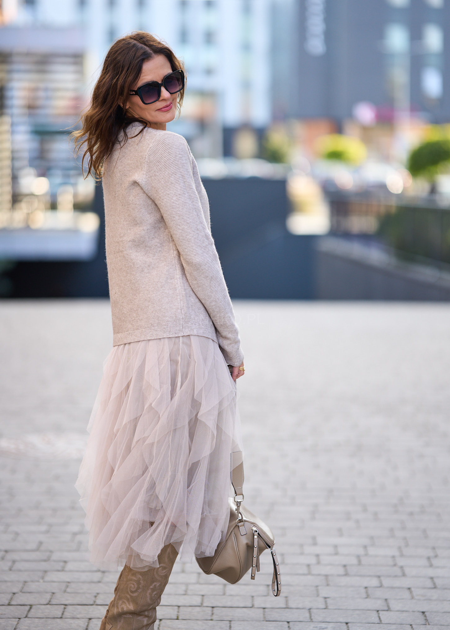 To modna propozycja dla kobiet, które cenią nowoczesny styl. Cienki taupe sweter z delikatnym zamkiem po boku doskonale komponuje się z lekką, tiulową sukienką o subtelnym, falującym dole. Razem tworzą efektowną, warstwową stylizację idealną na randkę, wieczorne wyjście, spotkania z przyjaciółmi czy casualowe dni w mieście. Możesz nosić je razem jako gotowy outfit lub łączyć oddzielnie z innymi elementami garderoby, tworząc niezliczone kombinacje. Całość jest lekka, komfortowa i bardzo kobieca — idealna propozycja na każdą porę roku.