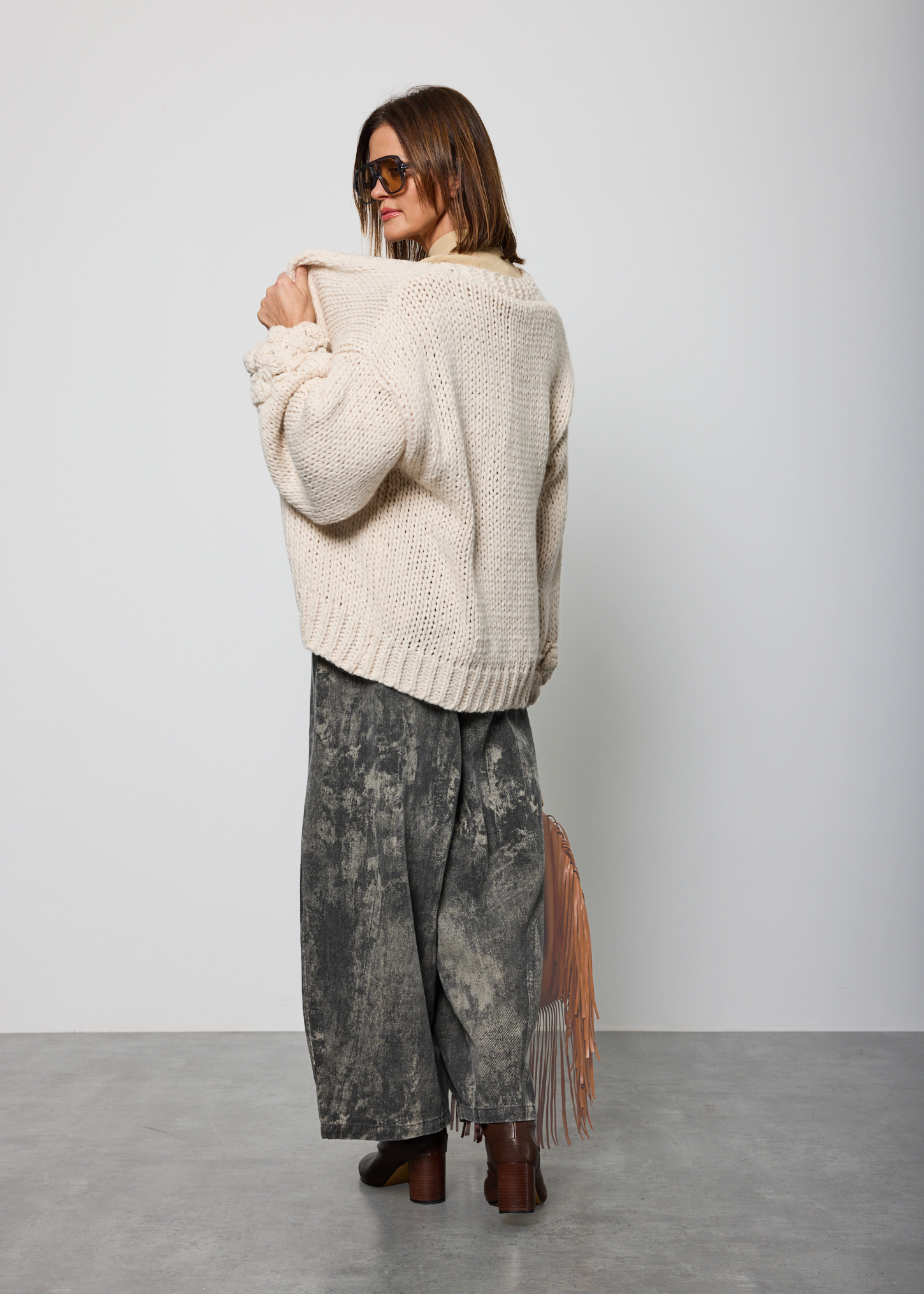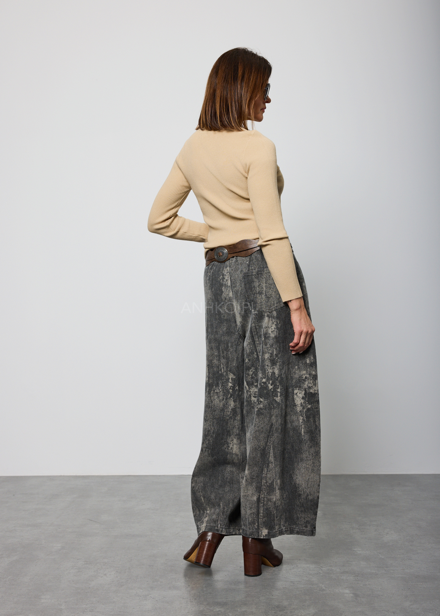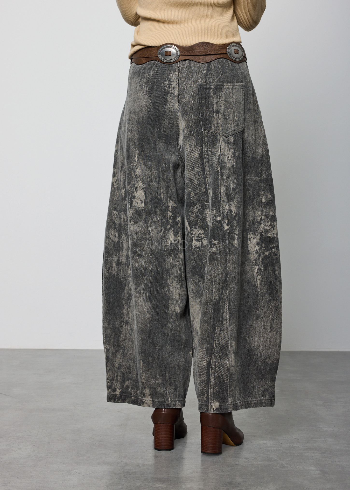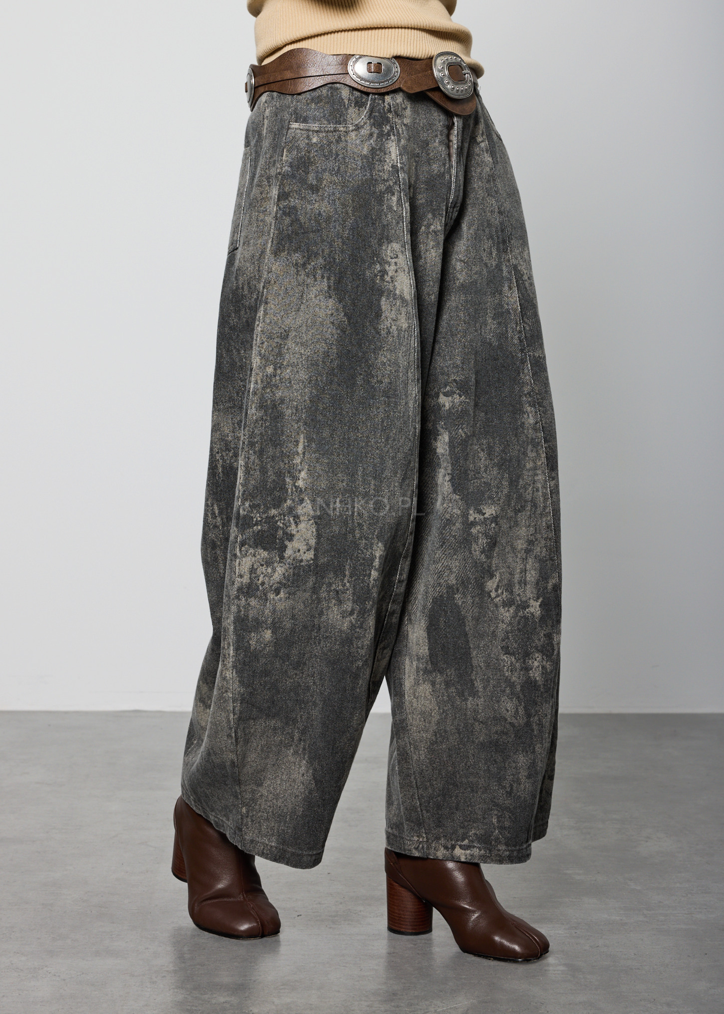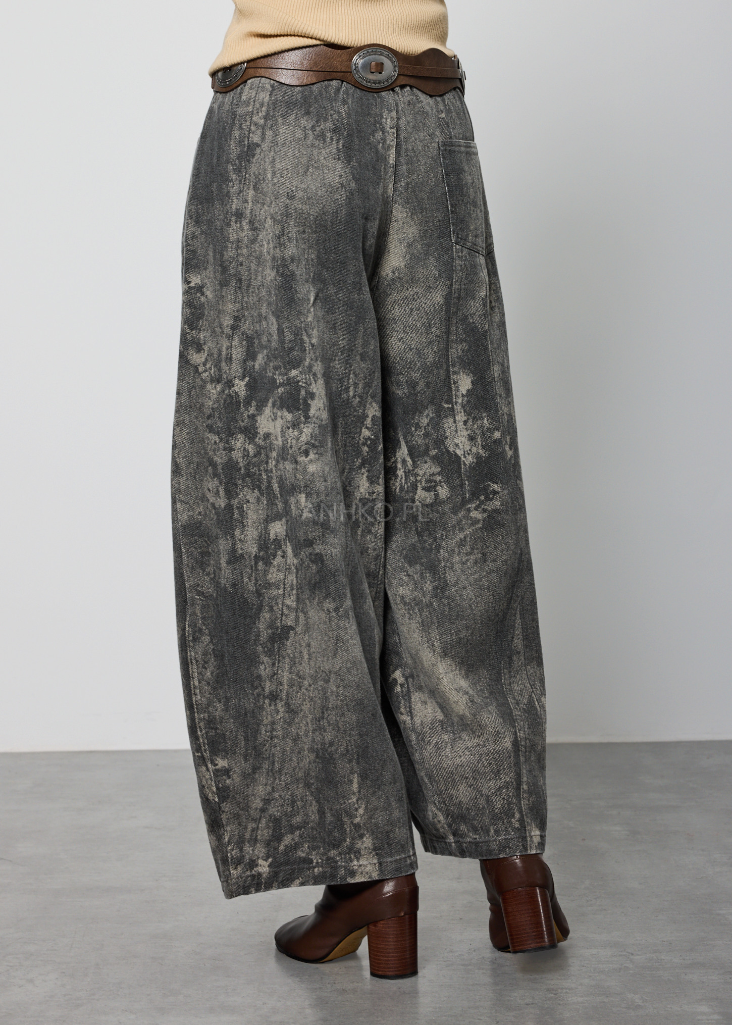 Spodnie o luźnym, lekko zwężanym ku dołowi fasonie, zaprojektowane z myślą o wygodzie i swobodzie ruchów. Model posiada elastyczną talię z tyłu oraz klasyczne zapięcie z przodu na guzik i zamek, co zapewnia dobre dopasowanie do sylwetki. Wyposażone są w funkcjonalne kieszenie z przodu oraz jedną kieszeń z tyłu. Spodnie nie posiadają podszewki ani halki, dzięki czemu pozostają lekkie i komfortowe w noszeniu. Charakterystyczne wykończenie nadaje im unikalny wygląd, który świetnie sprawdzi się w stylizacjach casualowych, miejskich oraz artystycznych. Idealne na co dzień, do pracy kreatywnej, na spacery i spotkania.