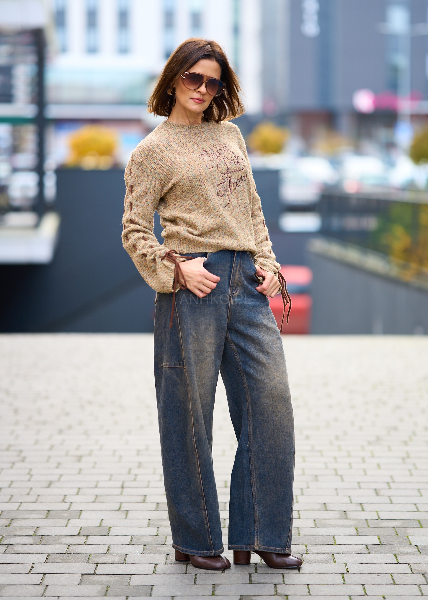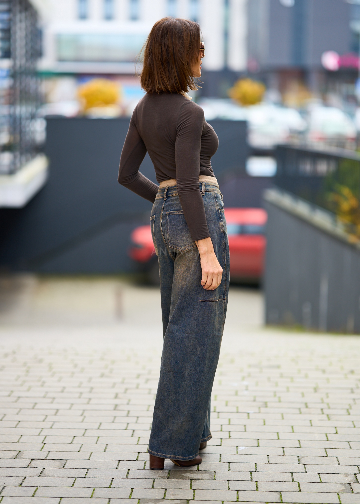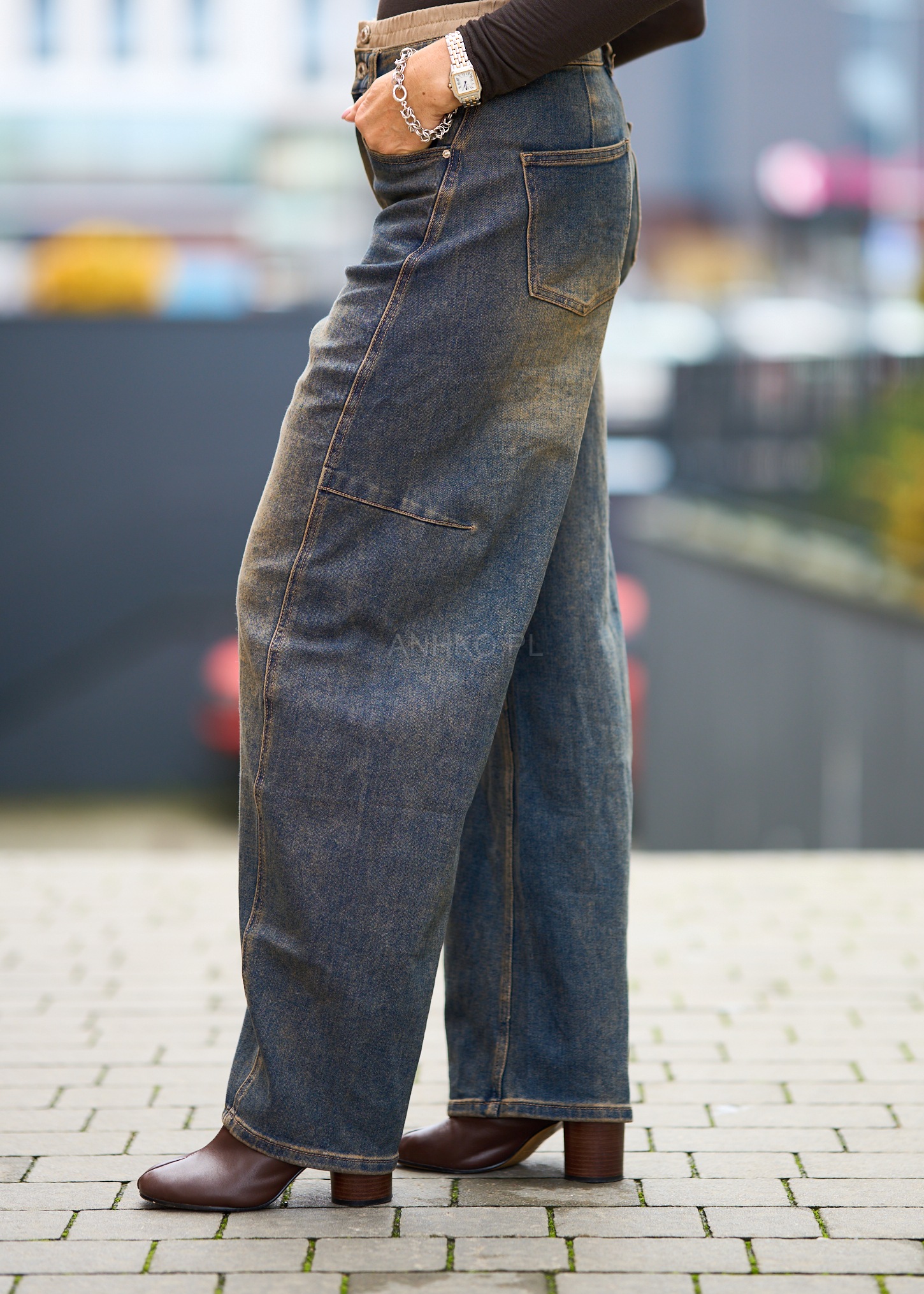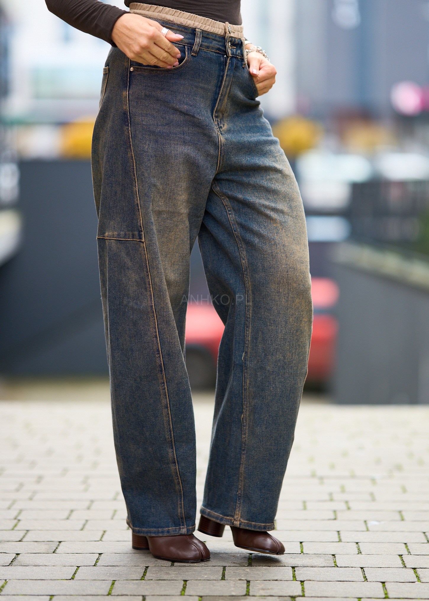 To wyjątkowe połączenie stylu i wygody. Wykonane z miękkiego denimu o lekko spranym efekcie, oferują casualowy, nonszalancki look. Model z prostą, lekko szeroką nogawką i elastycznym pasem w kontrastowym kolorze beżu zapewnia pełną swobodę ruchów i idealne dopasowanie do sylwetki. Posiadają klasyczne kieszenie z przodu i z tyłu oraz praktyczne zapięcie na guzik i suwak. Doskonale sprawdzą się w codziennych stylizacjach – zarówno z sneakersami, jak i botkami. Idealne na co dzień, do pracy w nieformalnym stylu lub na weekendowe spotkania. Komfort i włoski luz w jednym.