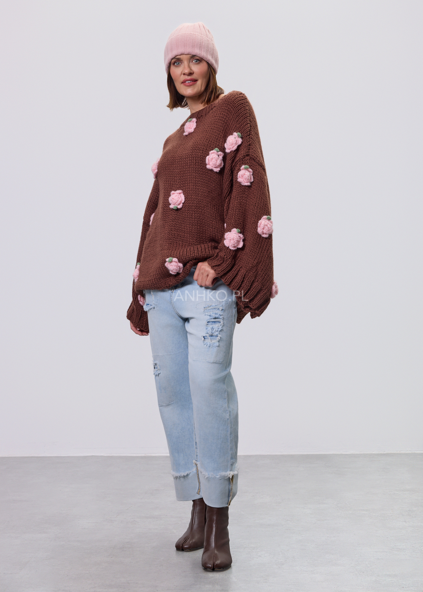 Sweter Romantic Rosy Brązowy - Uroczy, brązowy sweter zdobiony trójwymiarowymi różami w odcieniach różu to romantyczny akcent w każdej garderobie. Idealny na chłodniejsze dni – łączy przytulność z wyjątkowym designem.