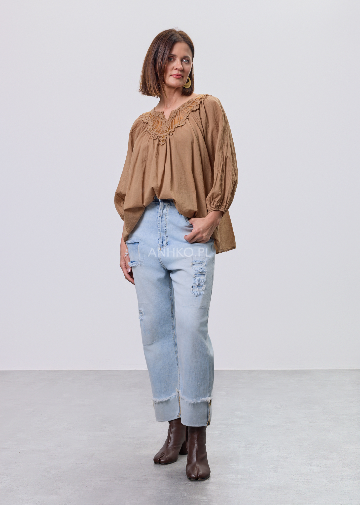 Bluzka Mireya Whisper Camel - Zwiewna bluzka o luźnym kroju z dekoracyjnym haftem przy dekolcie. Subtelnie transparentna, lekka i wygodna, idealna na co dzień i na specjalne okazje. Kobiecy fason zapewnia swobodę ruchów i ponadczasowy styl.