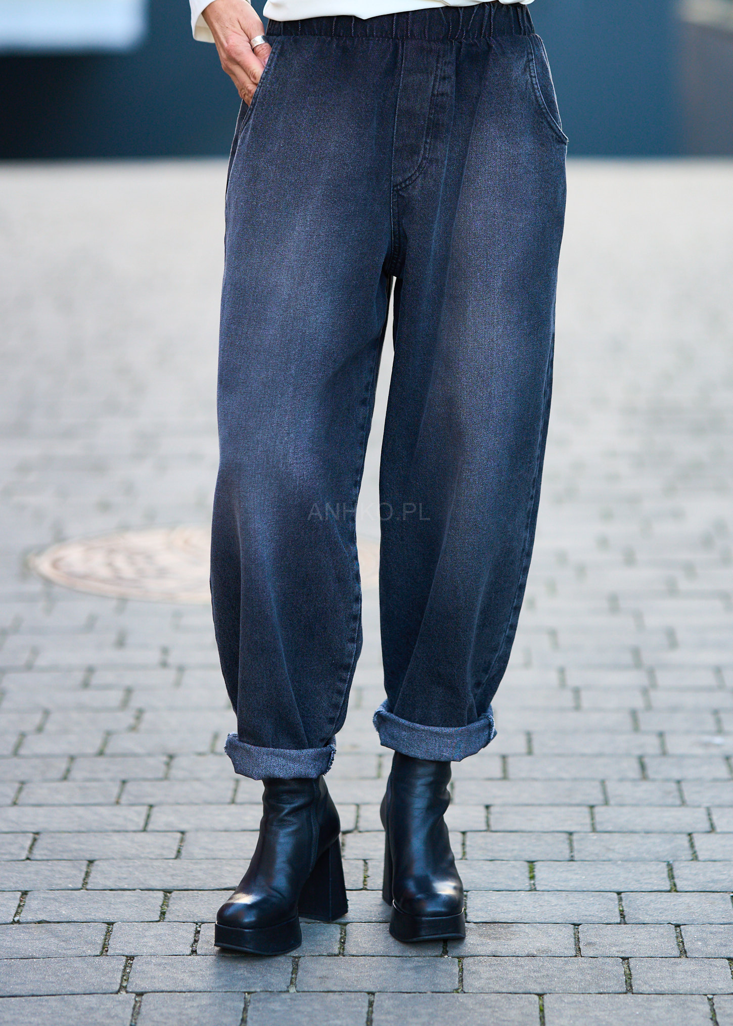 Te spodnie jeansowe wyróżniają się swobodnym fasonem, który miękko układa się na sylwetce i zapewnia pełną wygodę w ruchu. Luźniejszy krój z delikatnie zwężaną nogawką tworzy nowoczesną linię, a podwinięcie na dole dodaje stylizacji lekko nonszalanckiego charakteru.