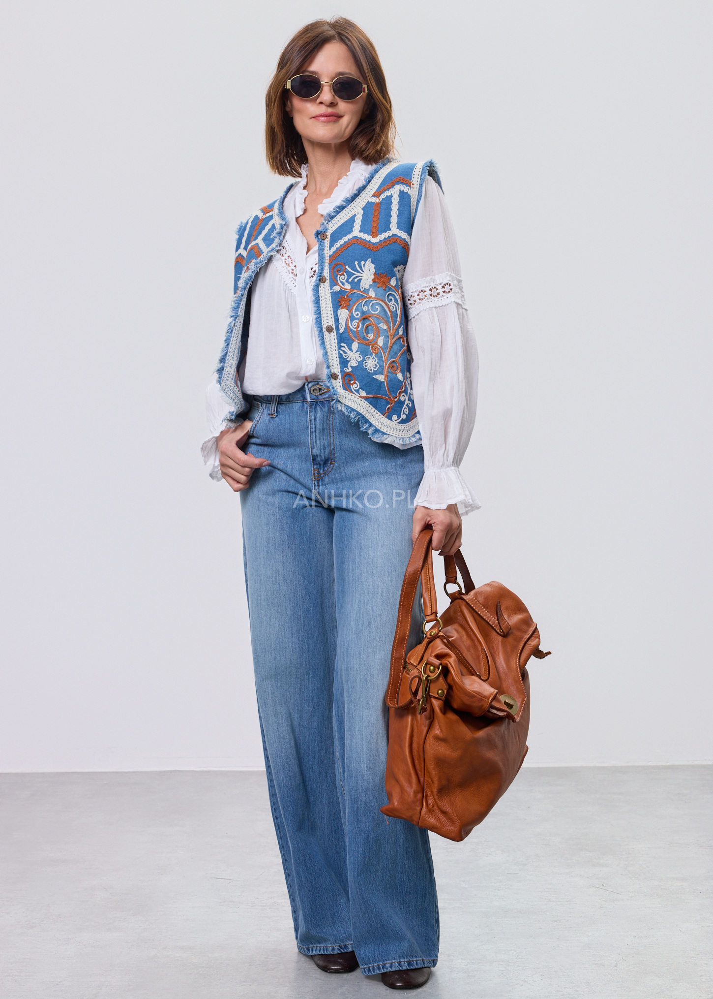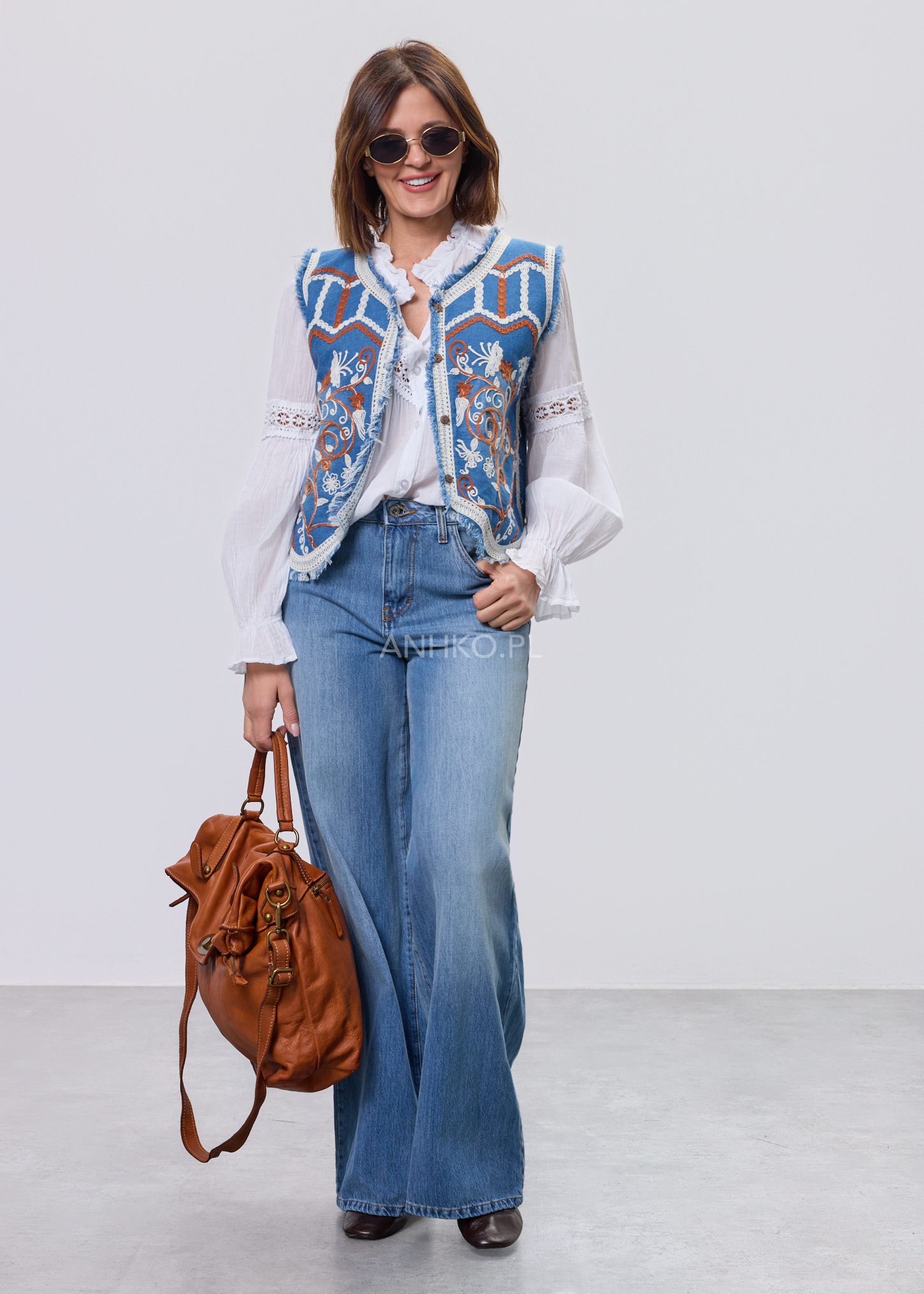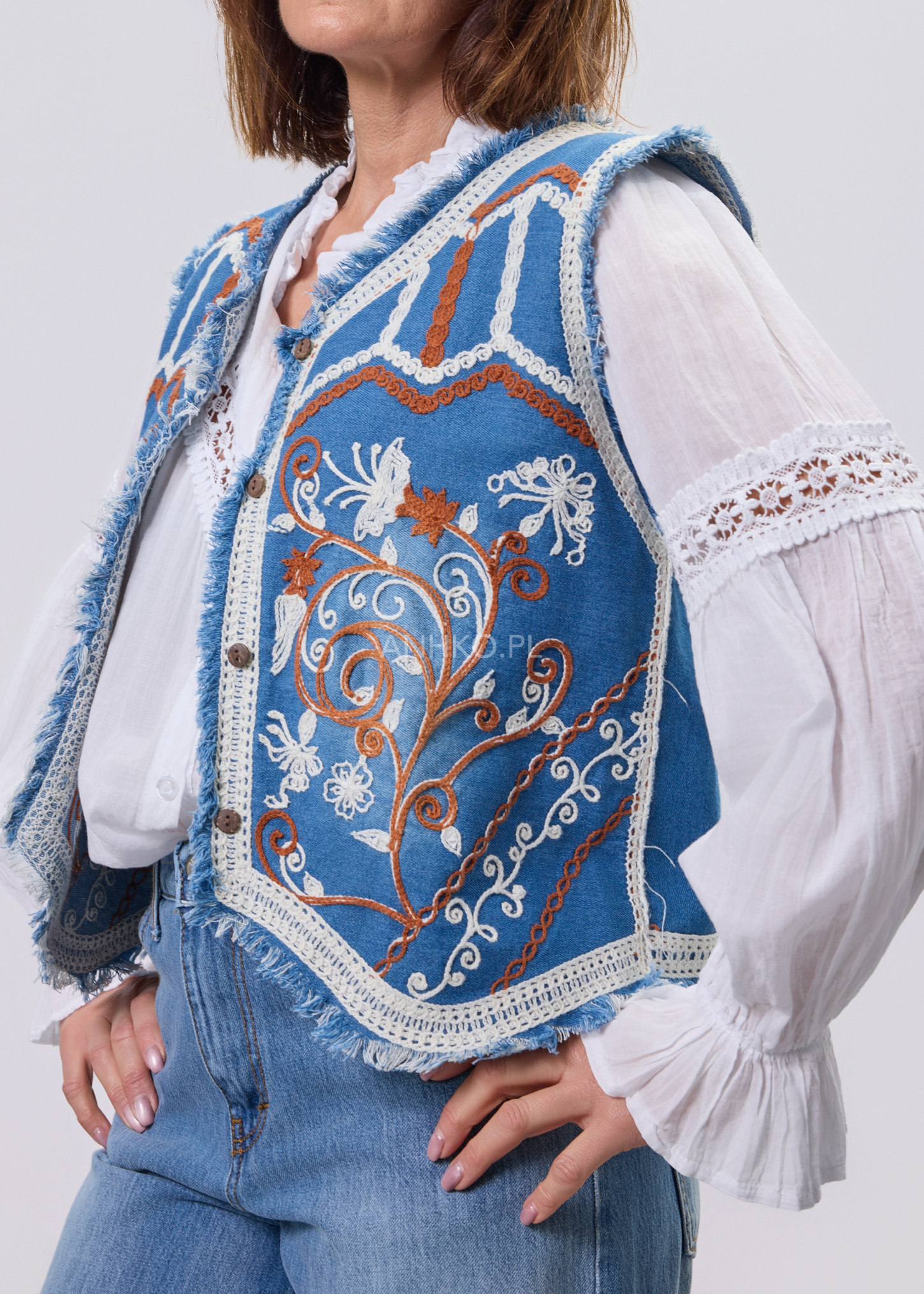 Ta kamizelka damska o krótkim fasonie do talii pięknie podkreśla sylwetkę i nadaje stylizacji wyrazistego charakteru. Denimowa baza w odcieniu klasycznego błękitu została ozdobiona kontrastowym haftem florystycznym w odcieniach karmelu i ecru, tworząc efekt inspirowany estetyką western i boho.