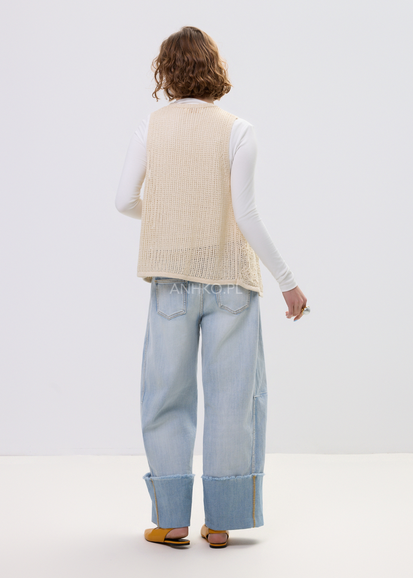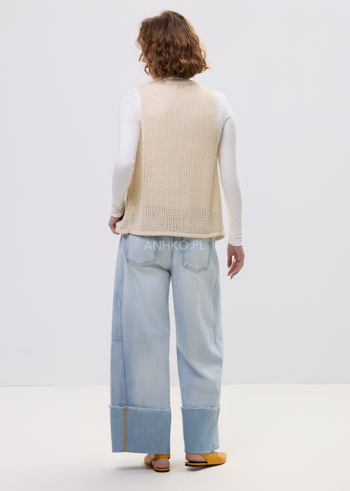 Ta kamizelka krótka z delikatnej dzianiny pięknie układa się na sylwetce, tworząc lekki, warstwowy efekt. Ażurowa struktura sprawia, że model wygląda subtelnie i kobieco, a otwarta forma pozwala swobodnie zestawiać go z koszulą, topem lub sukienką. Dzięki długości do bioder kamizelka zachowuje proporcje stylizacji i świetnie komponuje się zarówno z dopasowanymi, jak i luźniejszymi elementami garderoby.