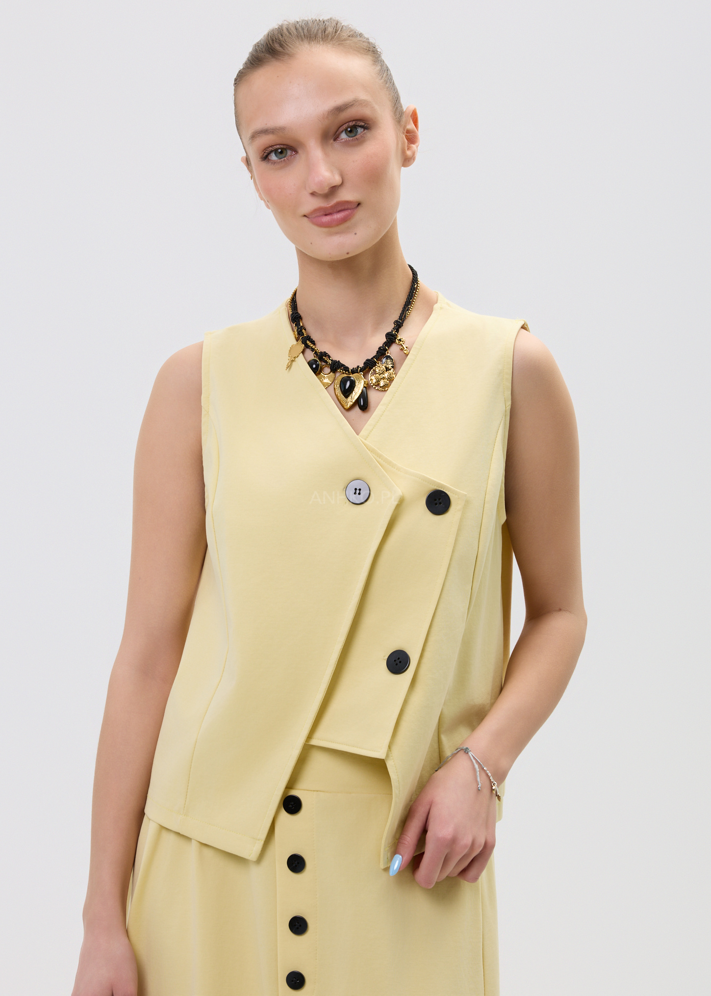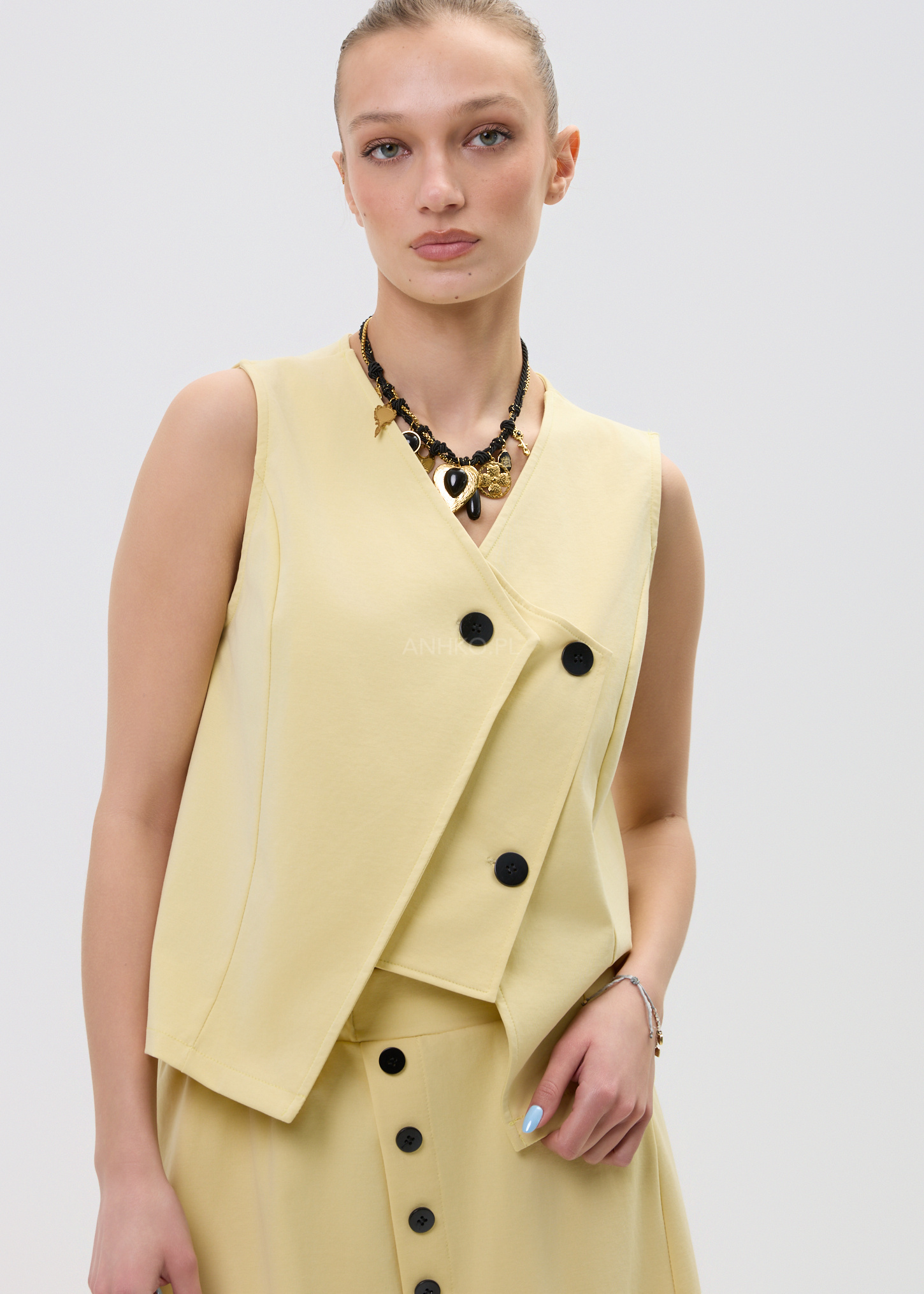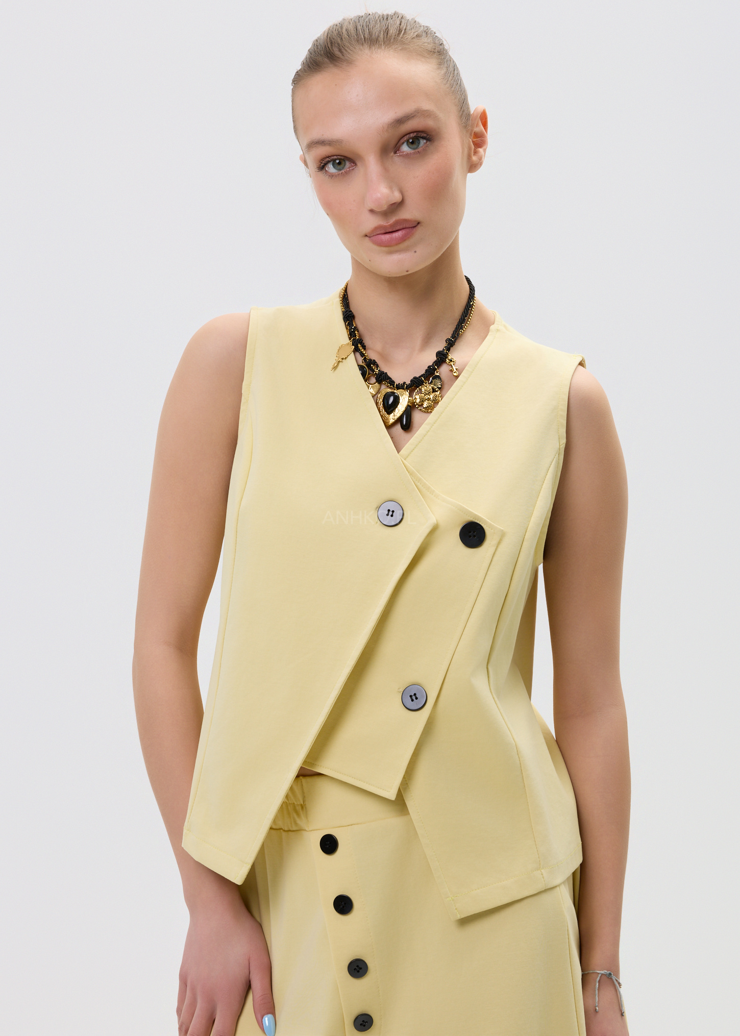 Ta kamizelka o luźniejszym fasonie subtelnie układa się na sylwetce, zapewniając swobodę ruchu i lekkość stylizacji. Dekolt w kształcie litery V optycznie wydłuża linię szyi, a asymetryczne zapięcie na guziki przyciąga uwagę i nadaje całości nowoczesnego charakteru. Pastelowy, maślany odcień pięknie rozświetla stylizację i wpisuje się w aktualne trendy.