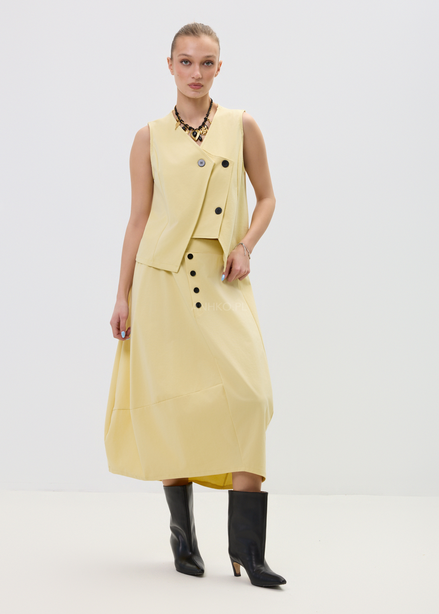 Spódnica Mustaco Żółta - Lekka, świeża i totalnie wiosenna. Spódnica w maślanym odcieniu z asymetrycznym przodem i dekoracyjnymi guzikami to idealna baza do codziennych stylizacji – wygodna, a jednocześnie przyciągająca spojrzenia.