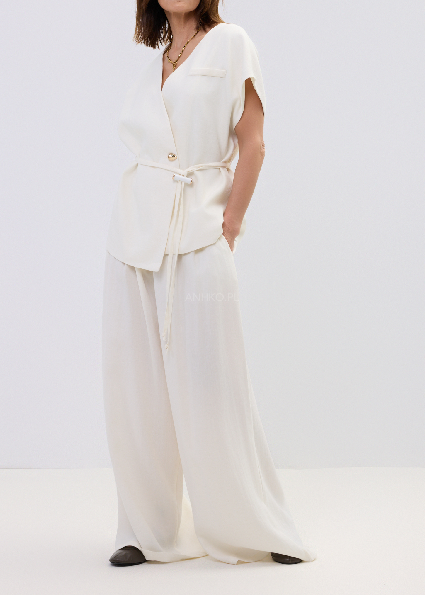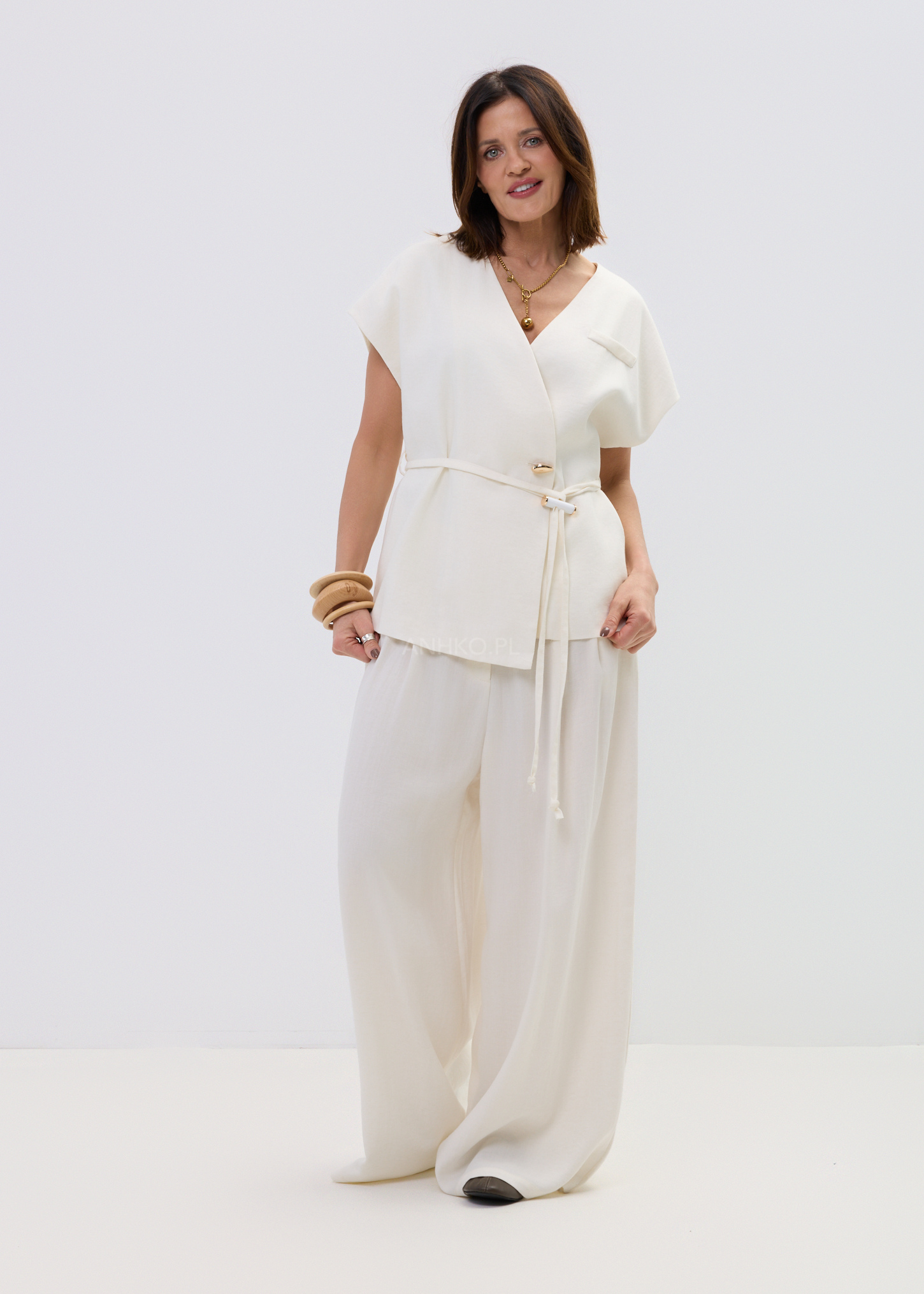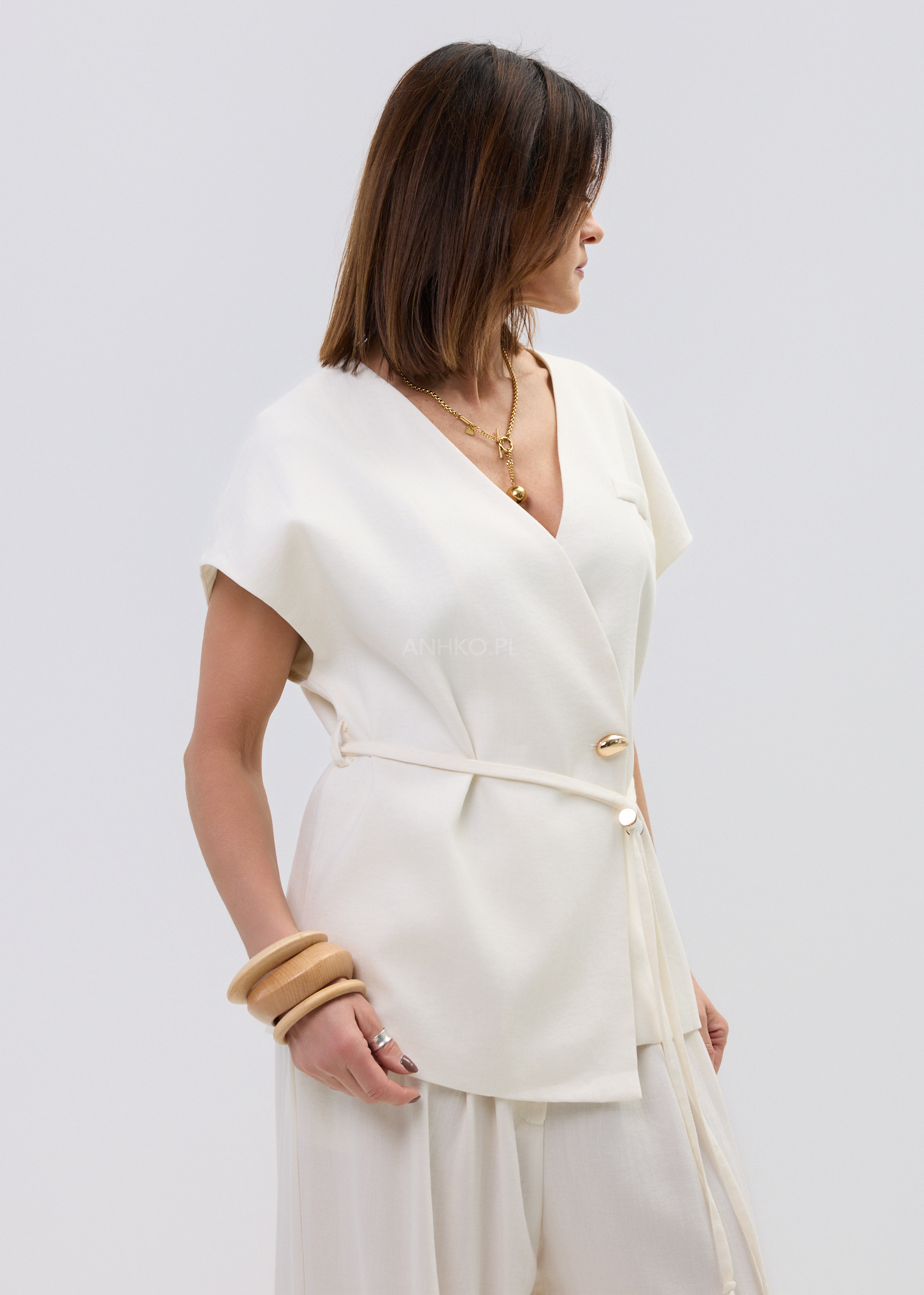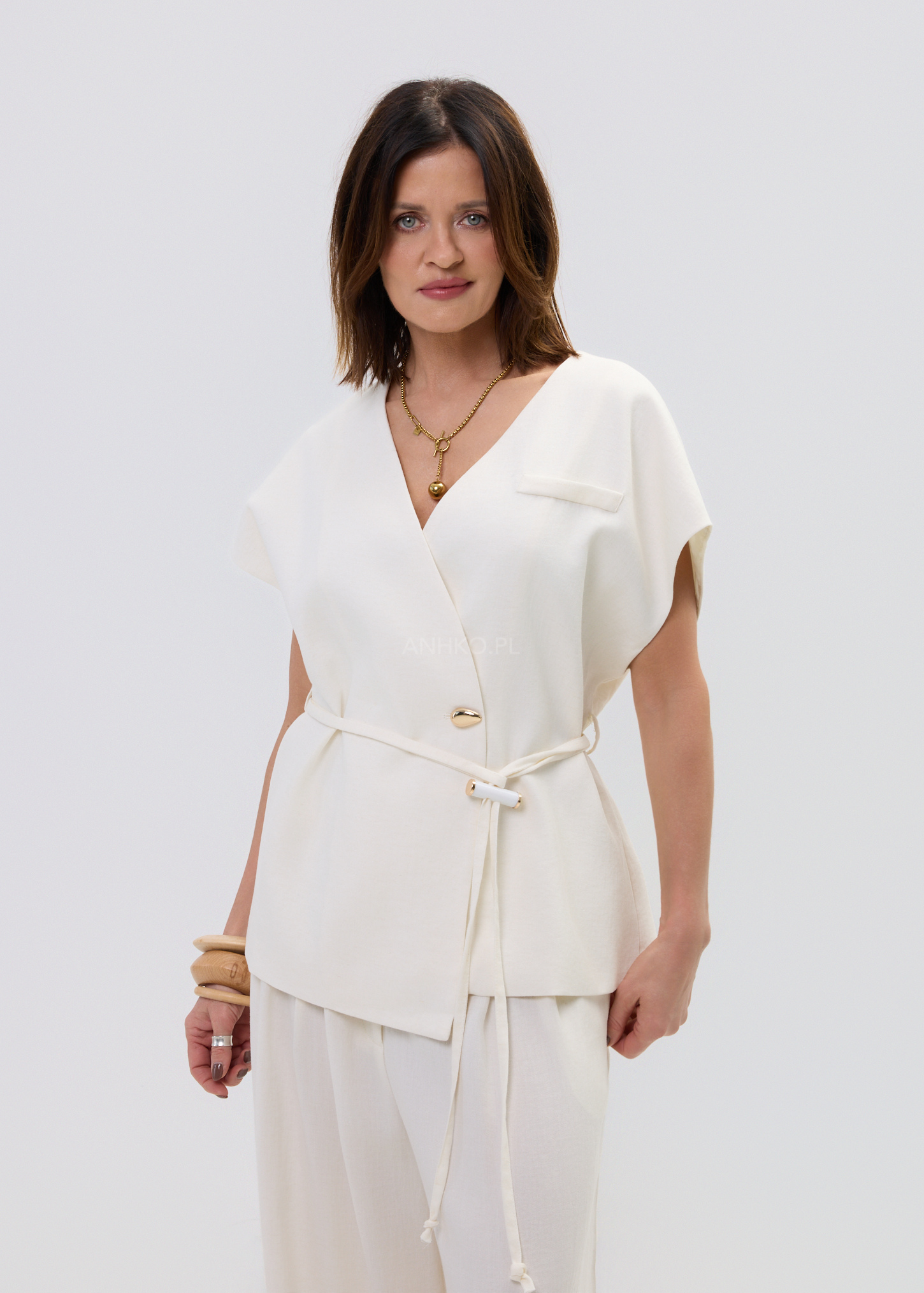 Ta kamizelka damska typu wrap subtelnie układa się na sylwetce, tworząc lekko dopasowaną linię talii i naturalny, swobodny efekt. Kopertowy fason z wiązaniem pozwala regulować proporcje, a miękko opadający materiał delikatnie pracuje w ruchu, zapewniając komfort i elegancki look bez wysiłku.