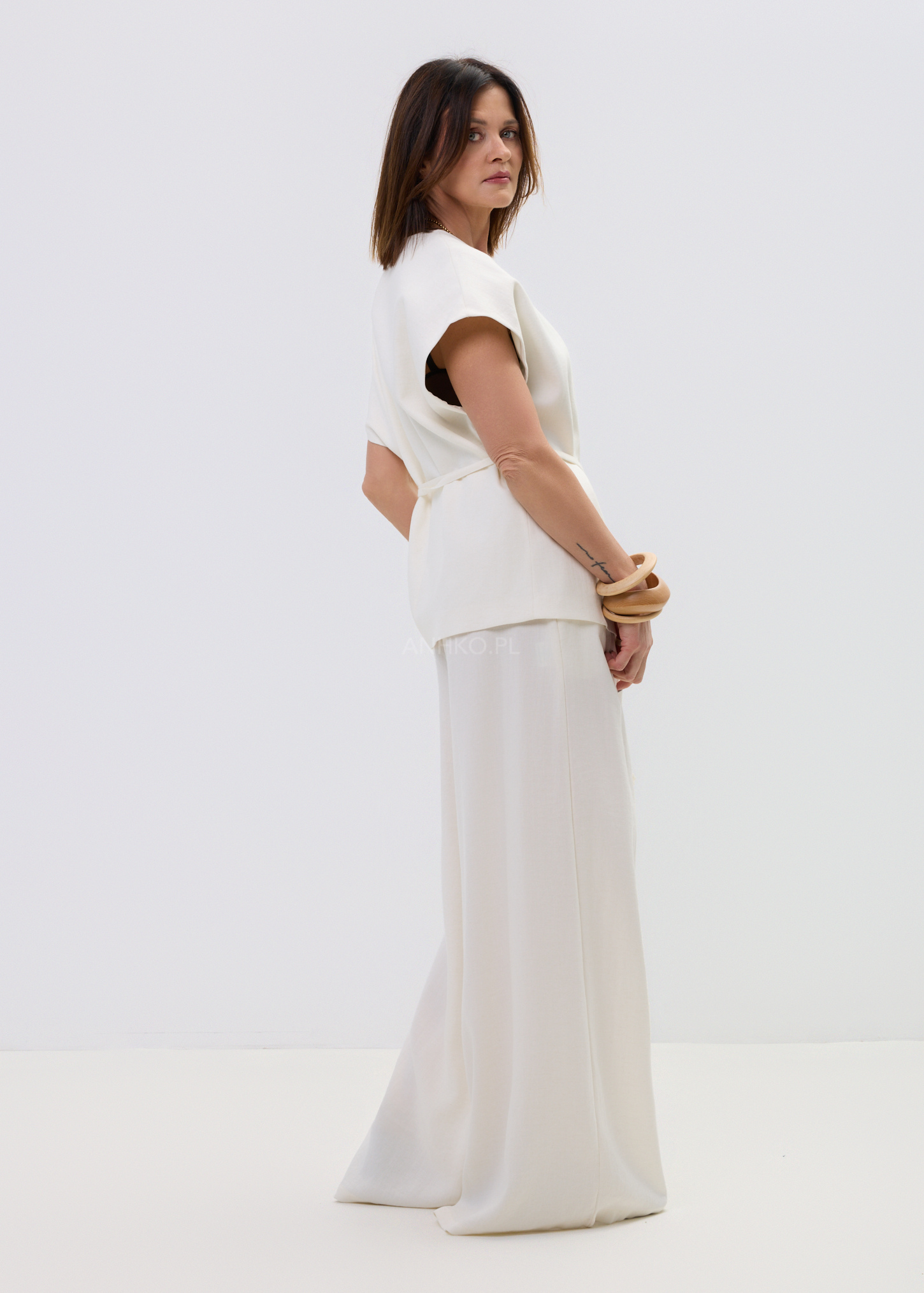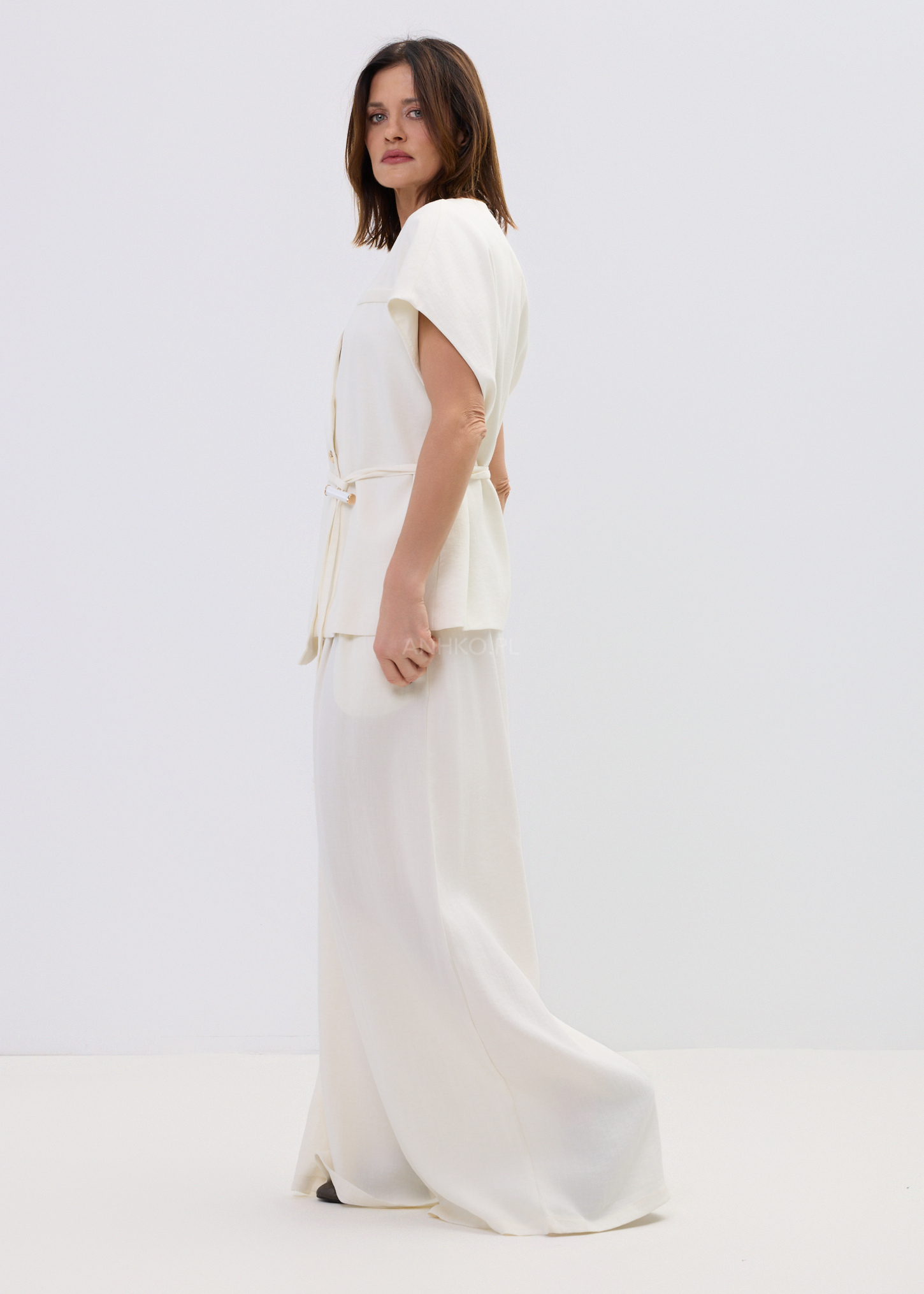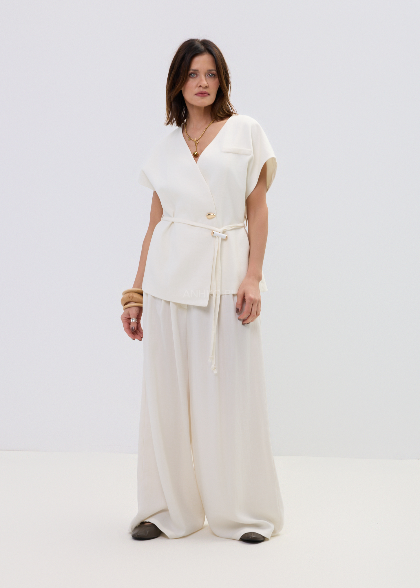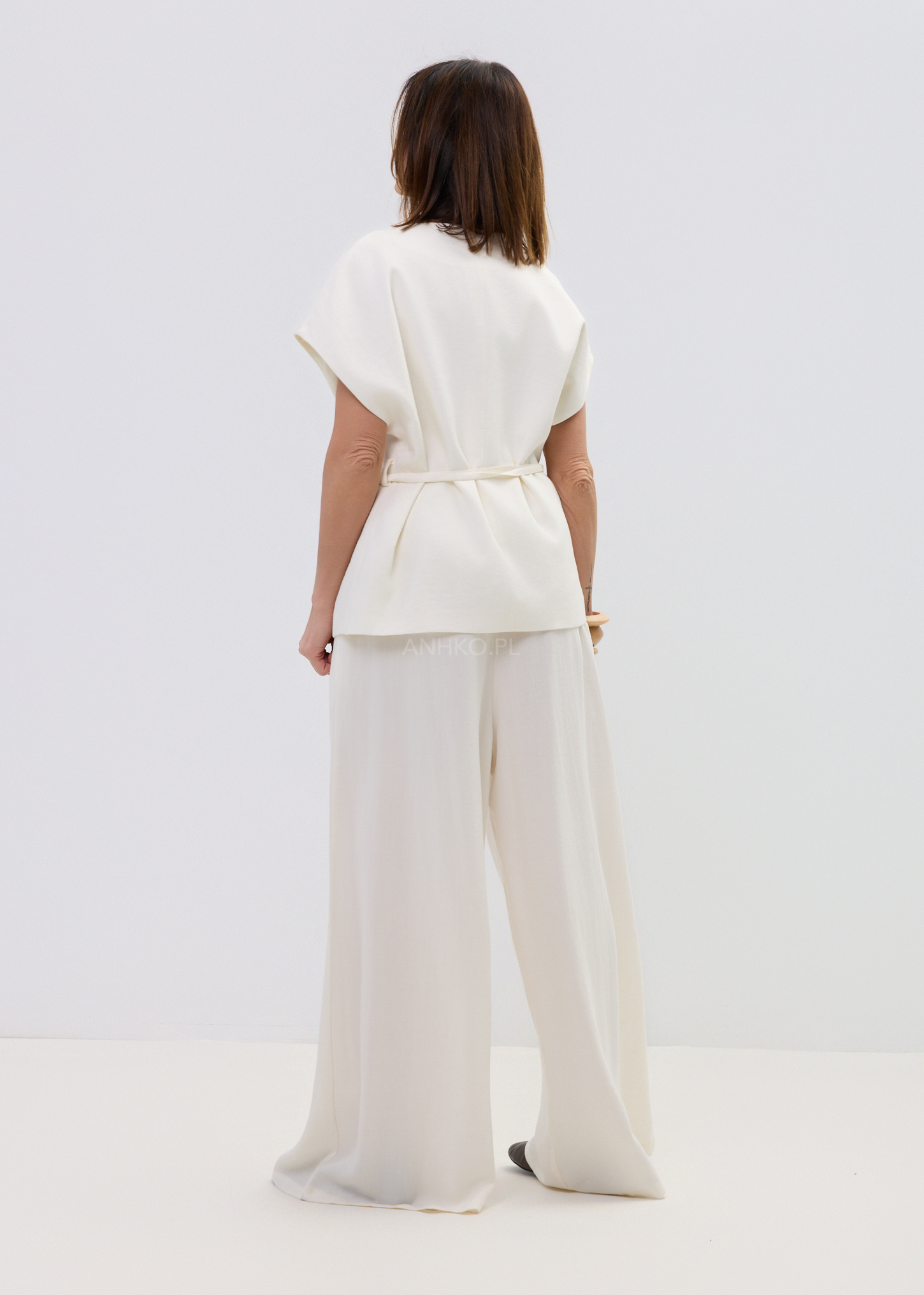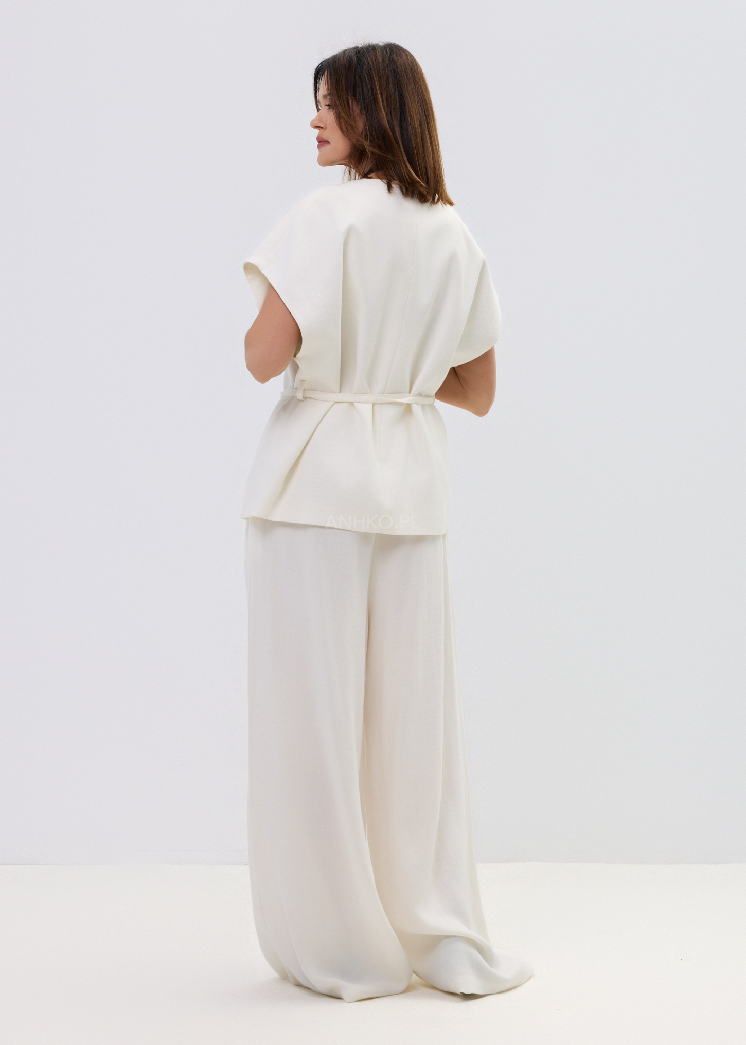 Ta kamizelka damska typu wrap subtelnie układa się na sylwetce, tworząc lekko dopasowaną linię talii i naturalny, swobodny efekt. Kopertowy fason z wiązaniem pozwala regulować proporcje, a miękko opadający materiał delikatnie pracuje w ruchu, zapewniając komfort i elegancki look bez wysiłku.