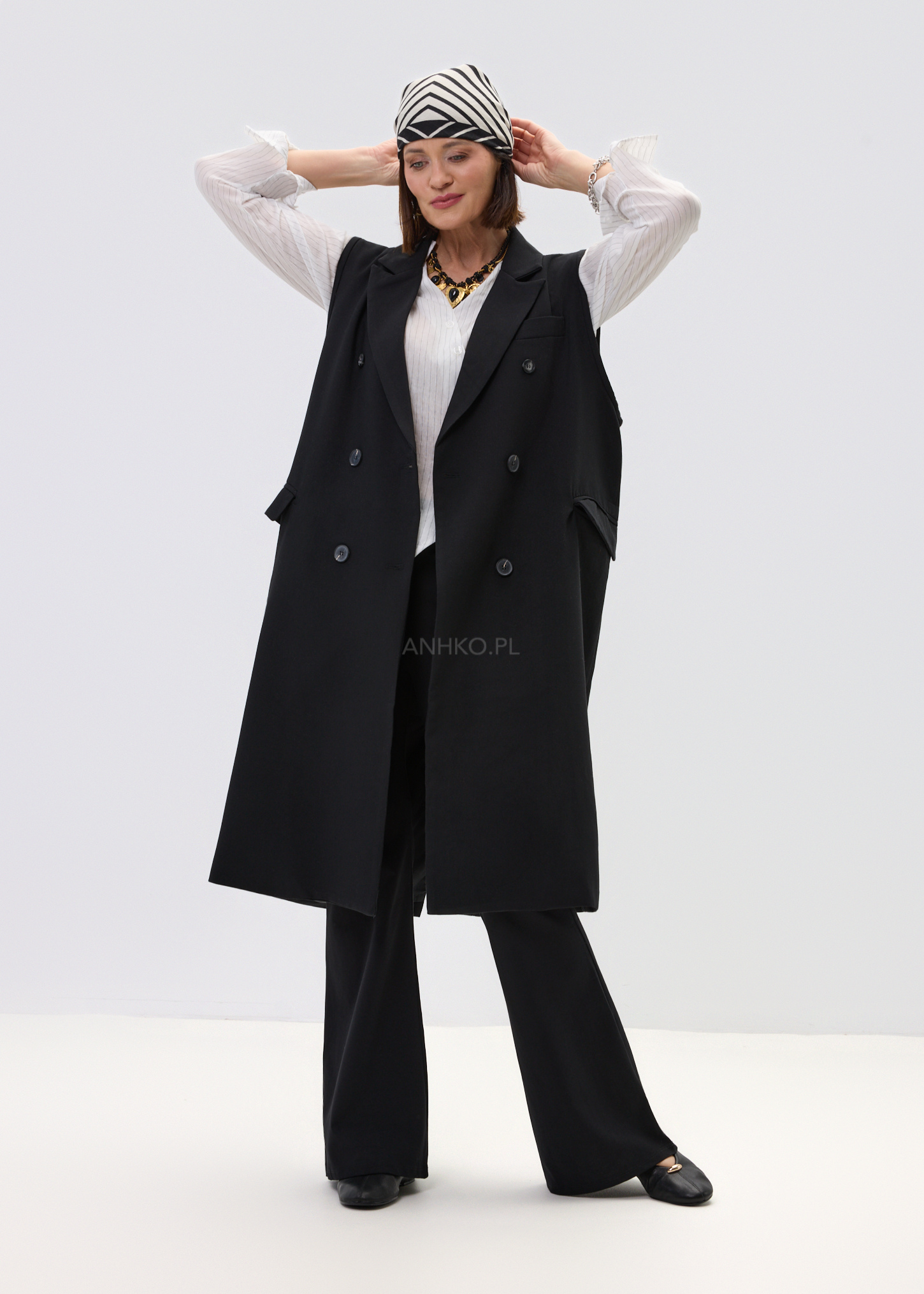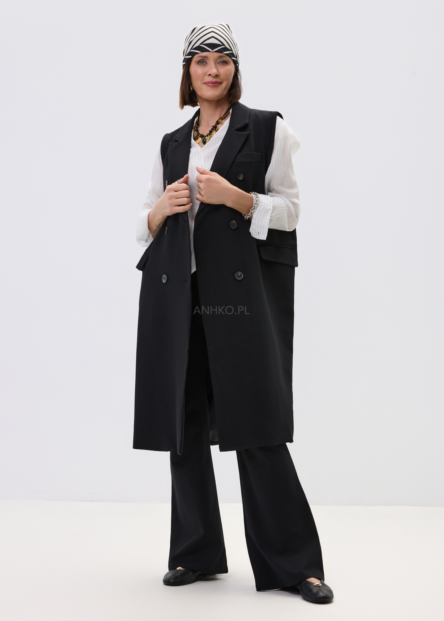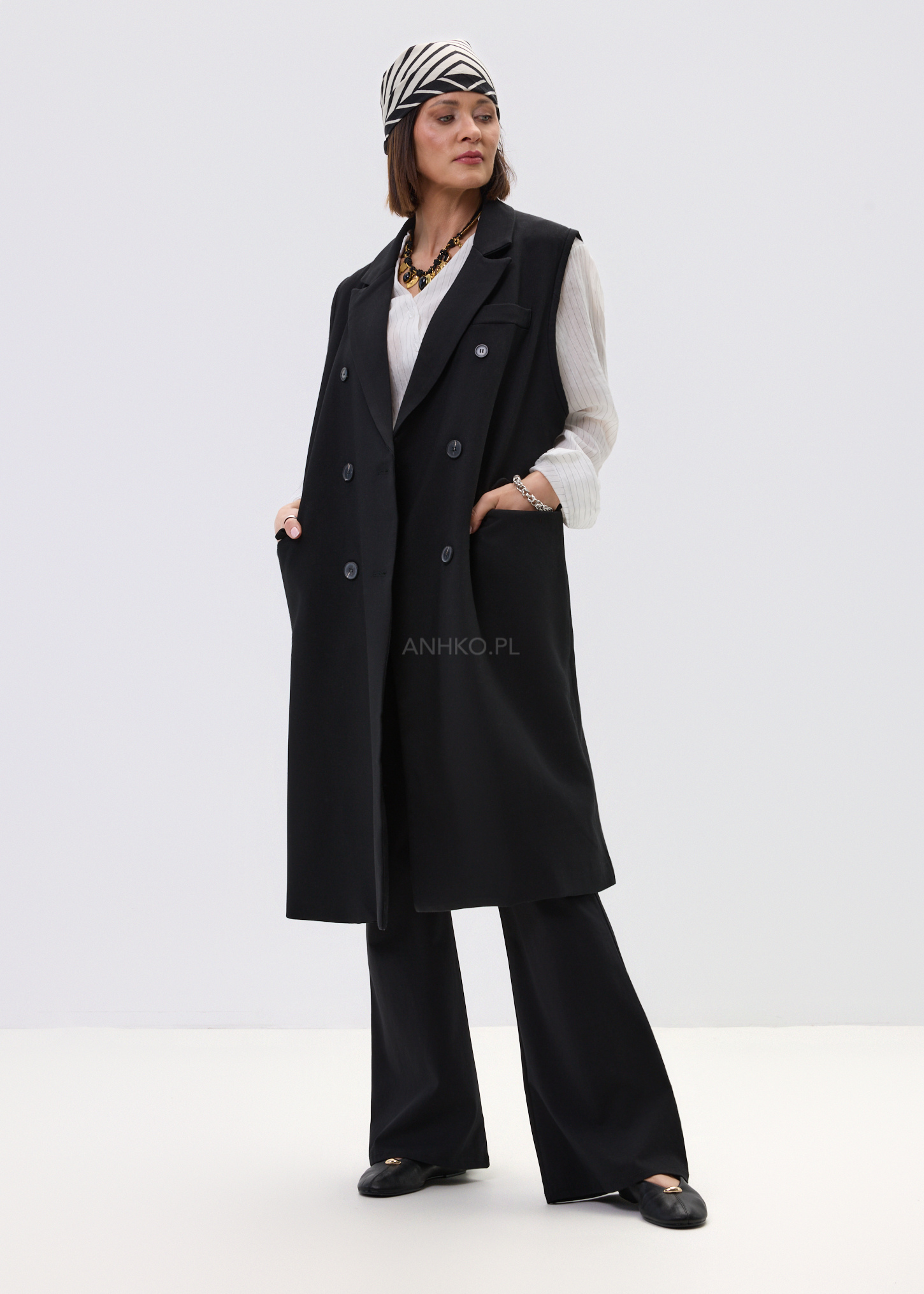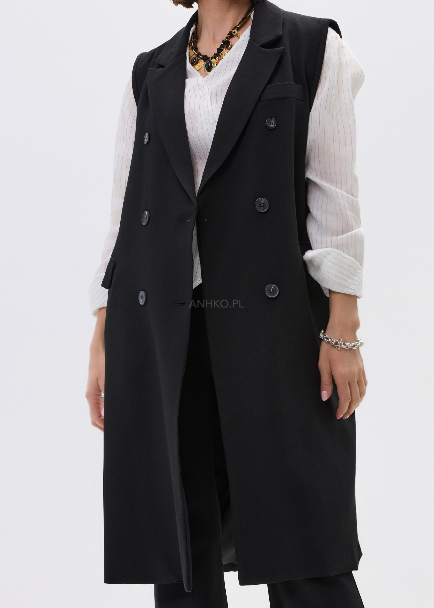 Ta elegancka kamizelka damska inspirowana fasonem marynarki pięknie wydłuża sylwetkę i nadaje stylizacji wyrazisty charakter. Wydłużony krój za biodra układa się swobodnie, a dwurzędowe zapięcie i klasyczne klapy budują efekt dopracowanego, nowoczesnego looku. Czerń podkreśla uniwersalność modelu i sprawia, że kamizelka świetnie odnajduje się zarówno w stylizacjach bardziej eleganckich, jak i w zestawach z denimem czy basicowym topem.