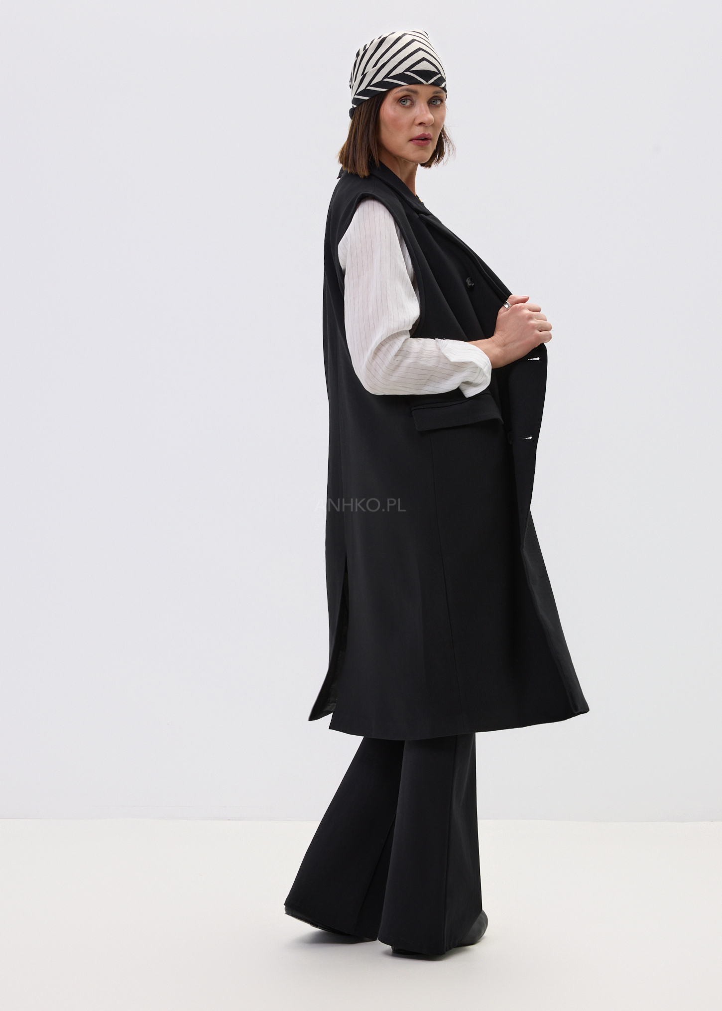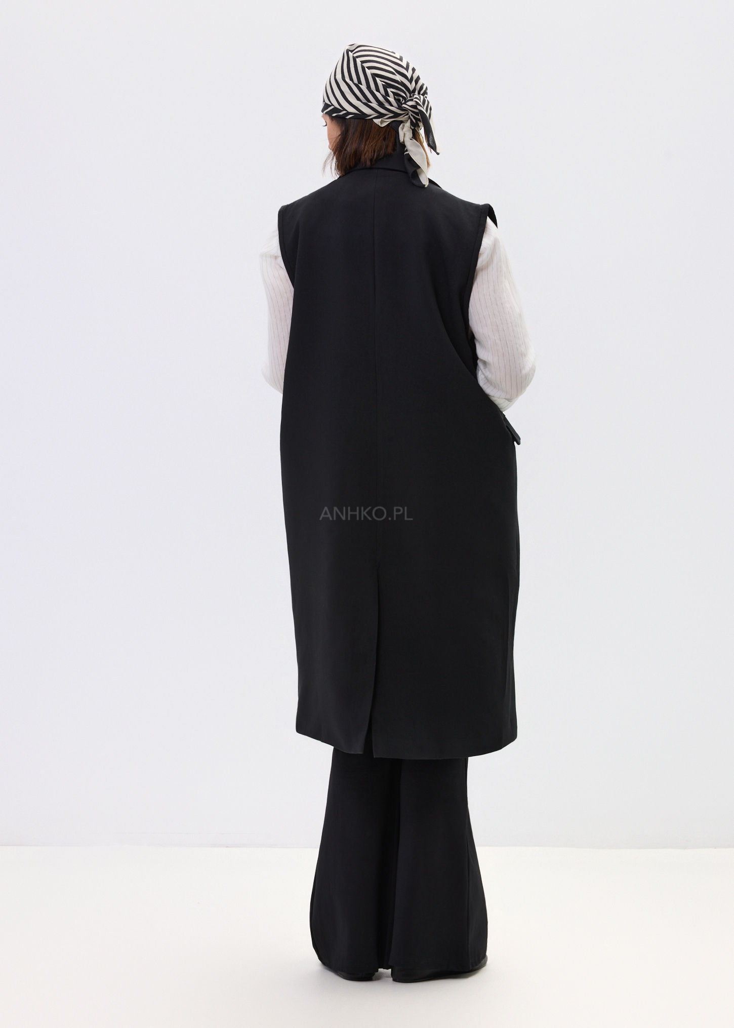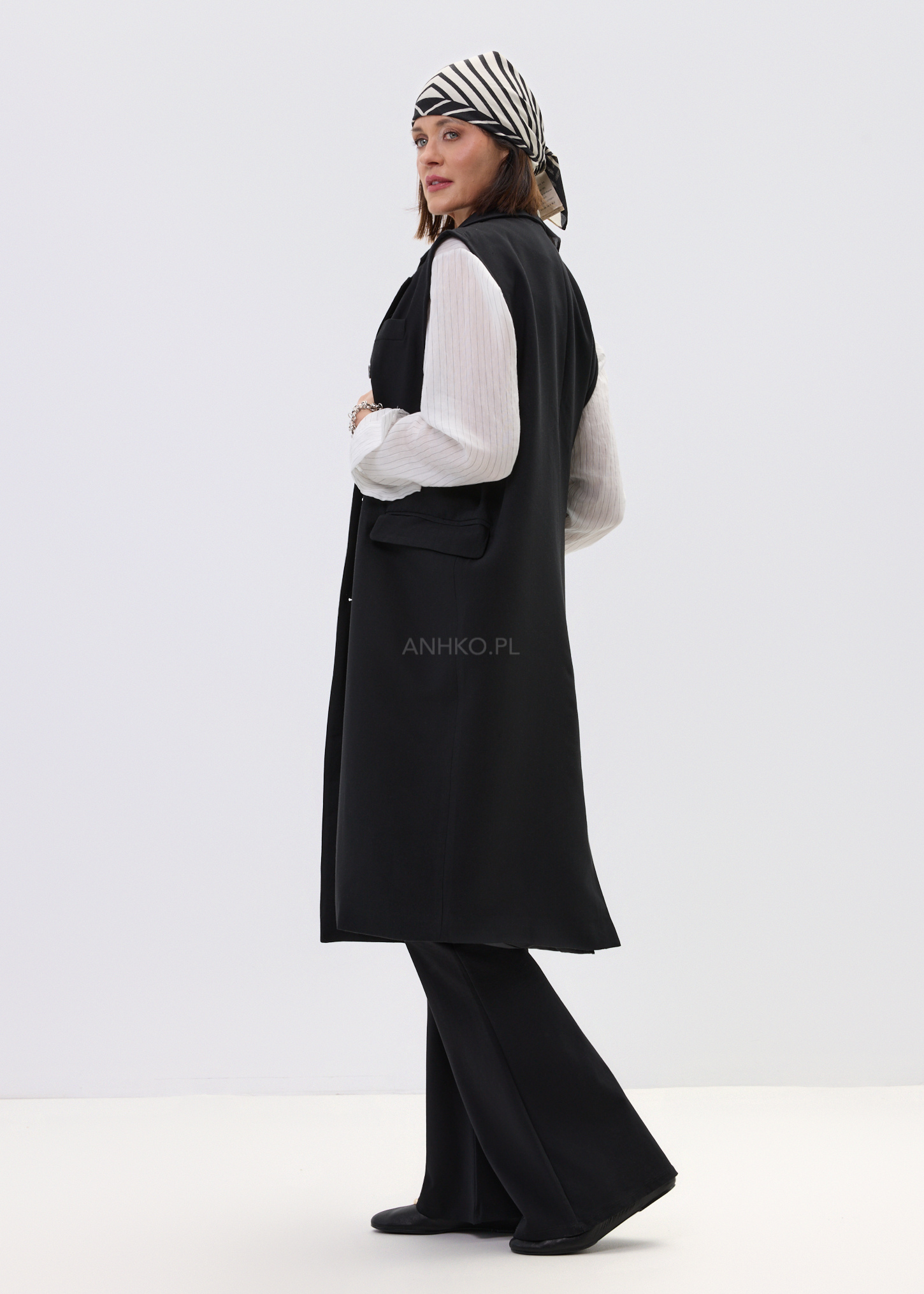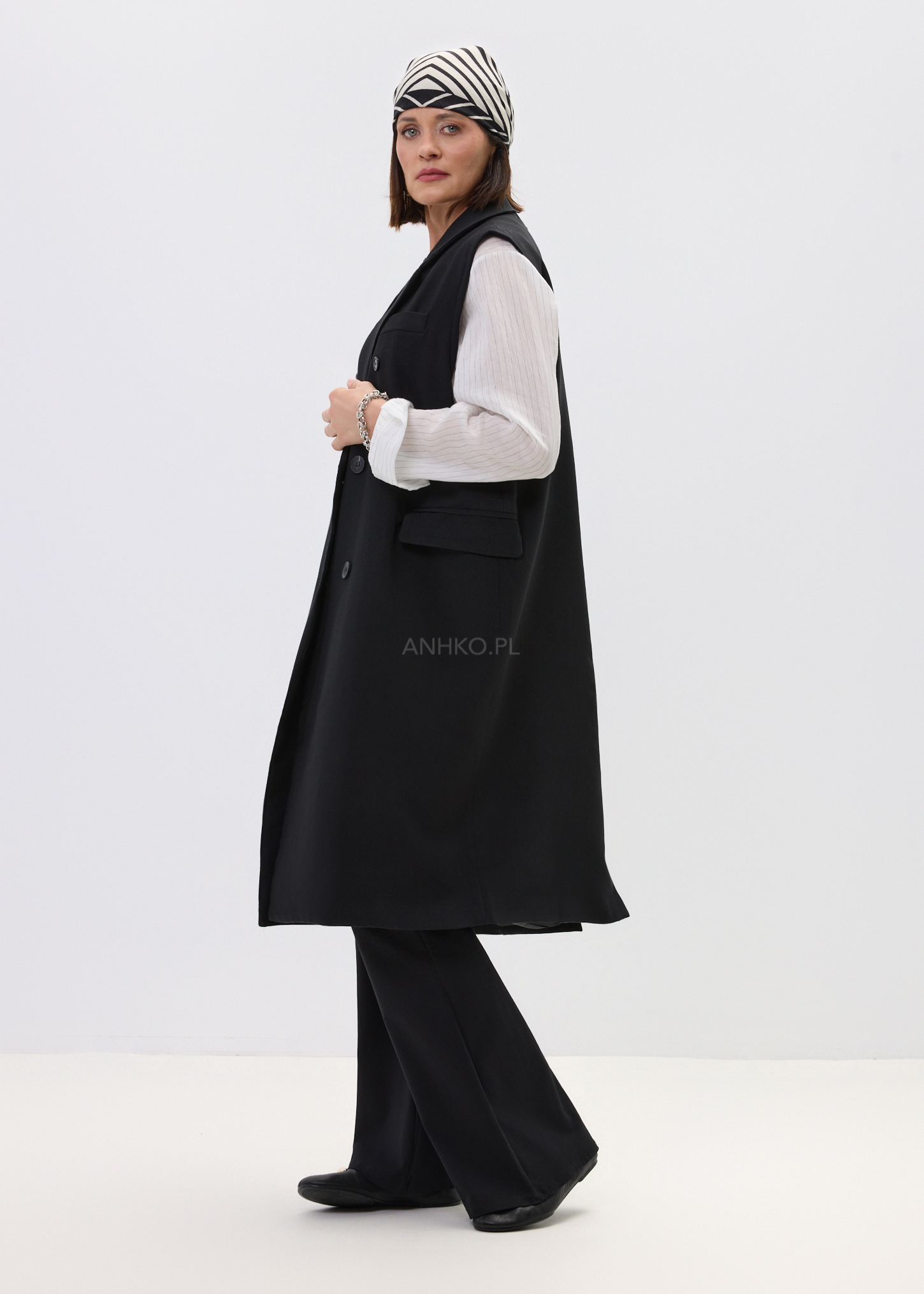 Ta elegancka kamizelka damska inspirowana fasonem marynarki pięknie wydłuża sylwetkę i nadaje stylizacji wyrazisty charakter. Wydłużony krój za biodra układa się swobodnie, a dwurzędowe zapięcie i klasyczne klapy budują efekt dopracowanego, nowoczesnego looku. Czerń podkreśla uniwersalność modelu i sprawia, że kamizelka świetnie odnajduje się zarówno w stylizacjach bardziej eleganckich, jak i w zestawach z denimem czy basicowym topem.