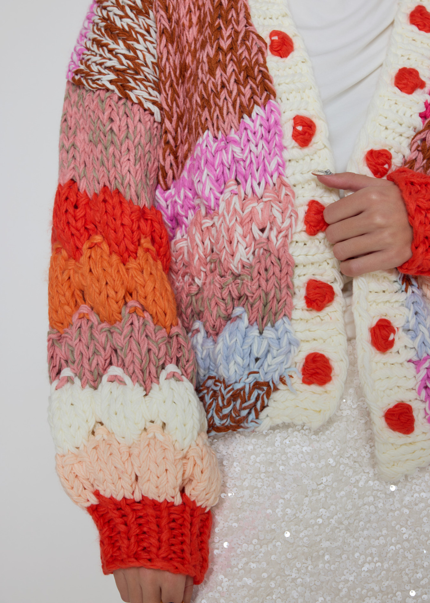 Ten niezwykle efektowny, ręcznie robiony kardigan został stworzony z grubego, miękkiego włókna, które pięknie układa się na sylwetce i zapewnia wyjątkowy komfort noszenia. Mieszanka intensywnych kolorów tworzy unikatową mozaikę, dzięki której model staje się głównym punktem każdej stylizacji. Brak podszewki sprawia, że jest lekki, a jednocześnie bardzo ciepły. Ozdobne elementy 3D i różnorodny splot nadają mu niepowtarzalny charakter. Idealny na jesienne i zimowe spacery, spotkania ze znajomymi, wyjazdy czy codzienne stylizacje, którym chcesz dodać koloru i energii. Doskonale pasuje zarówno do jeansów, jak i prostych sukienek.