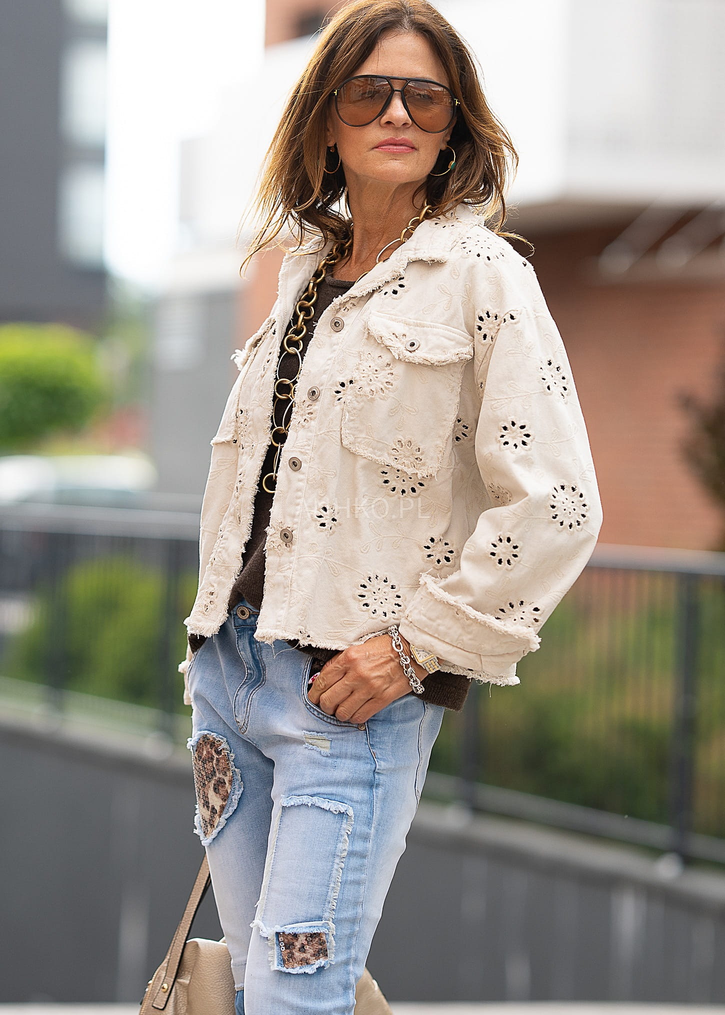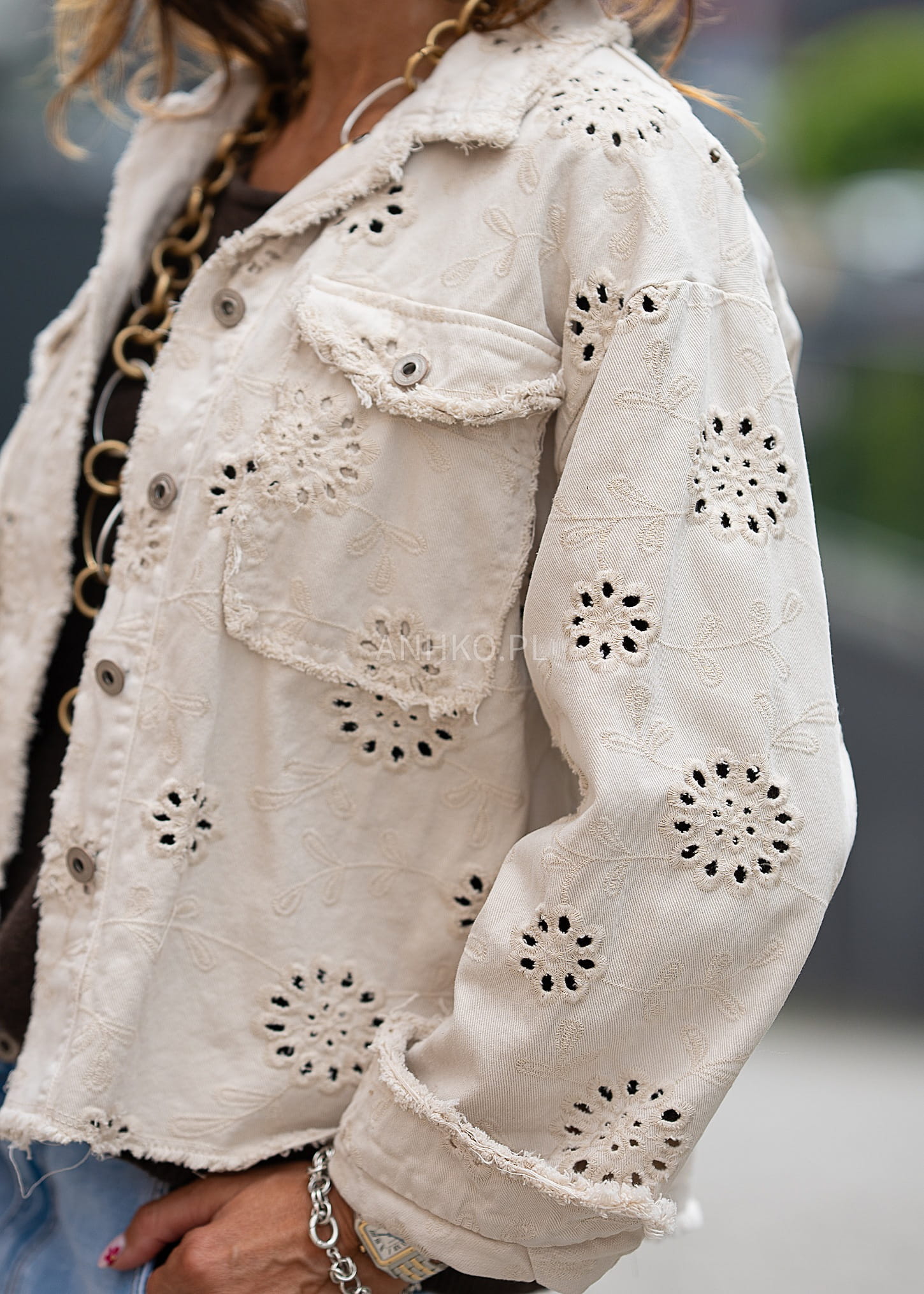 To wyjątkowa, beżowa katana ażurowa wykonana z najwyższej jakości bawełny, która zapewnia komfort i przewiewność. Delikatny kwiatowy haft i postrzępione wykończenia nadają jej lekko vintage’owego charakteru, a jednocześnie wpisują się w najnowsze trendy boho. Dzięki uniwersalnemu fasonowi sprawdzi się zarówno w codziennych stylizacjach z jeansami, jak i w bardziej eleganckich zestawach na spotkania czy letnie wieczory. Można ją nosić rozpiętą jako narzutkę lub zapiętą jako lekką kurtkę. Idealny wybór na wiosnę, lato oraz wczesną jesień dla kobiet ceniących styl i wygodę.