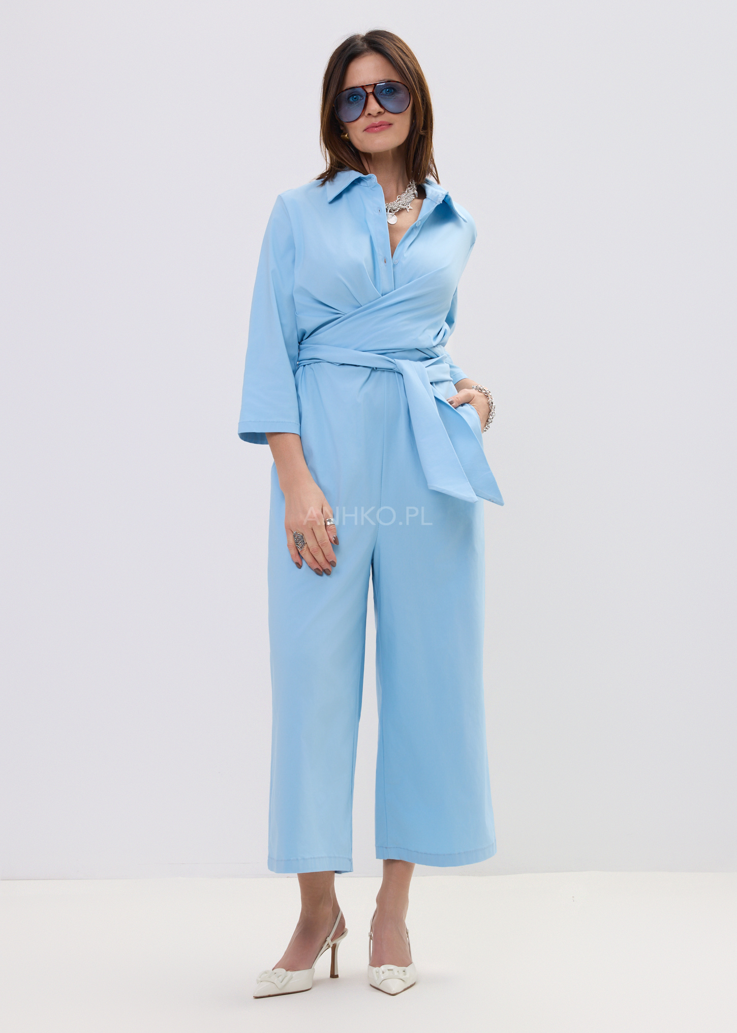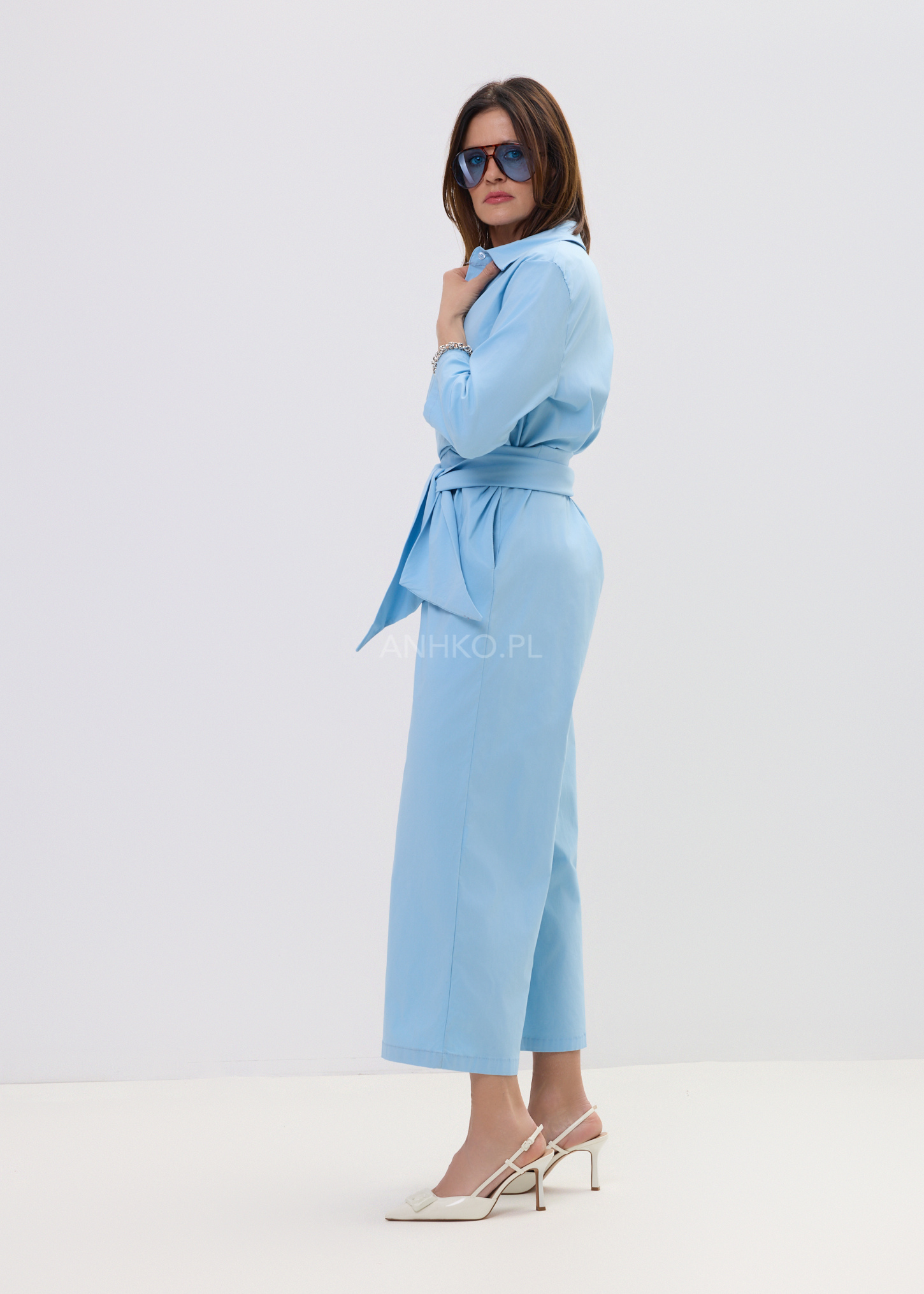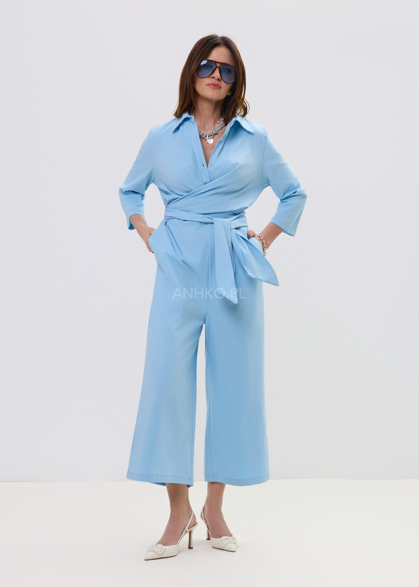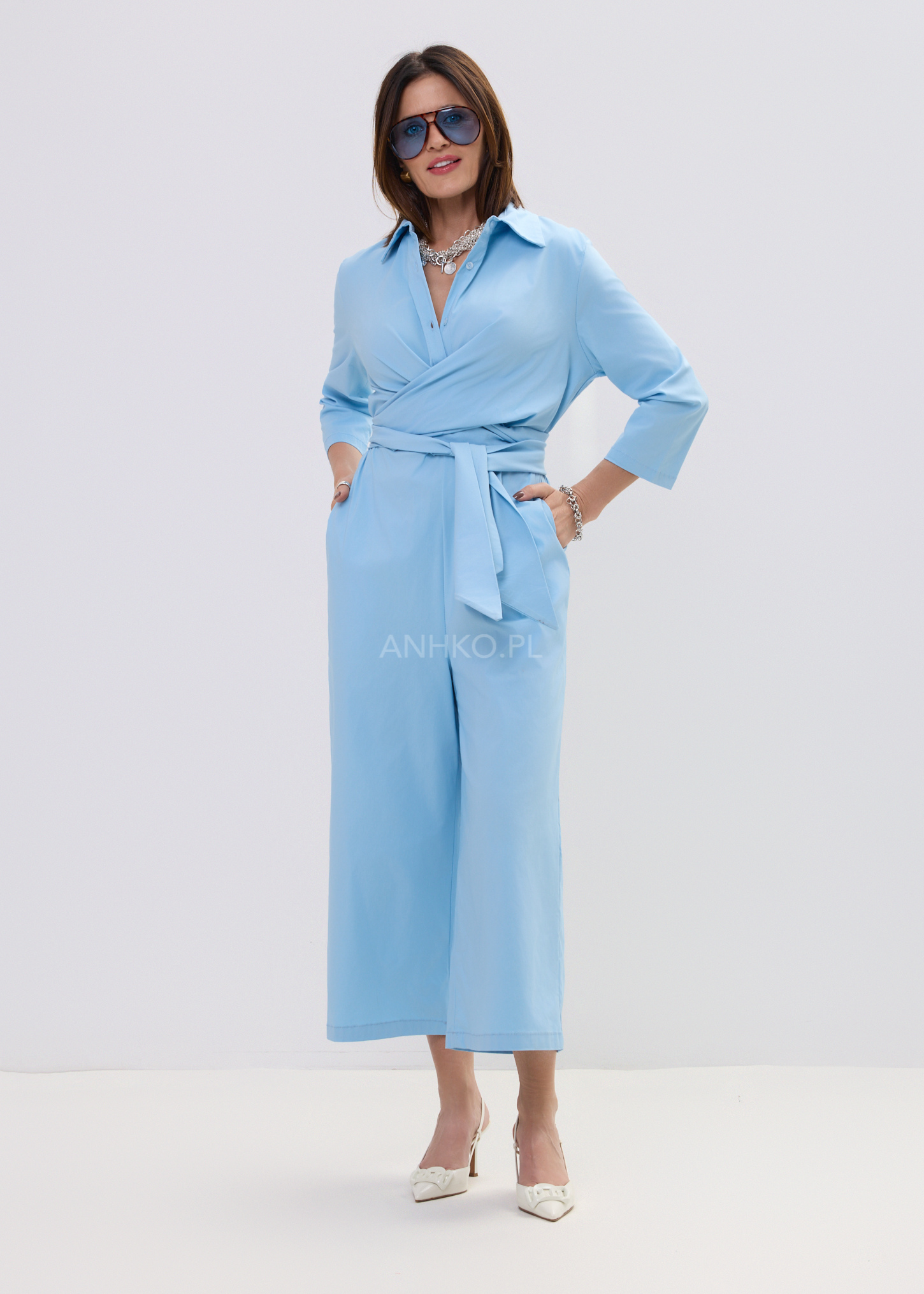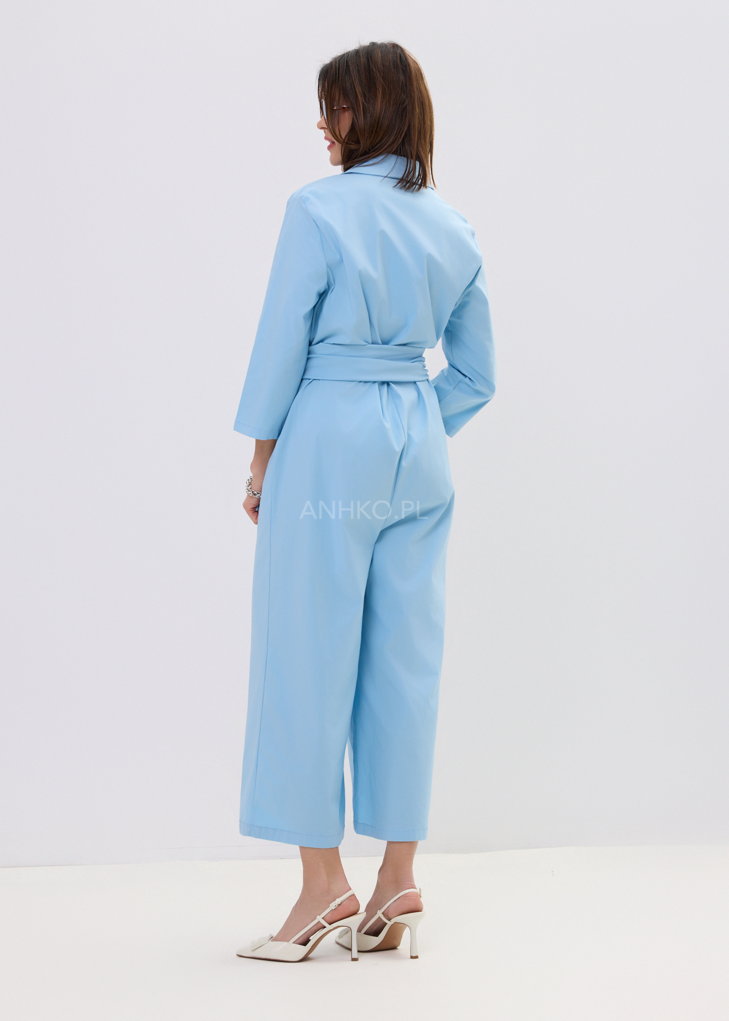 Ten niebieski kombinezon damski to połączenie minimalistycznej elegancji i nowoczesnego, miejskiego stylu. Model inspirowany klasyczną koszulą posiada kołnierzyk oraz zapięcie na guziki, dzięki czemu prezentuje się ponadczasowo i stylowo. Góra układa się swobodnie na sylwetce, a miękki materiał zapewnia komfort noszenia przez cały dzień.