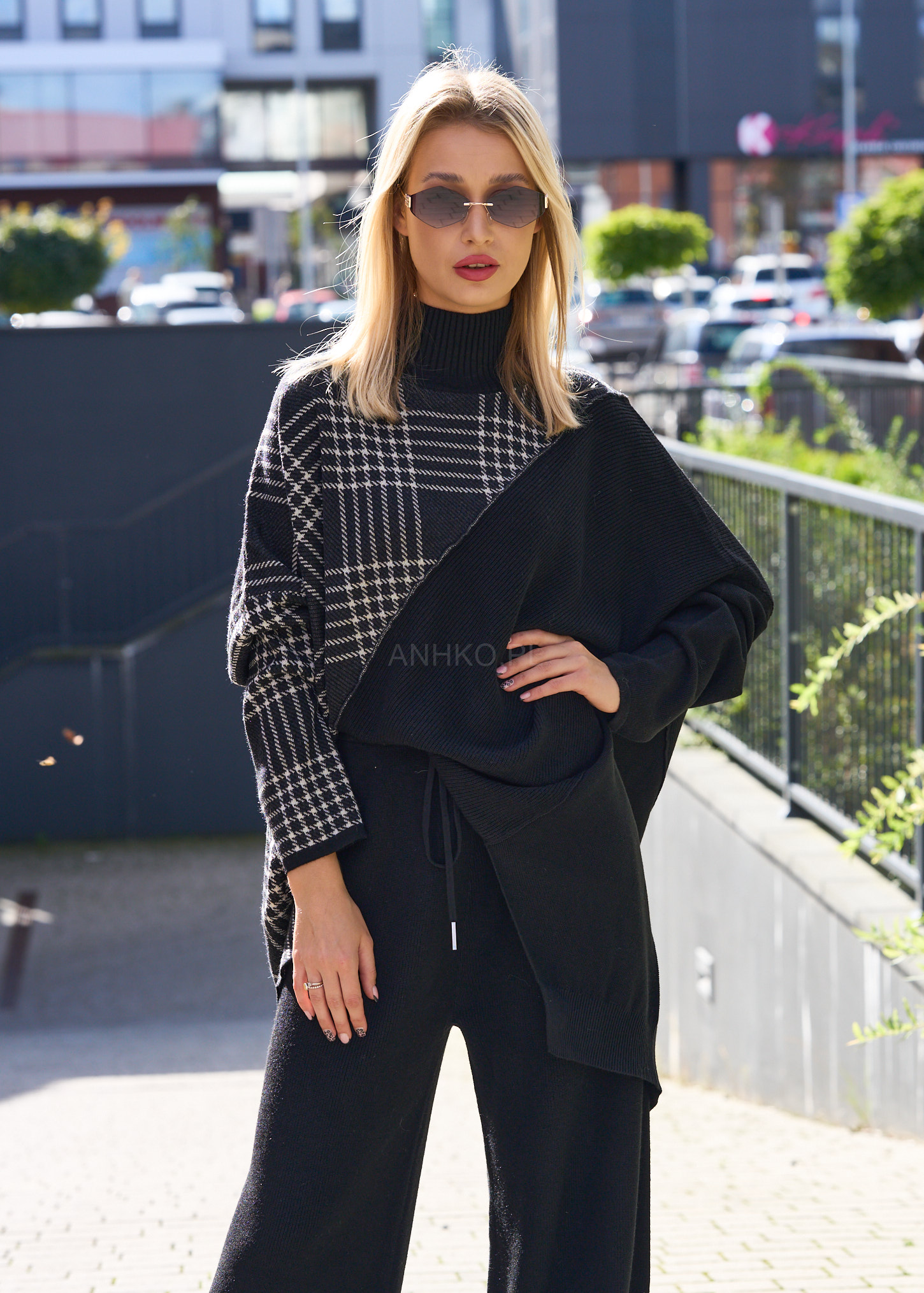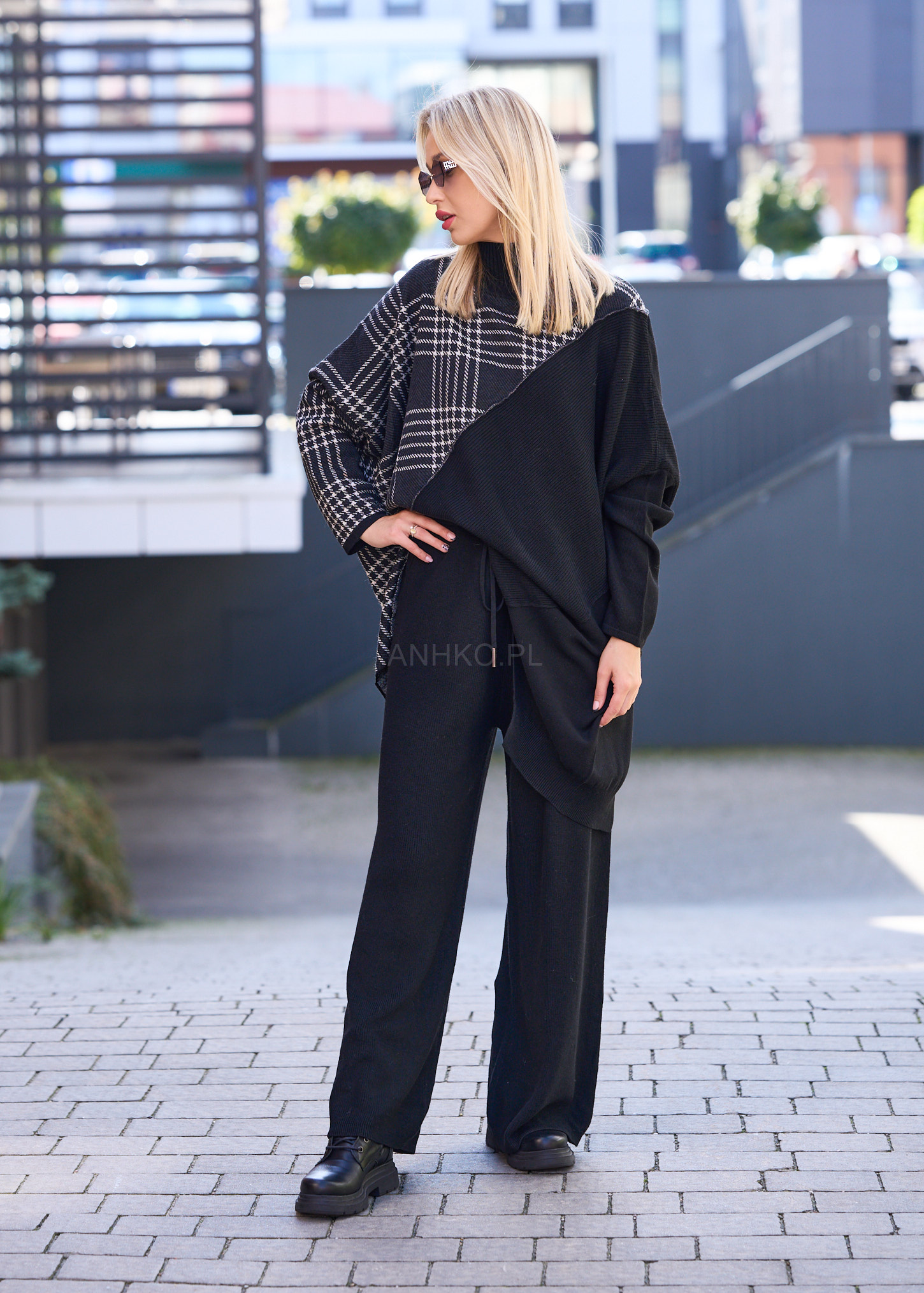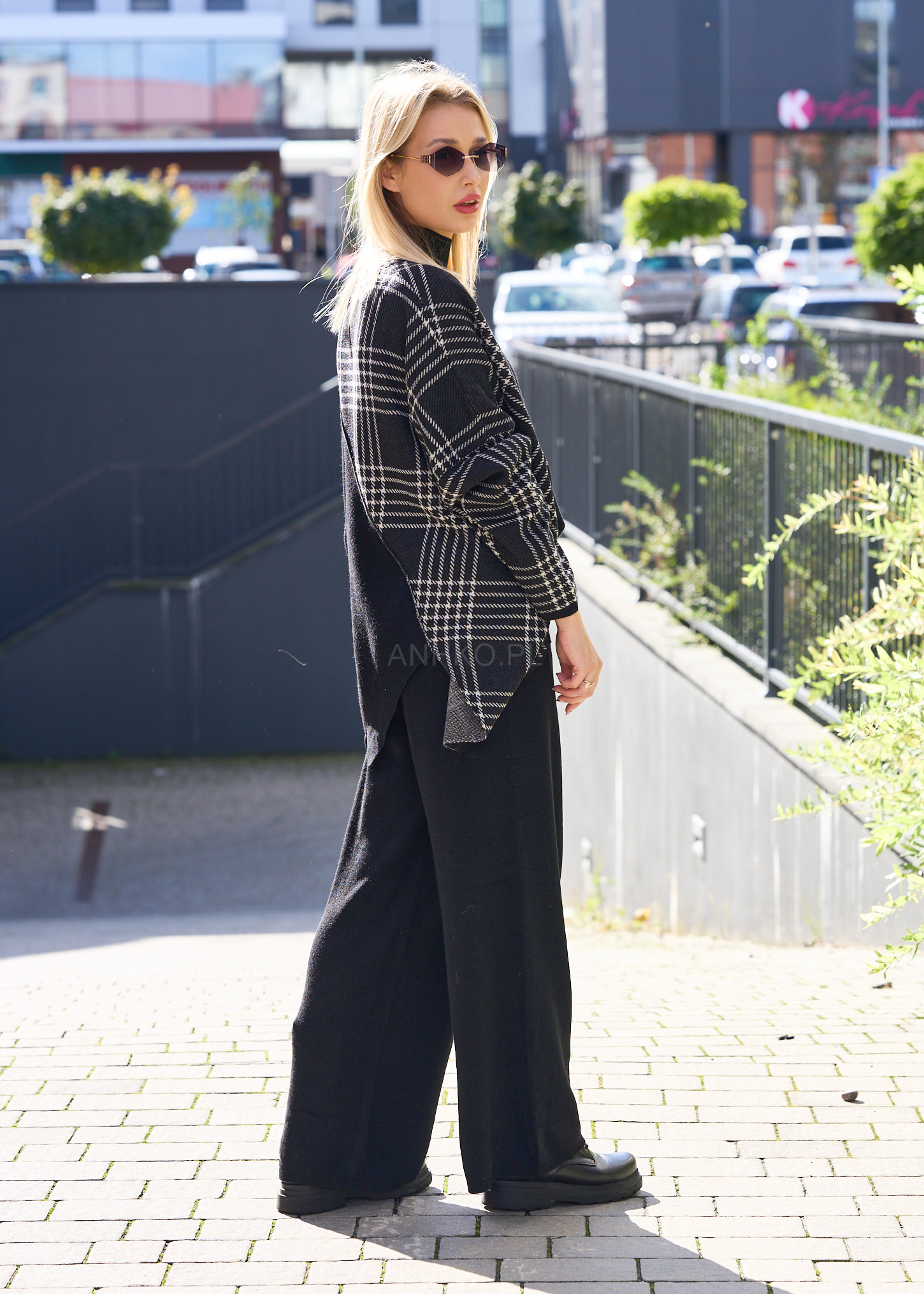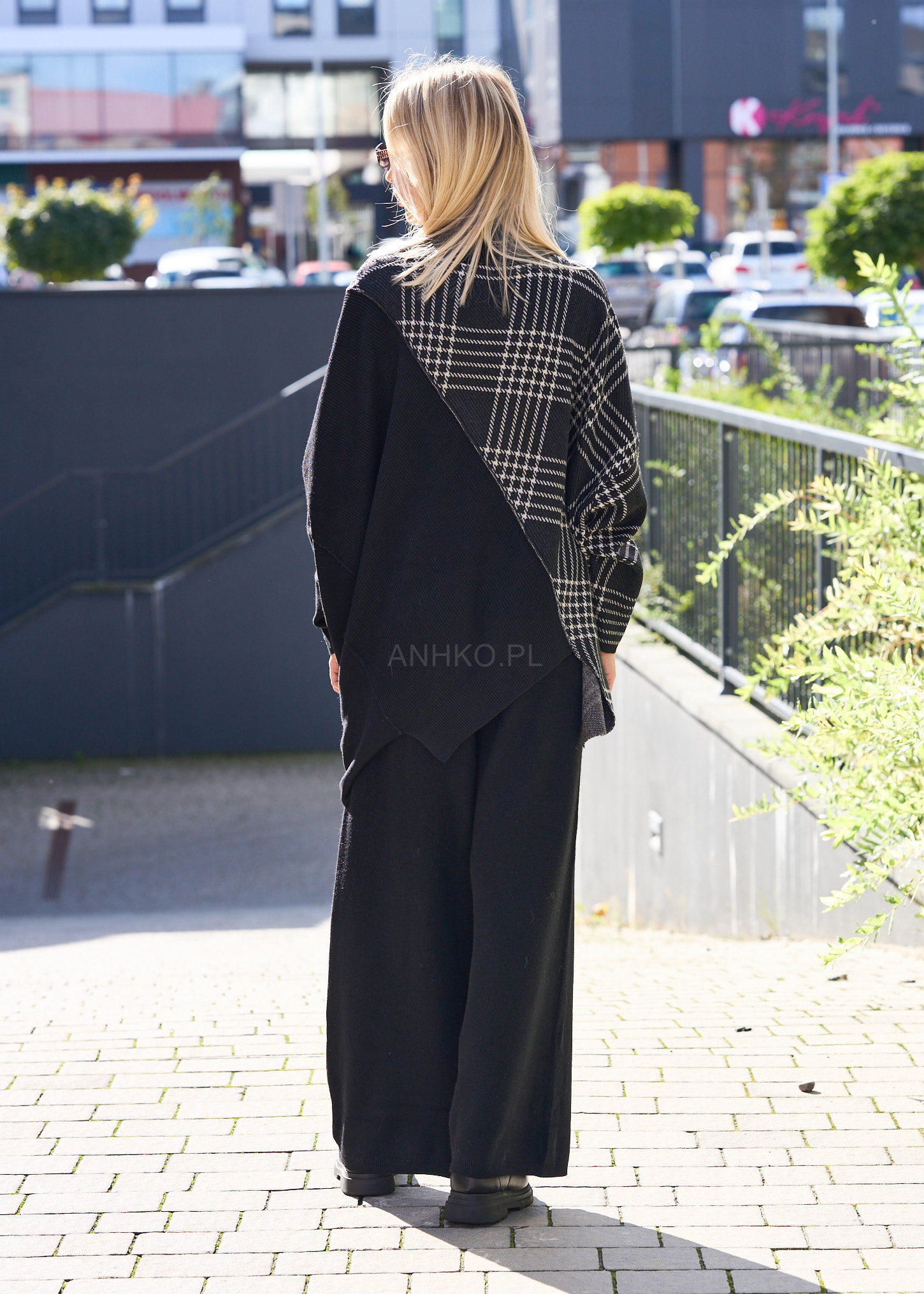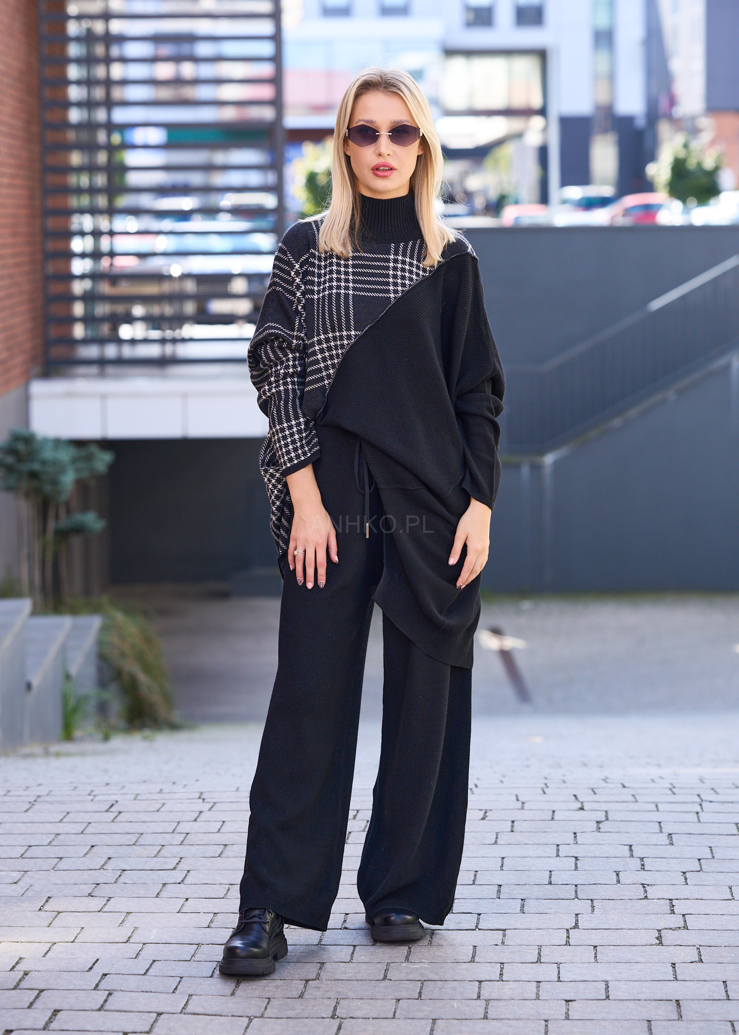 To wyjątkowe połączenie wygody i stylu. Składa się z luźnych, prążkowanych spodni z elastyczną talią i praktycznymi kieszeniami oraz ciepłego swetra o asymetrycznym kroju. Sweter w kontrastową kratę z półgolfem nadaje całości charakteru i oryginalności. Idealny zestaw do pracy, na spacer czy spotkanie z przyjaciółmi – sprawdzi się zarówno w casualowych, jak i bardziej eleganckich stylizacjach. Wystarczy dodać botki lub sneakersy, by stworzyć modny, kompletny look. Wysoka jakość dzianiny zapewnia komfort noszenia i trwałość przez wiele sezonów.