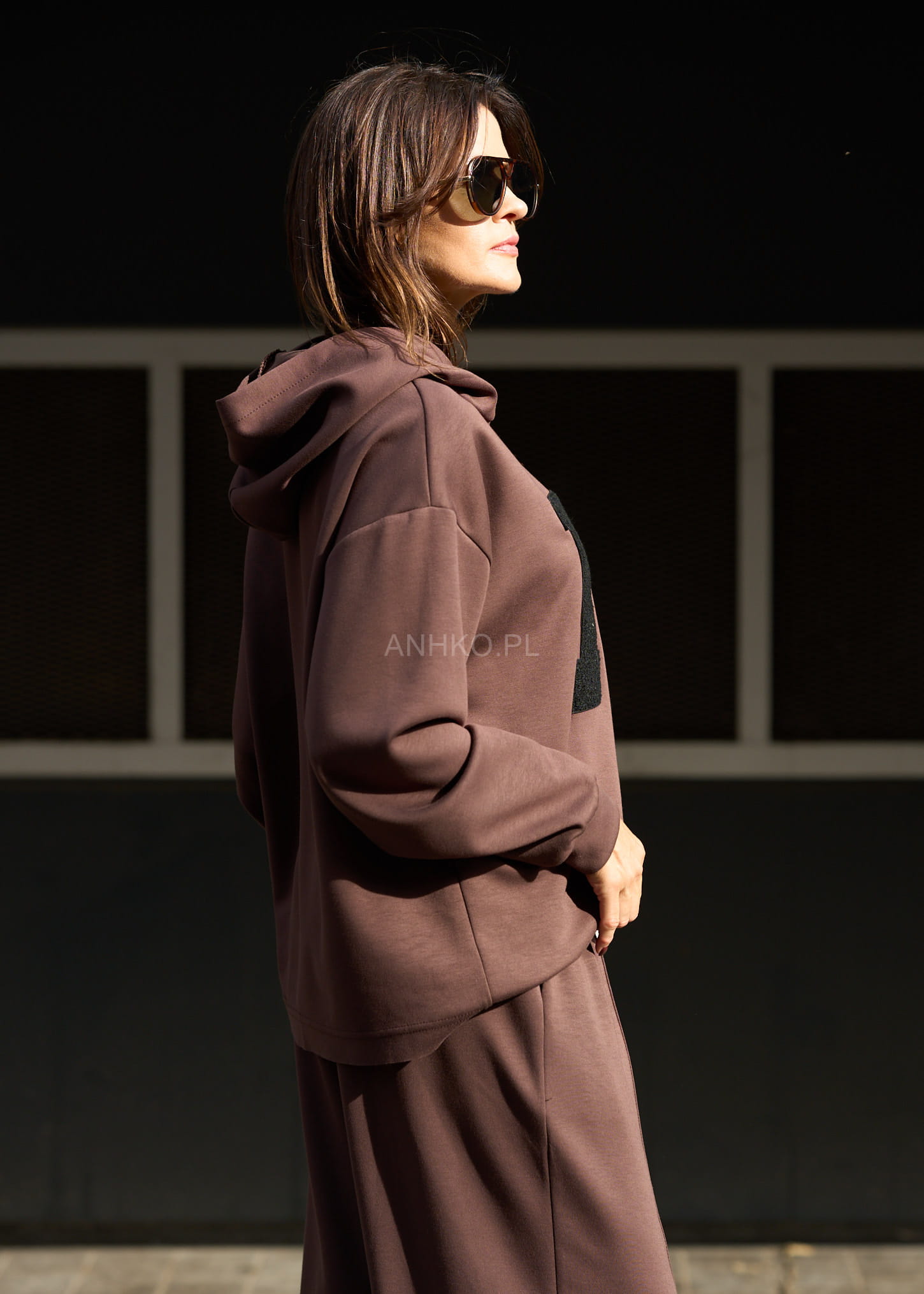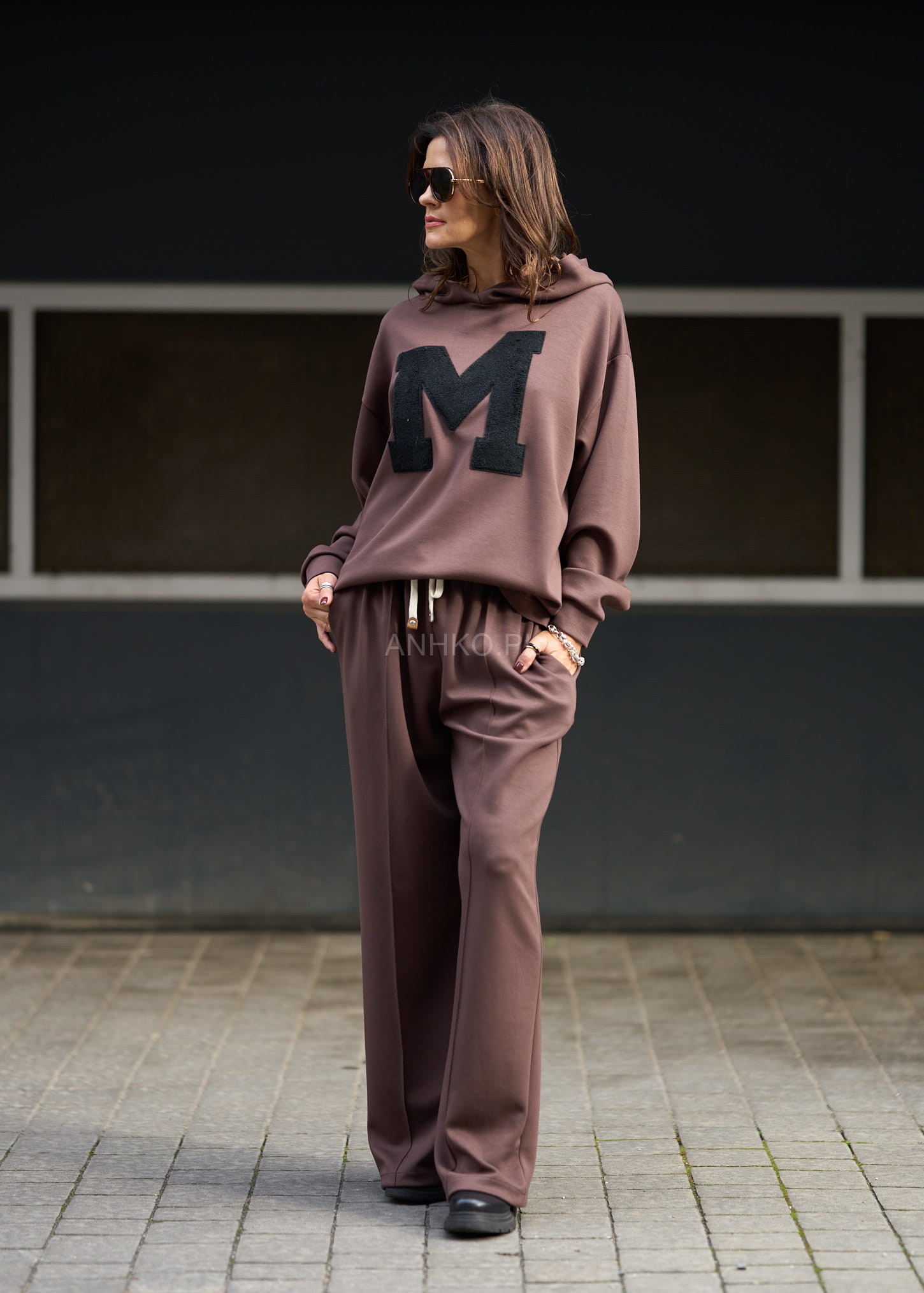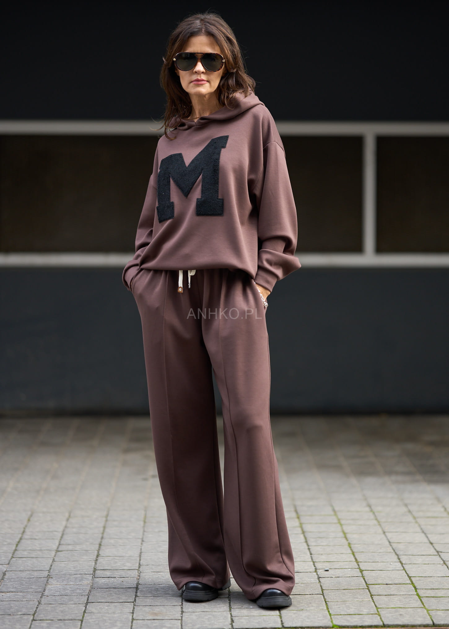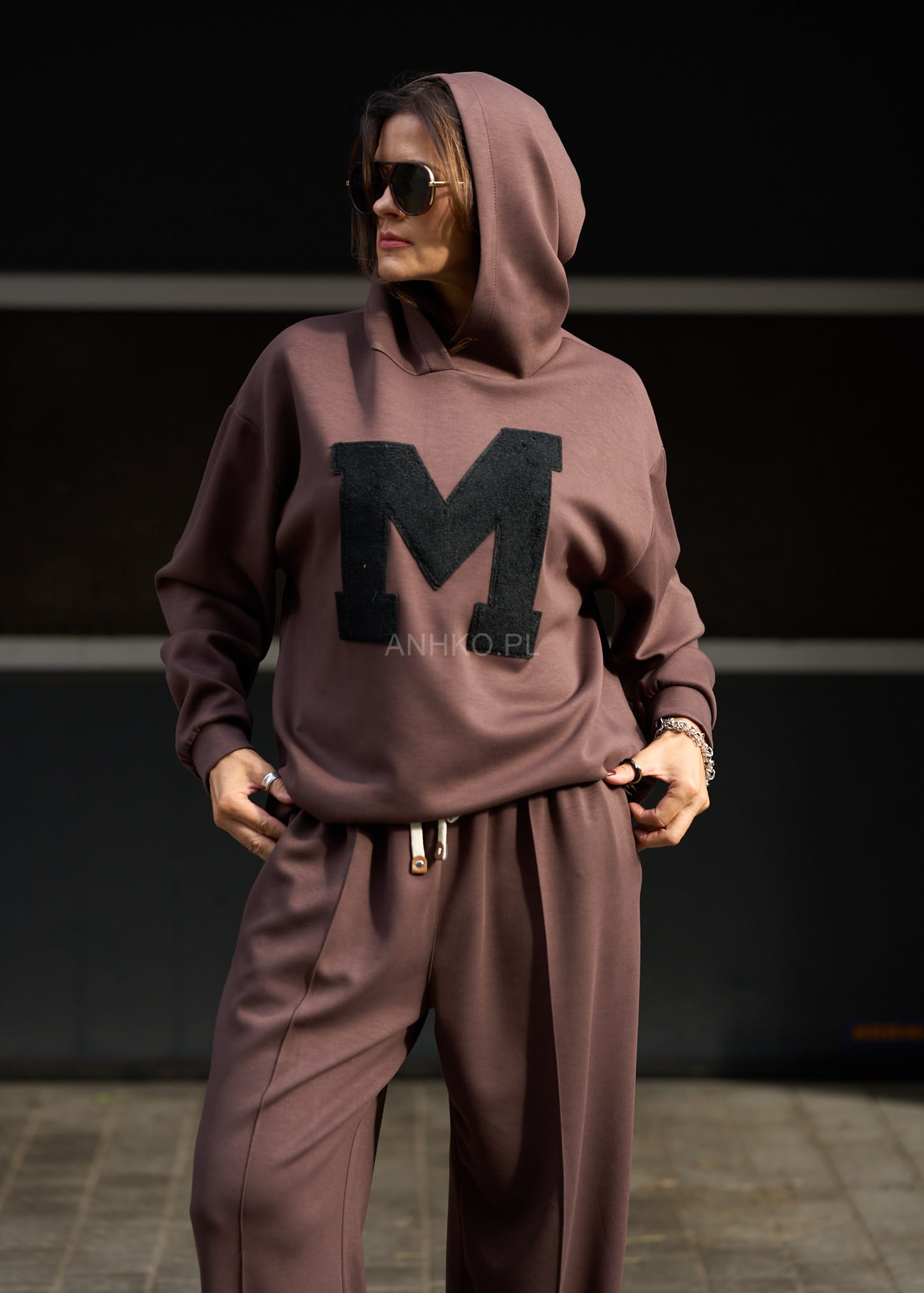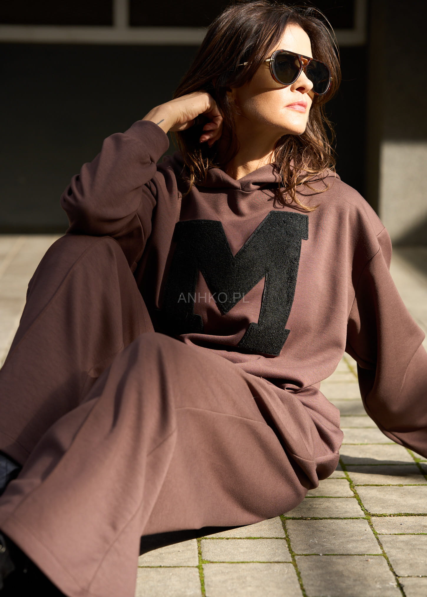 Ten komplet dresowy damski w głębokim, czekoladowym brązie łączy swobodę z dopracowaną, miejską estetyką. Oversize’owa bluza z kapturem miękko opada na sylwetkę, tworząc luźną linię ramion, a szerokie spodnie z wysokim stanem pięknie wydłużają nogi. Kontrastowa, naszywana litera „M” nadaje całości wyrazistego, streetwearowego akcentu.