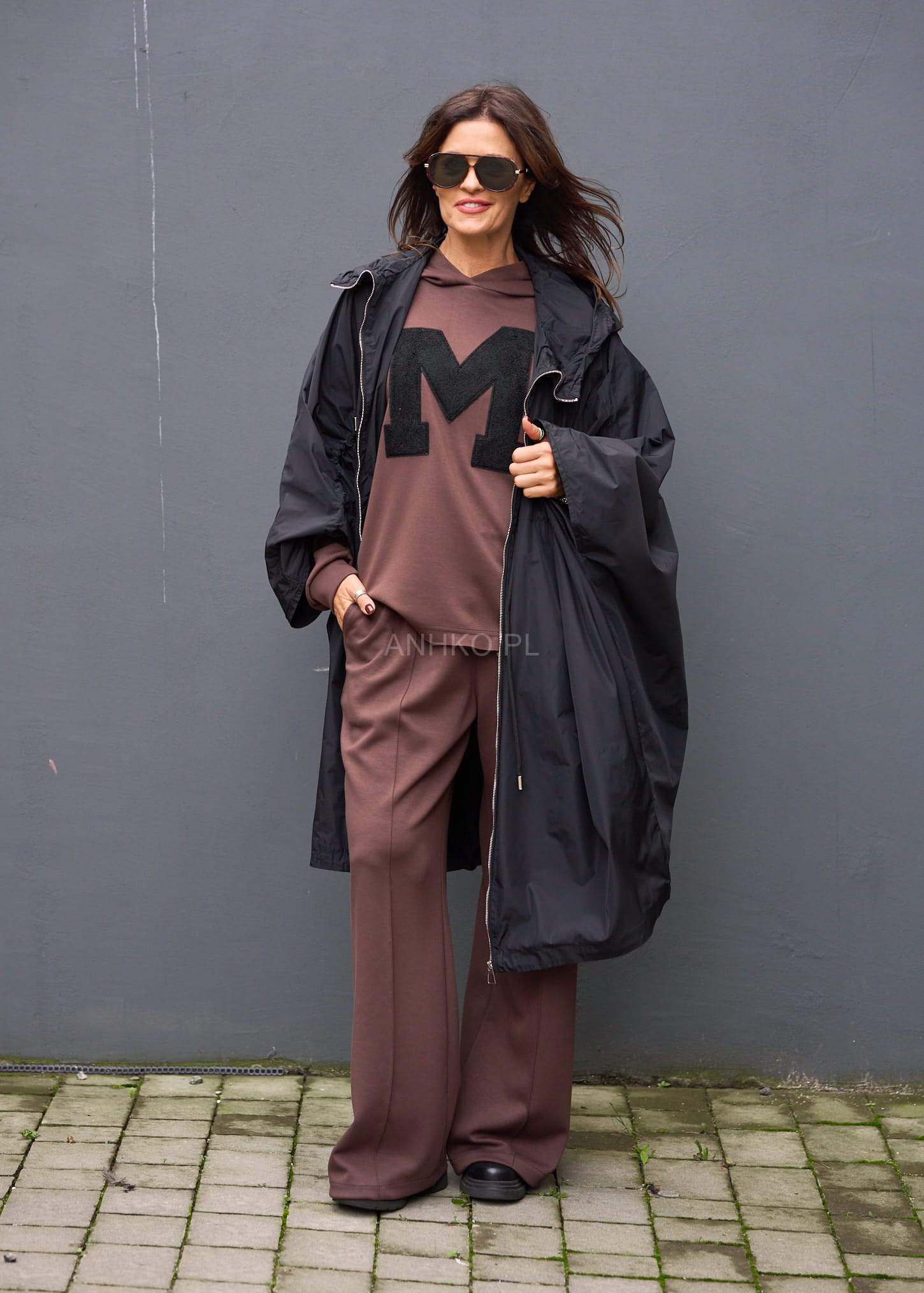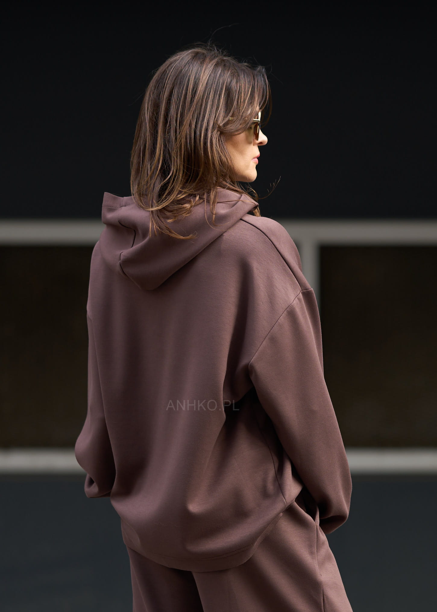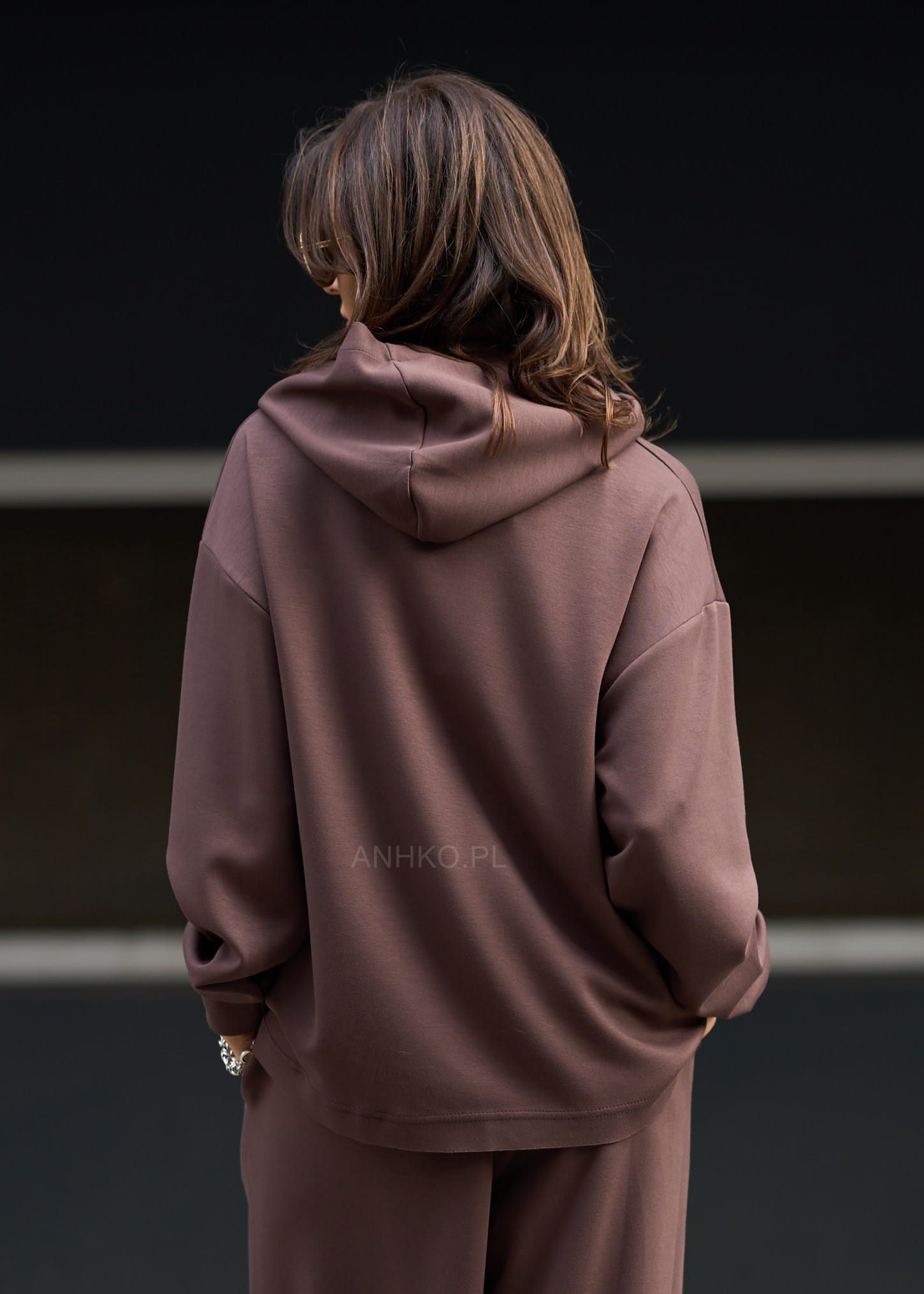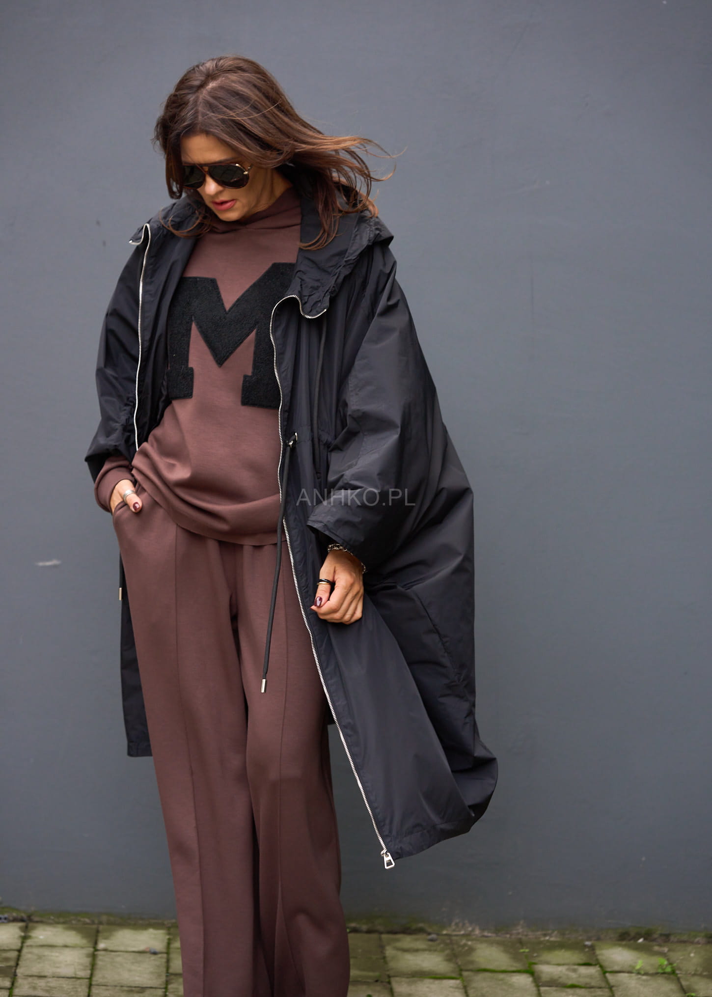 Ten komplet dresowy damski w głębokim, czekoladowym brązie łączy swobodę z dopracowaną, miejską estetyką. Oversize’owa bluza z kapturem miękko opada na sylwetkę, tworząc luźną linię ramion, a szerokie spodnie z wysokim stanem pięknie wydłużają nogi. Kontrastowa, naszywana litera „M” nadaje całości wyrazistego, streetwearowego akcentu.
