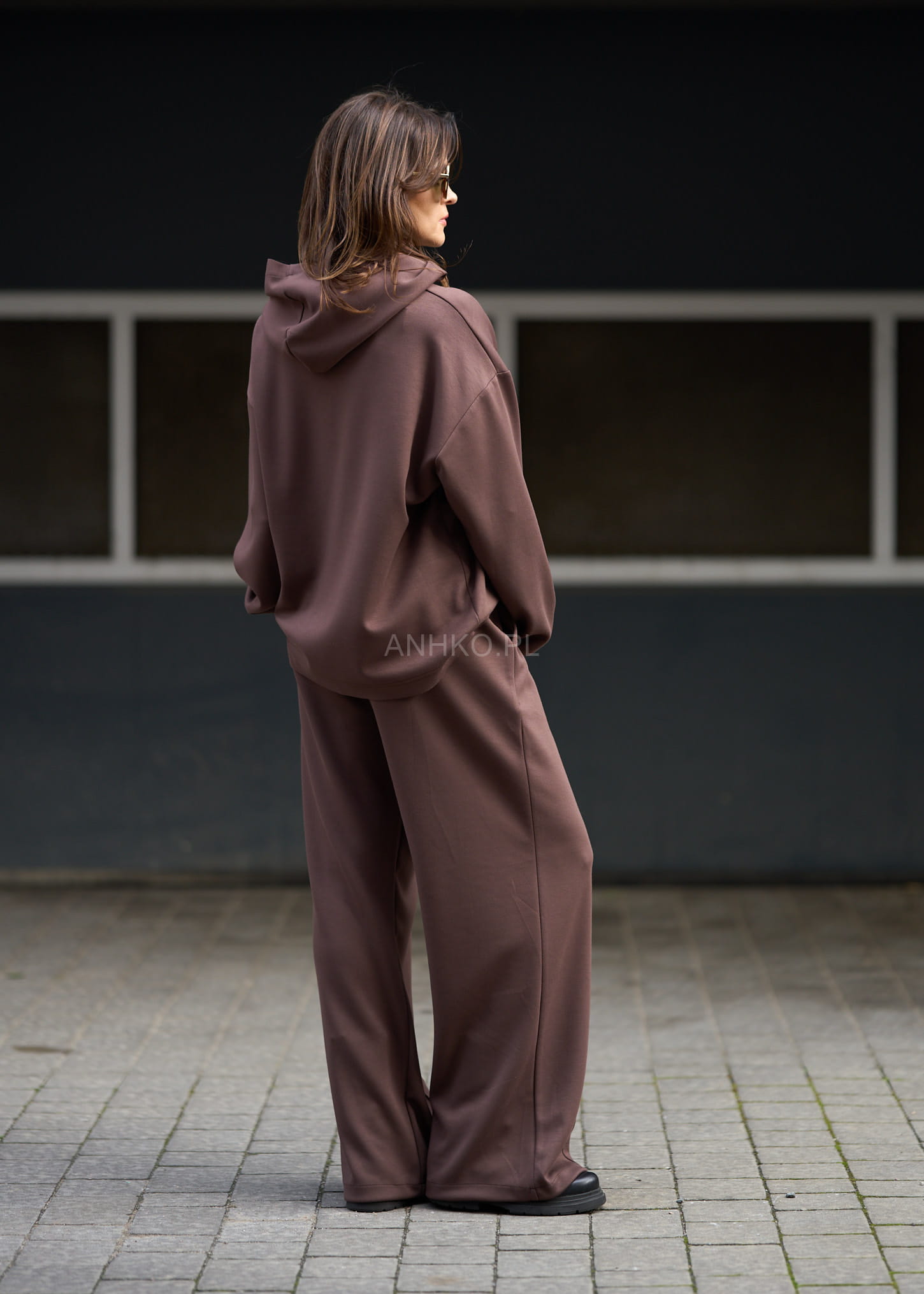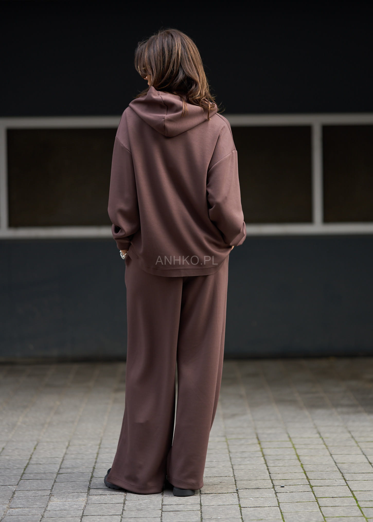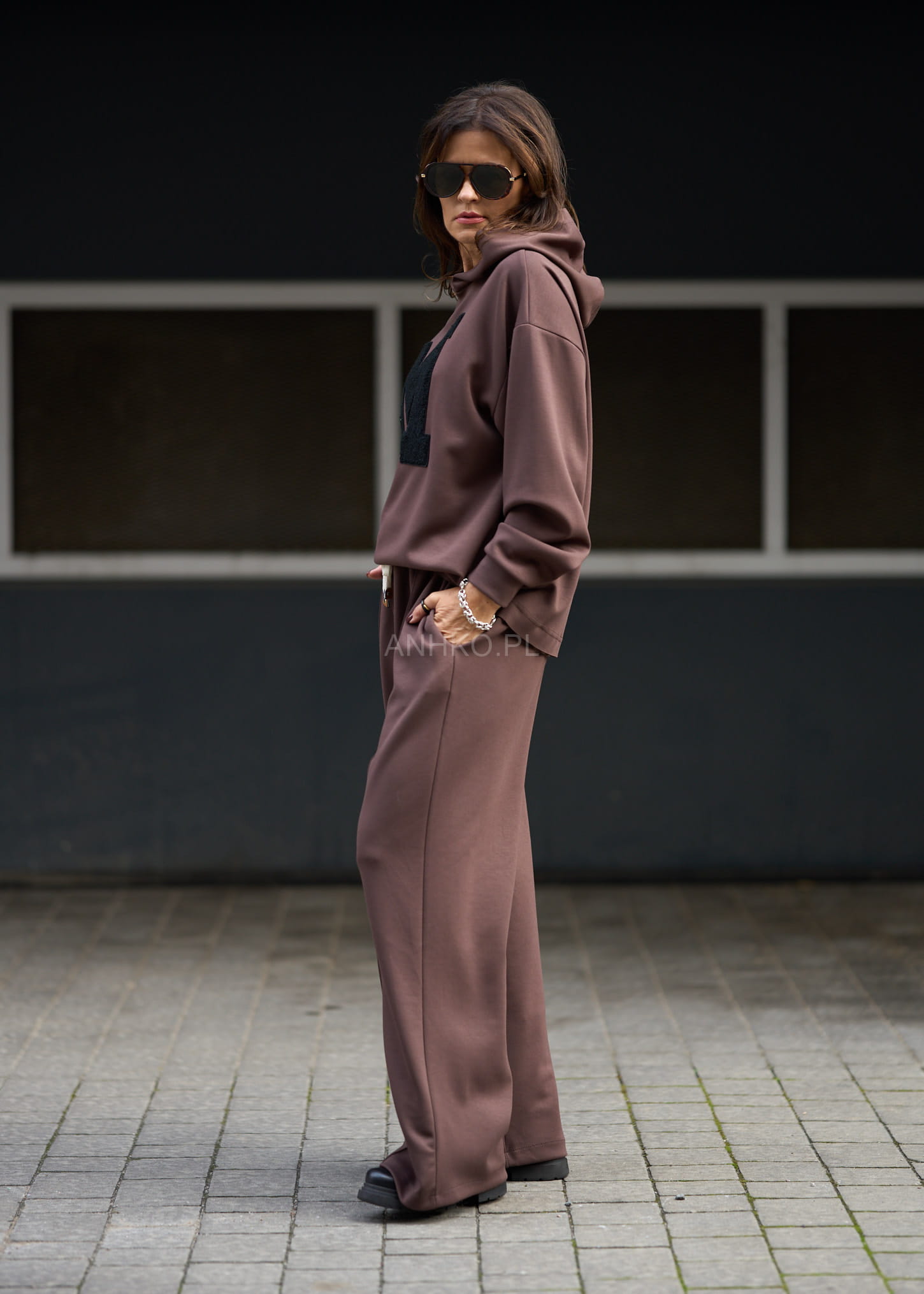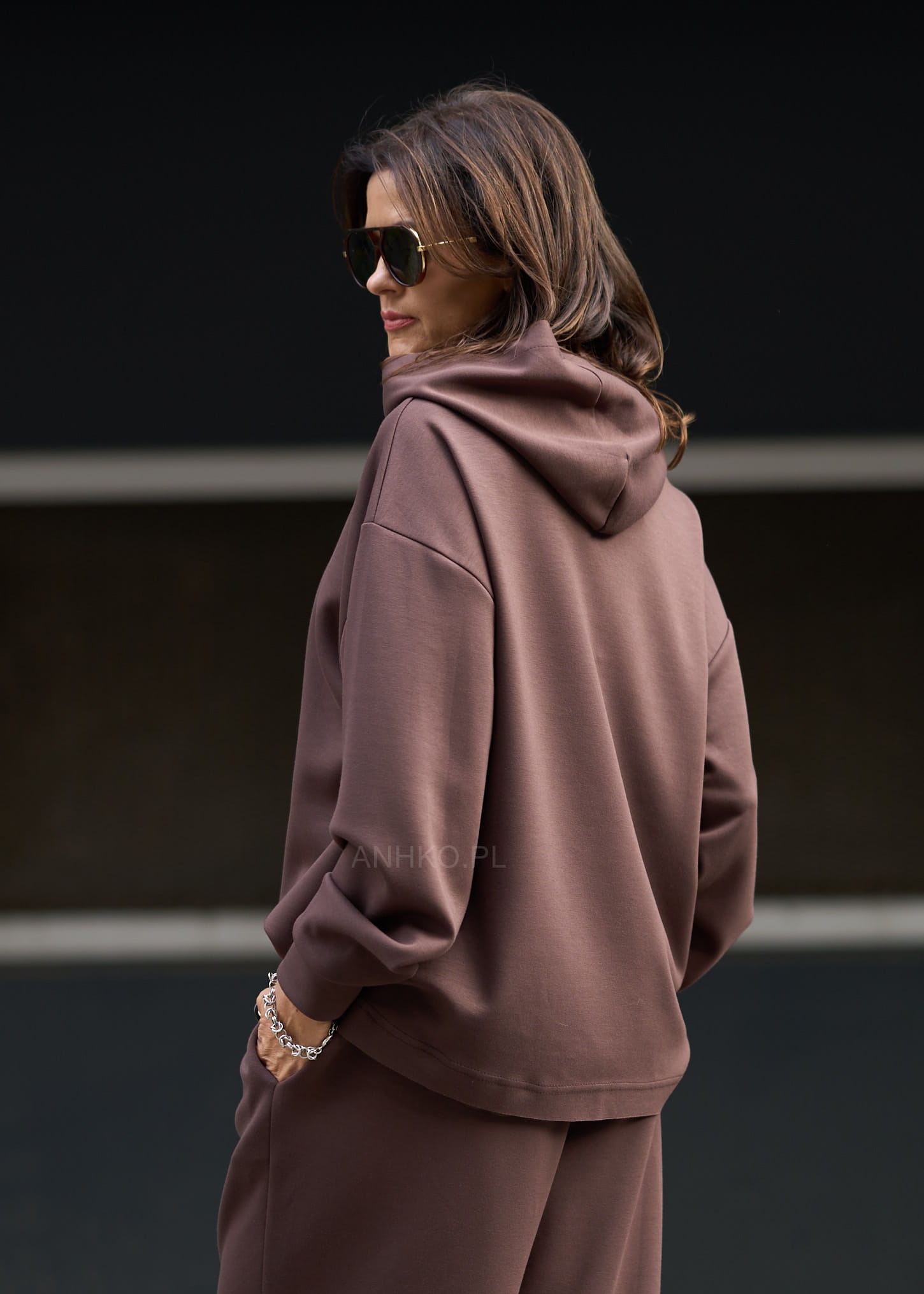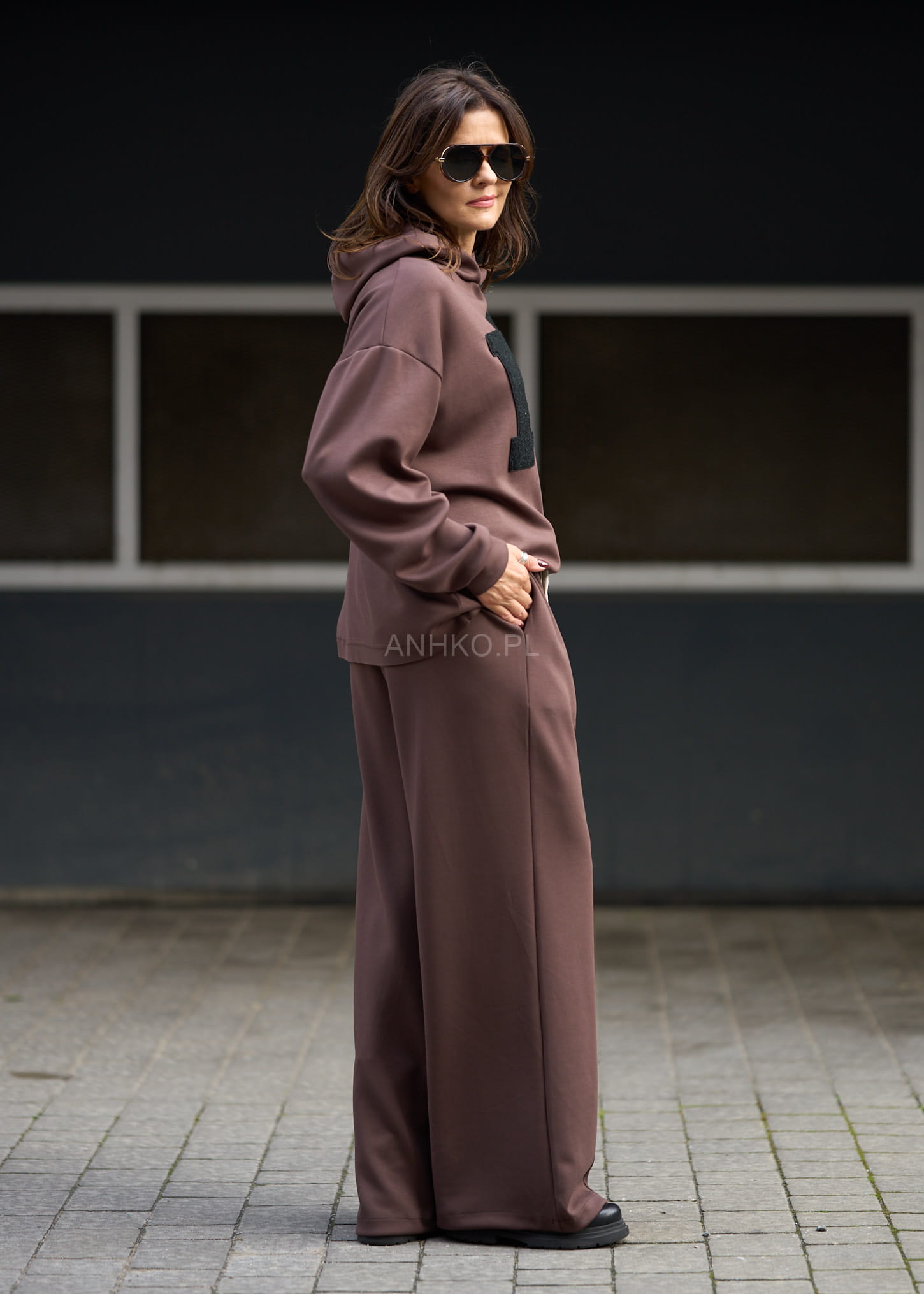 Ten komplet dresowy damski w głębokim, czekoladowym brązie łączy swobodę z dopracowaną, miejską estetyką. Oversize’owa bluza z kapturem miękko opada na sylwetkę, tworząc luźną linię ramion, a szerokie spodnie z wysokim stanem pięknie wydłużają nogi. Kontrastowa, naszywana litera „M” nadaje całości wyrazistego, streetwearowego akcentu.
