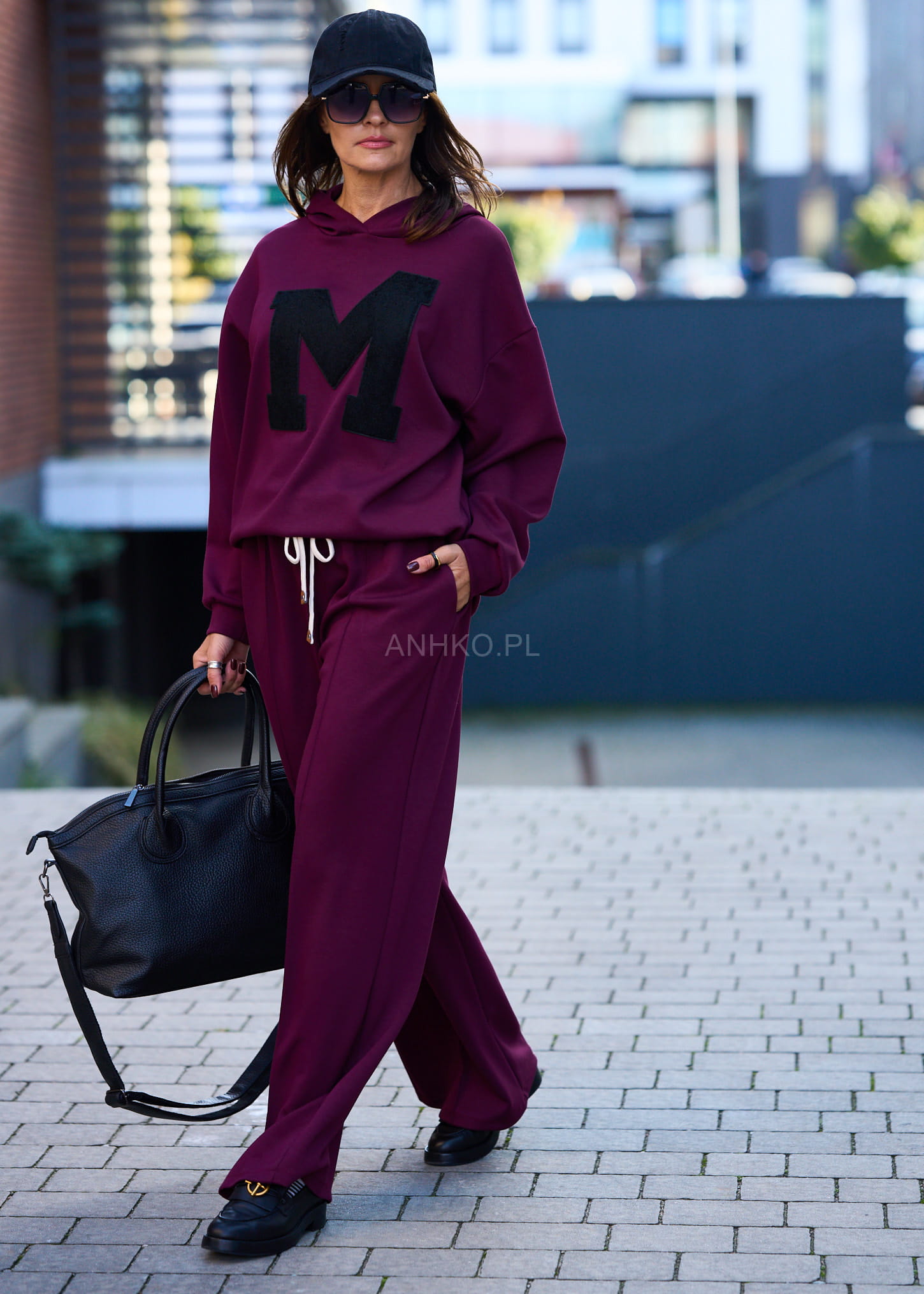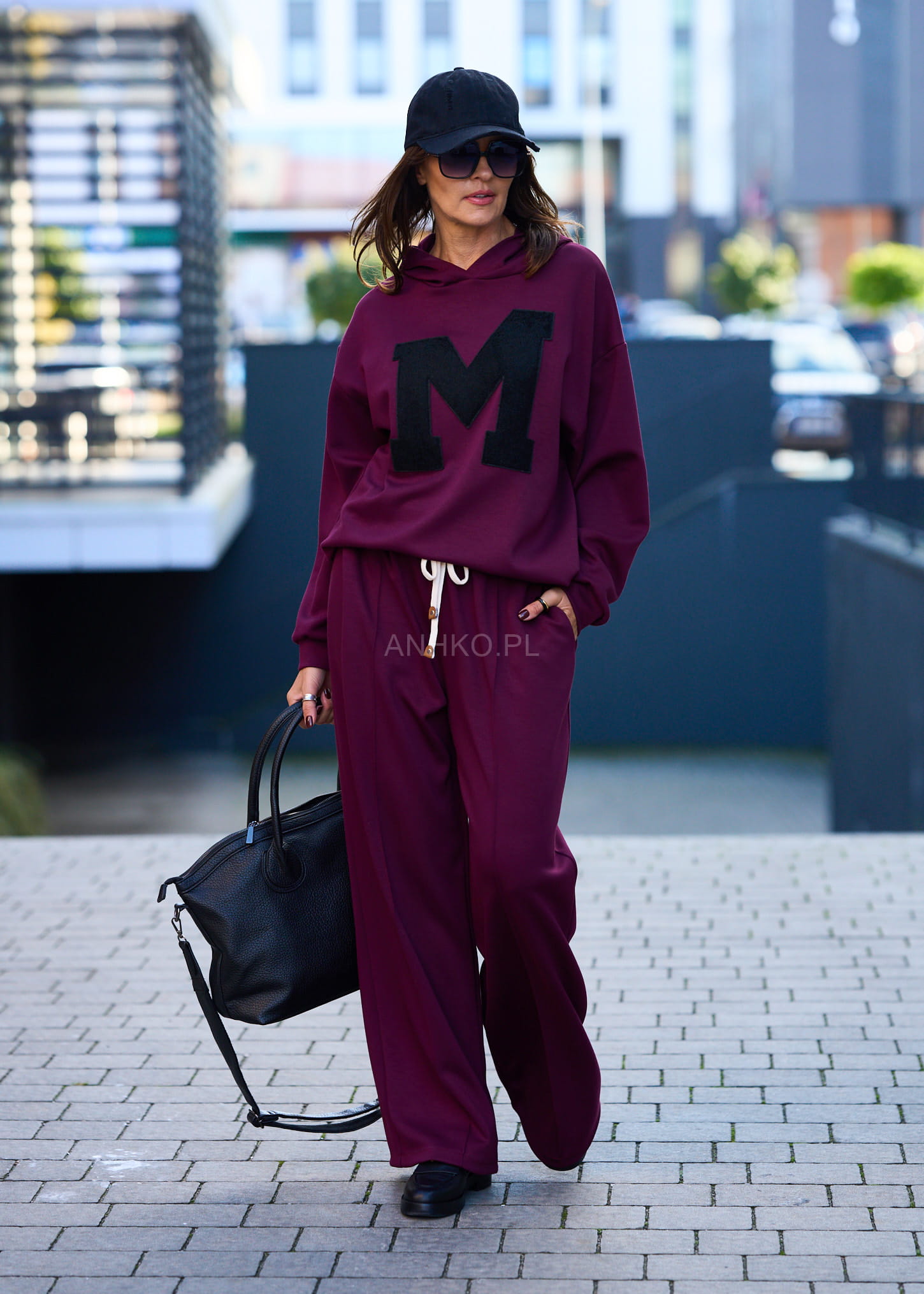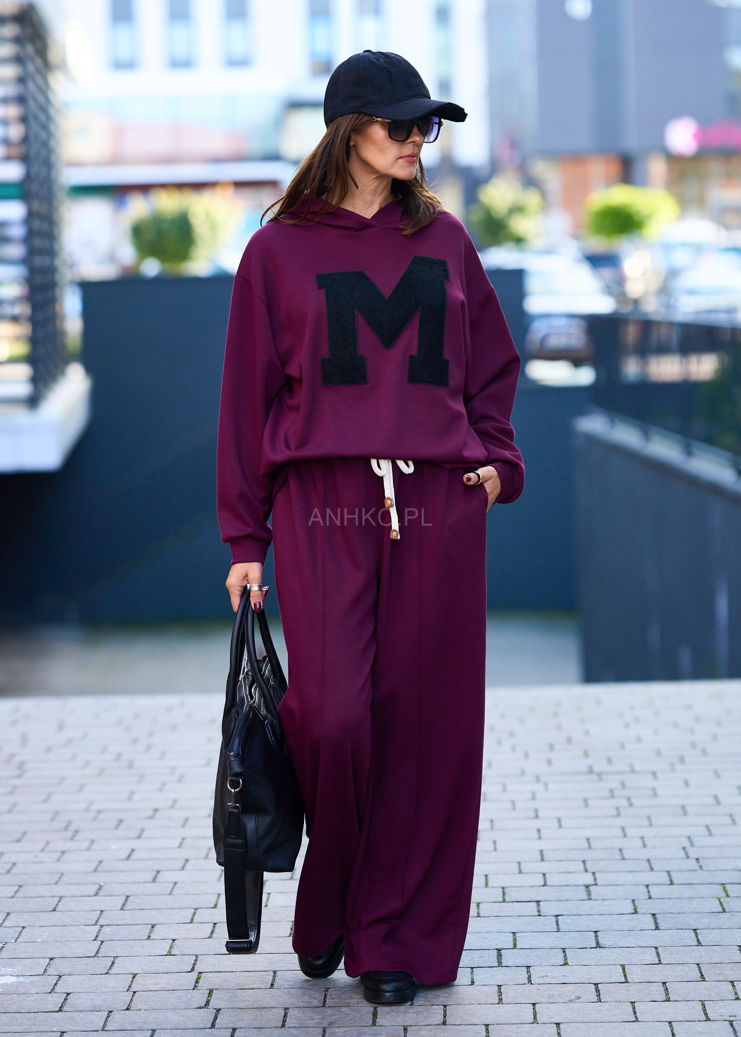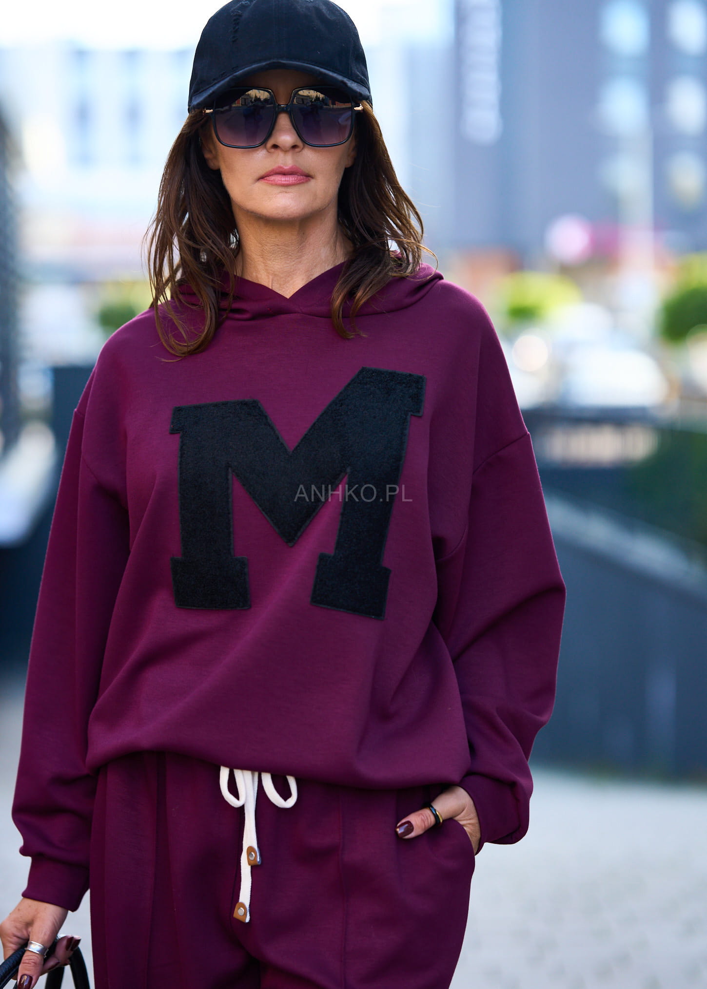 Ten komplet dresowy damski w głębokim burgundowym kolorze to połączenie wygody i streetwearowego charakteru. Oversize’owa bluza z kapturem miękko układa się na sylwetce, tworząc swobodną linię ramion, a szerokie spodnie z wysokim stanem i elastycznym pasem subtelnie wydłużają nogi. Kontrastowa, naszywana litera „M” nadaje całości mocnego, modowego akcentu.