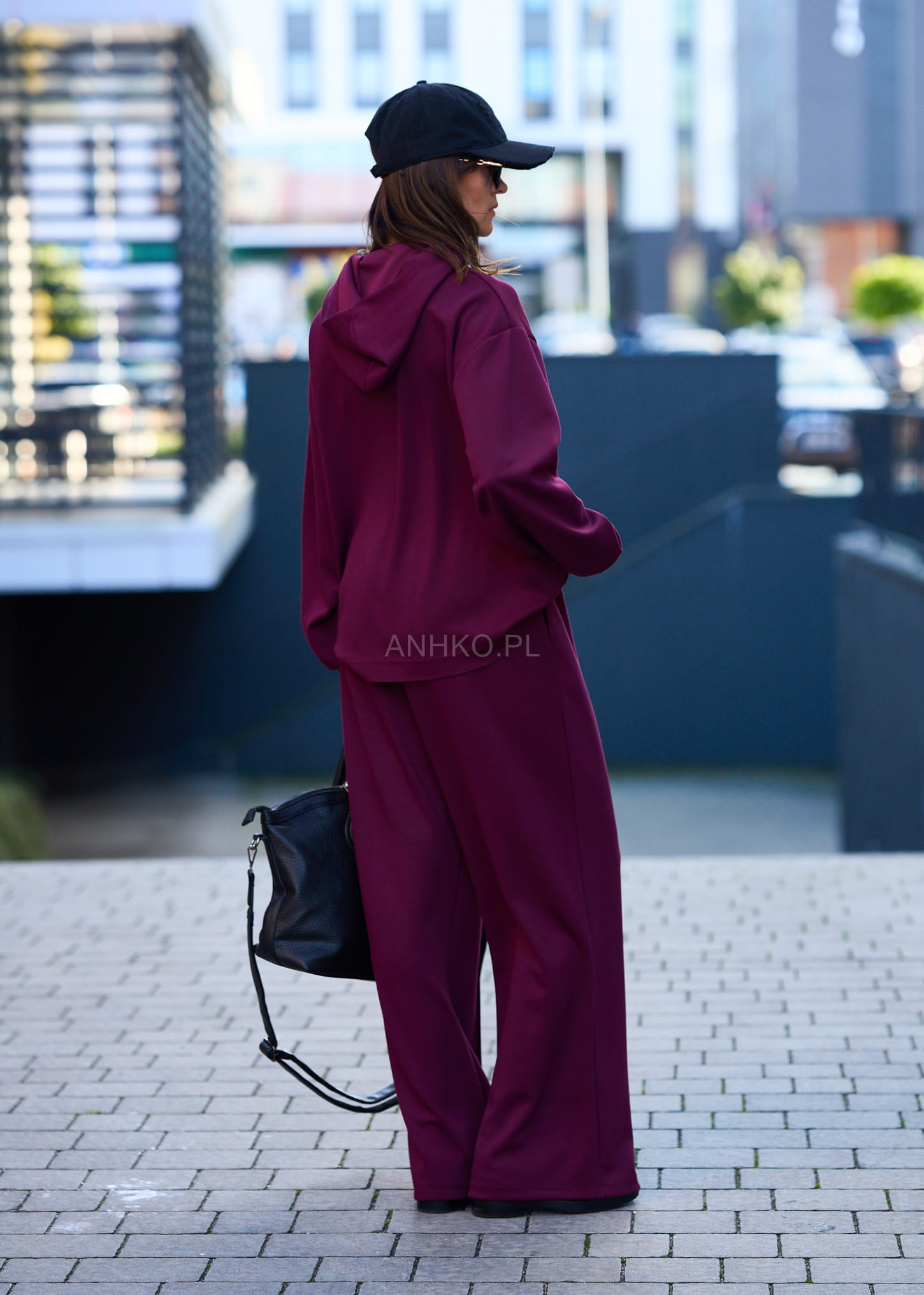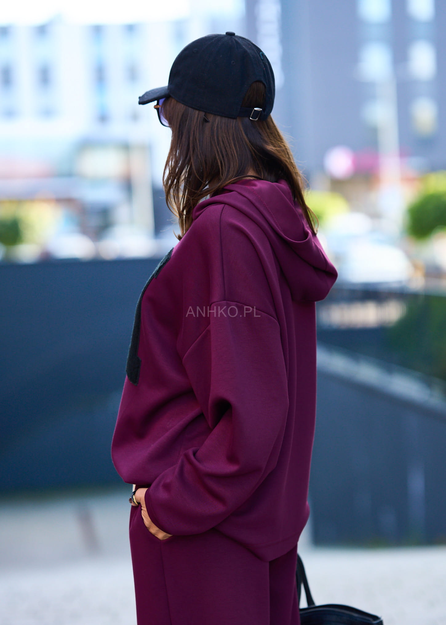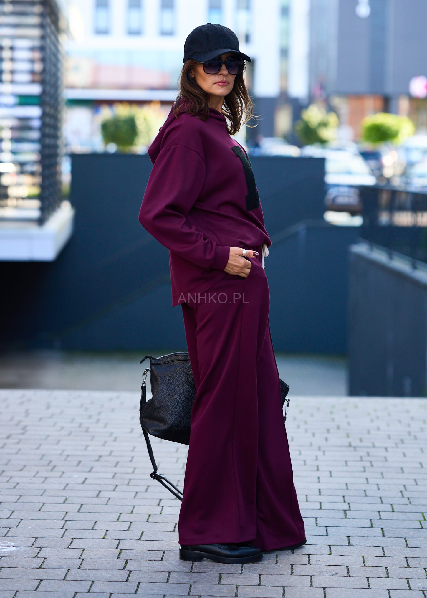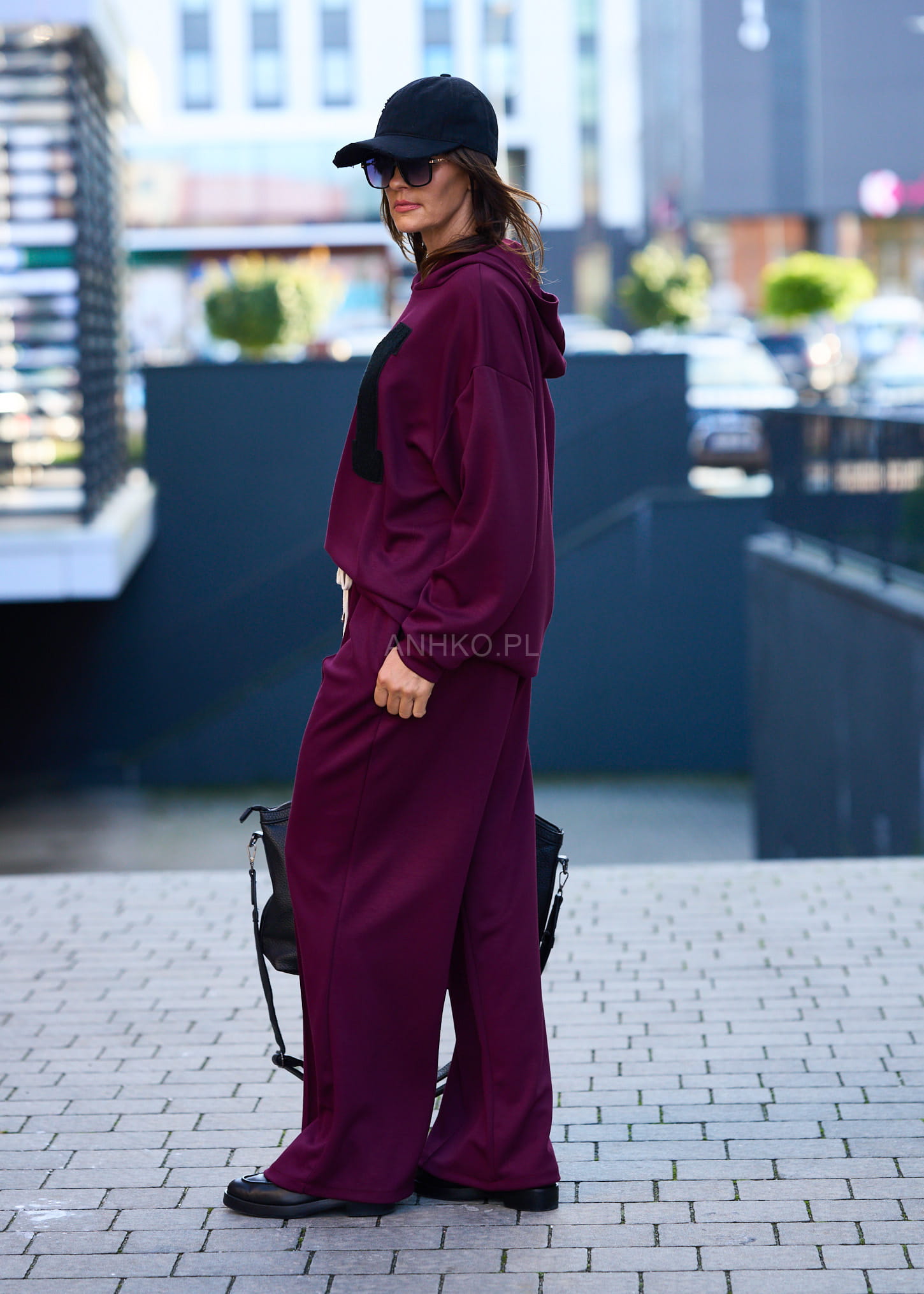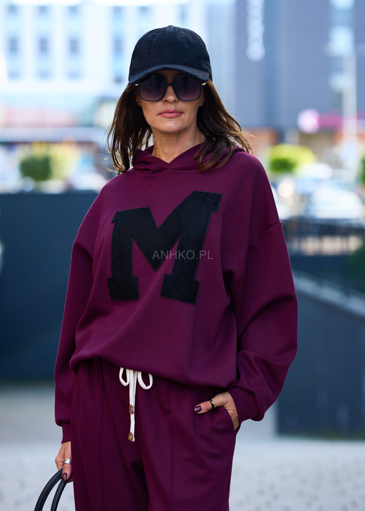 Ten komplet dresowy damski w głębokim burgundowym kolorze to połączenie wygody i streetwearowego charakteru. Oversize’owa bluza z kapturem miękko układa się na sylwetce, tworząc swobodną linię ramion, a szerokie spodnie z wysokim stanem i elastycznym pasem subtelnie wydłużają nogi. Kontrastowa, naszywana litera „M” nadaje całości mocnego, modowego akcentu.