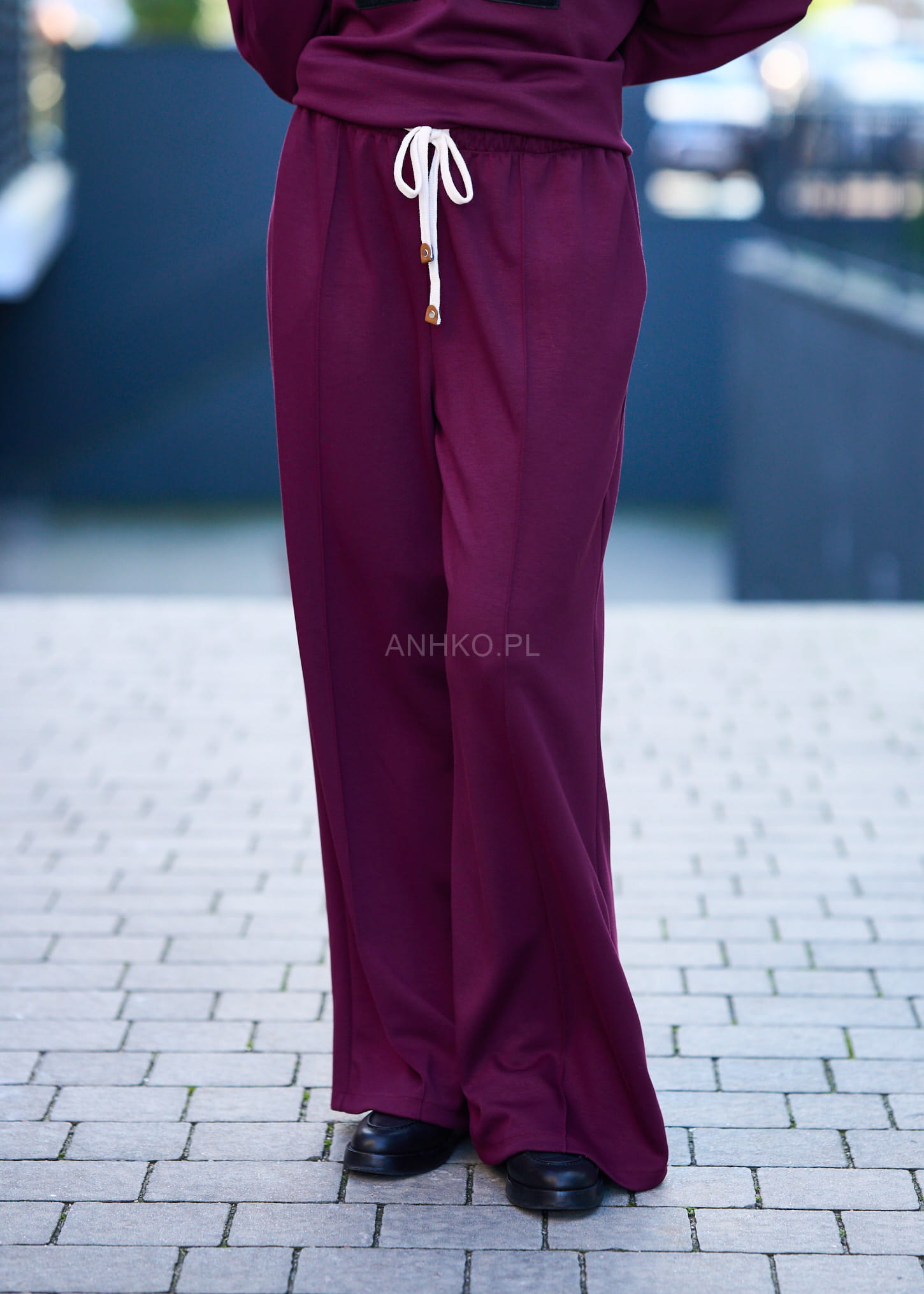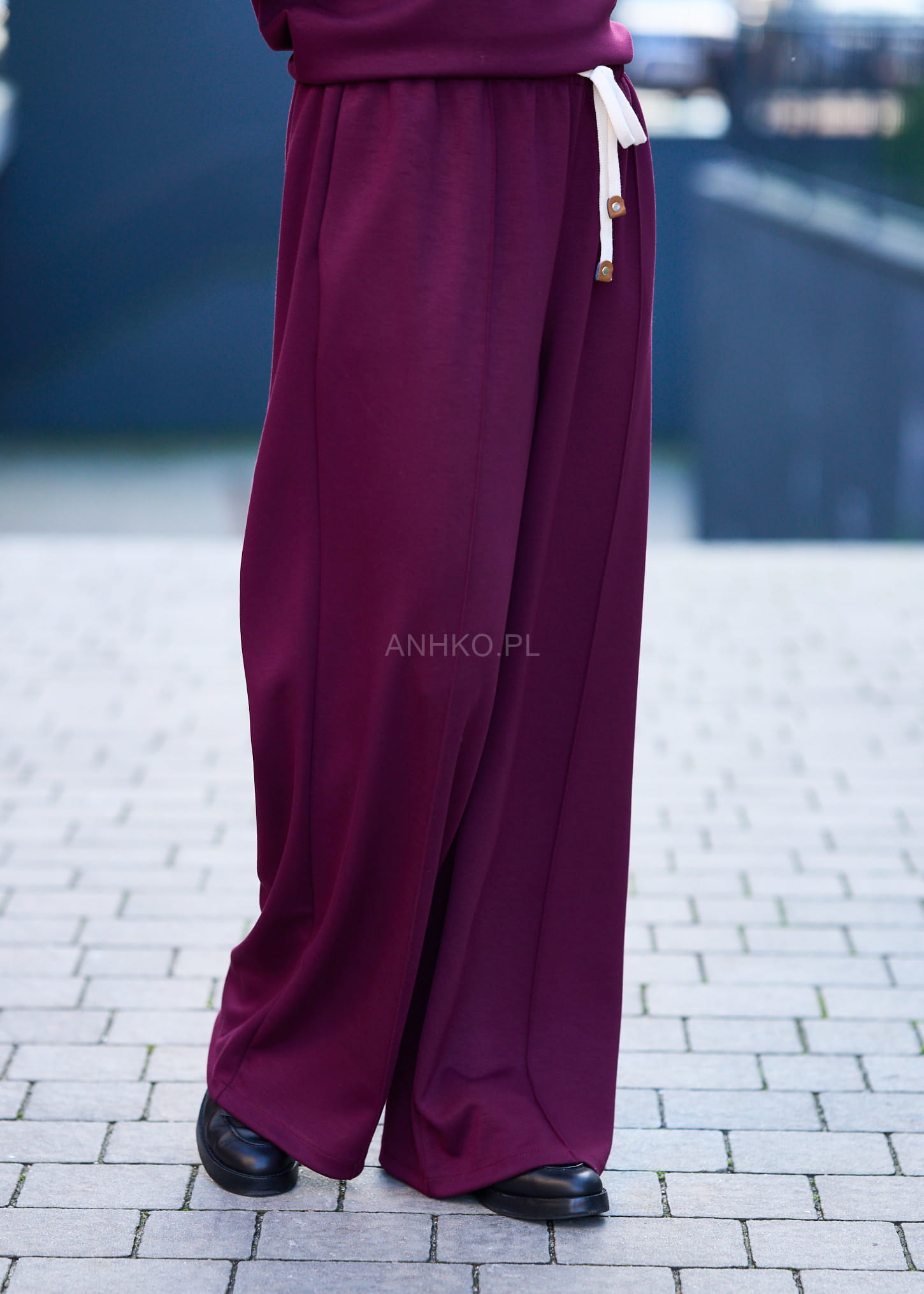 - Spodnie: Szeroka nogawka, wysoki stan i elastyczny pas ze sznurkiem.