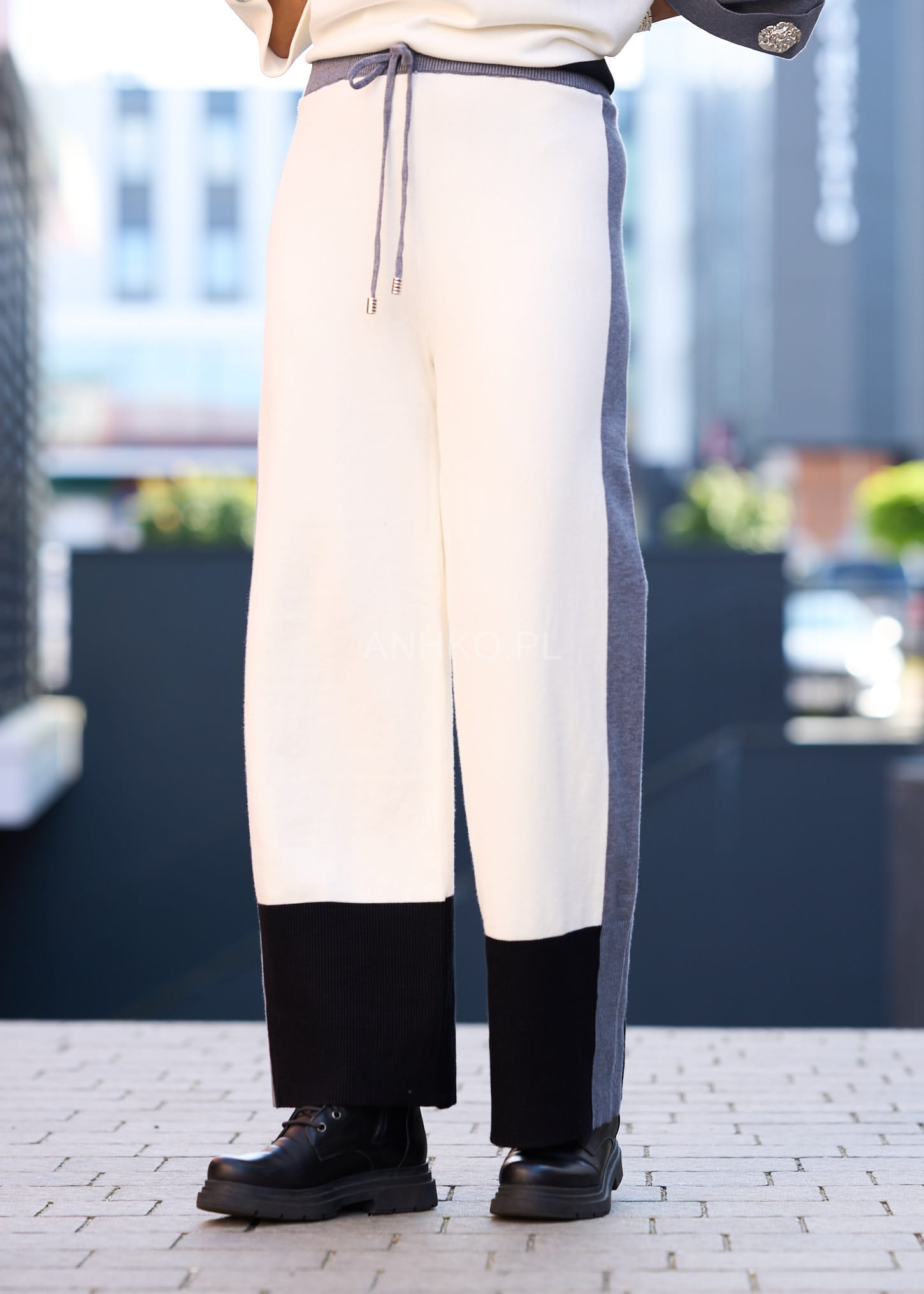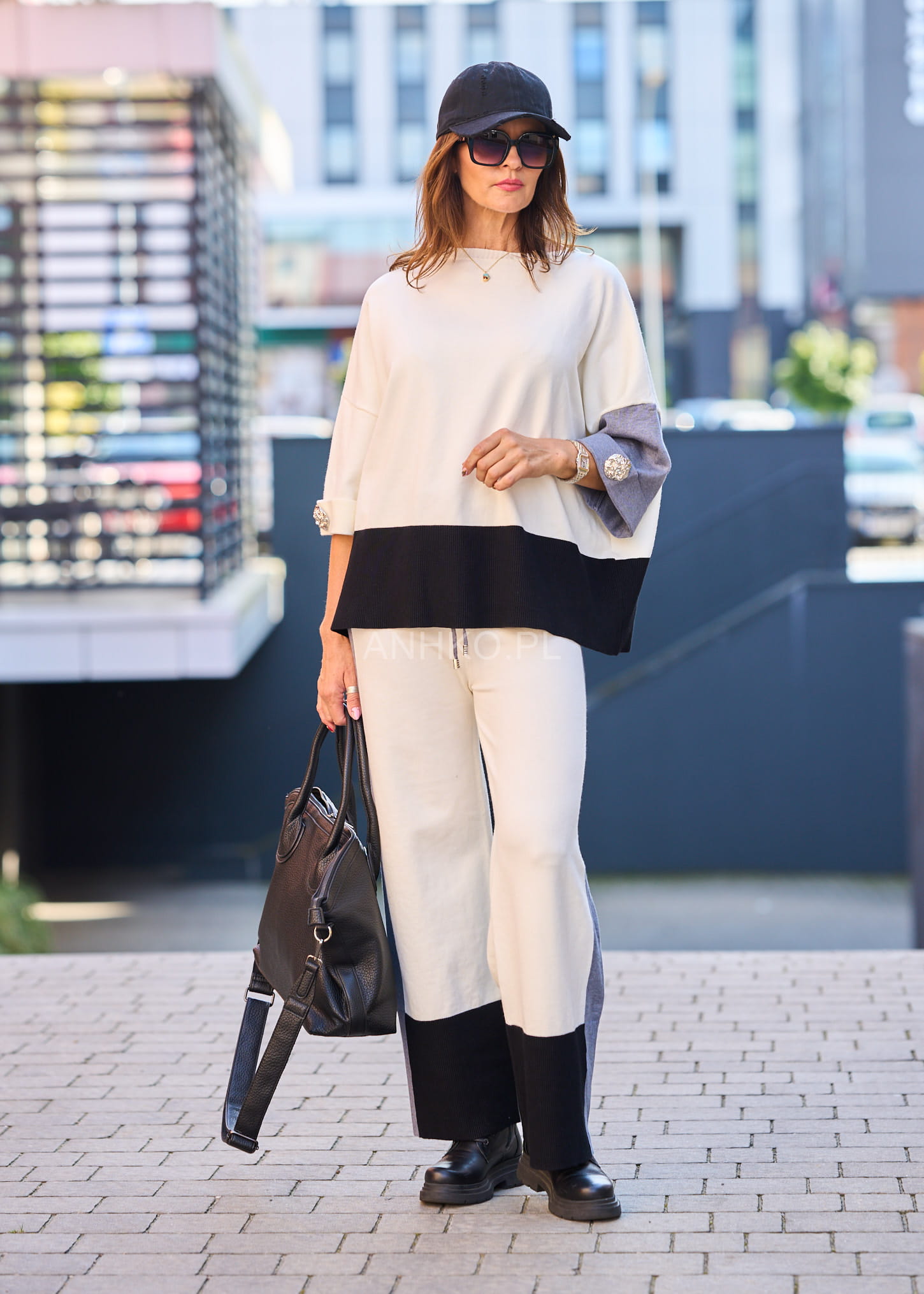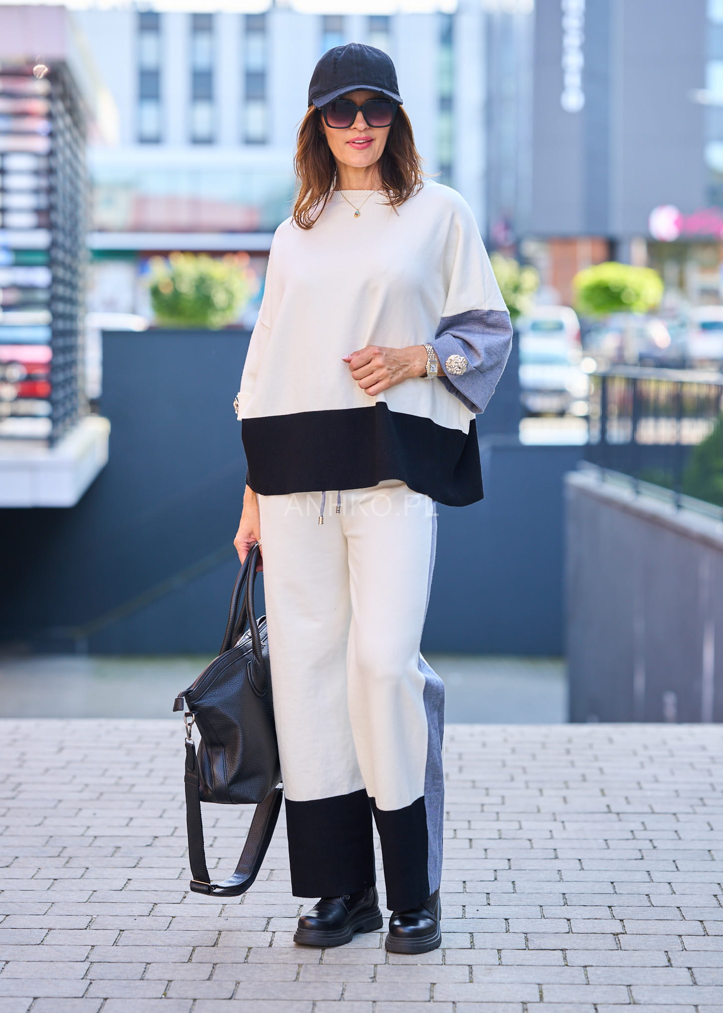 To połączenie wygody i nowoczesnego designu. Sweter o luźnym kroju w odcieniach kremu, szarego i czerni tworzy harmonijną całość ze spodniami, które zapewniają komfort dzięki gumce w pasie i miękkiemu materiałowi. Ten zestaw doskonale sprawdzi się w casualowych stylizacjach – możesz go nosić na spacer, spotkania z przyjaciółmi czy na zakupy. Dzięki eleganckiemu, ale niewymuszonemu charakterowi pasuje także do pracy w mniej formalnym biurze. Łącz go z klasycznymi sneakersami, botkami albo eleganckimi loafersami. Komplet łączy w sobie wygodę i styl, a dzięki starannemu wykonaniu będzie ulubionym elementem Twojej garderoby na wiele sezonów.
