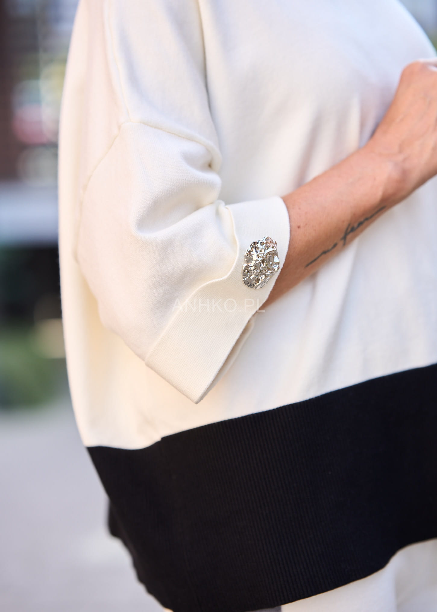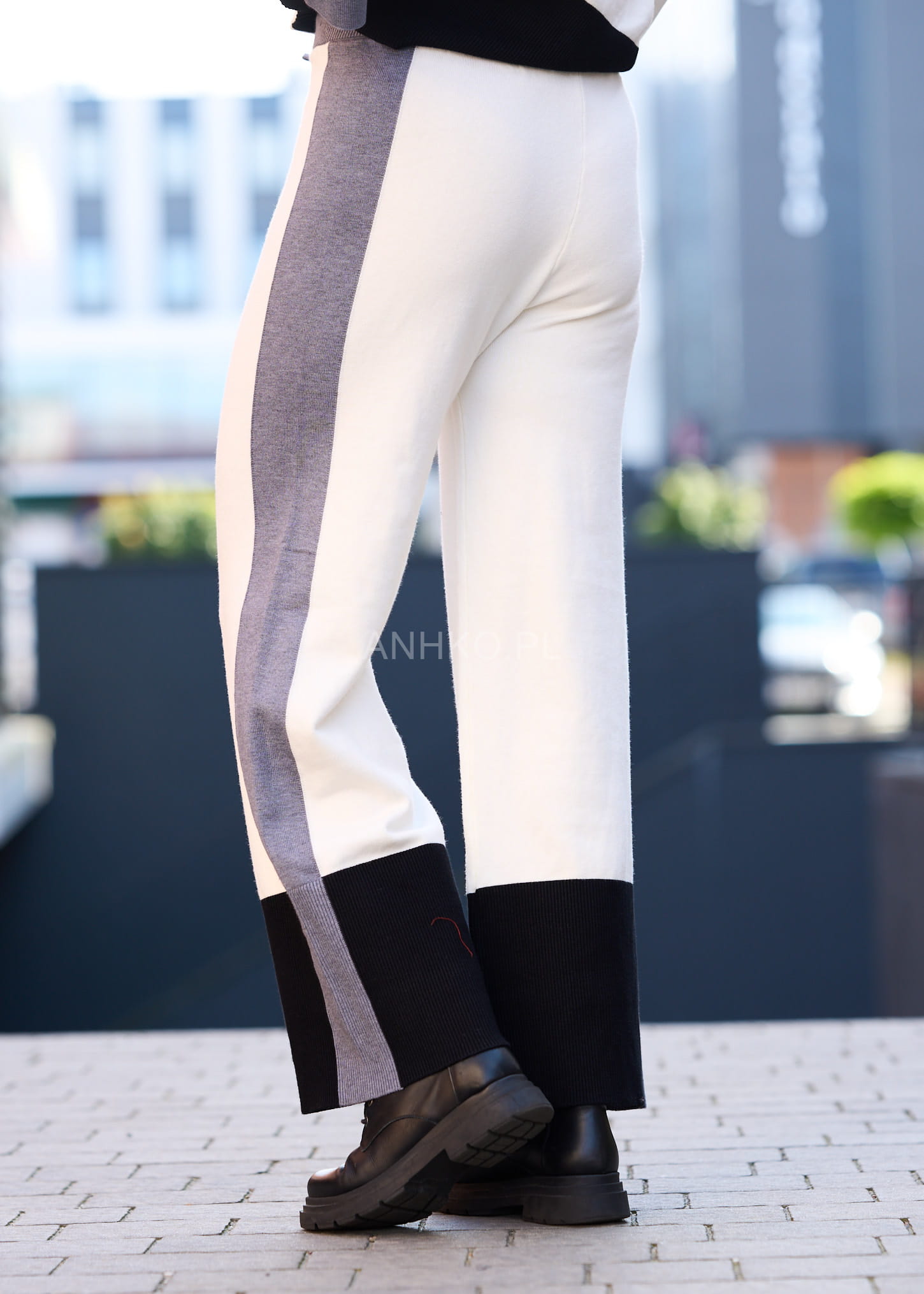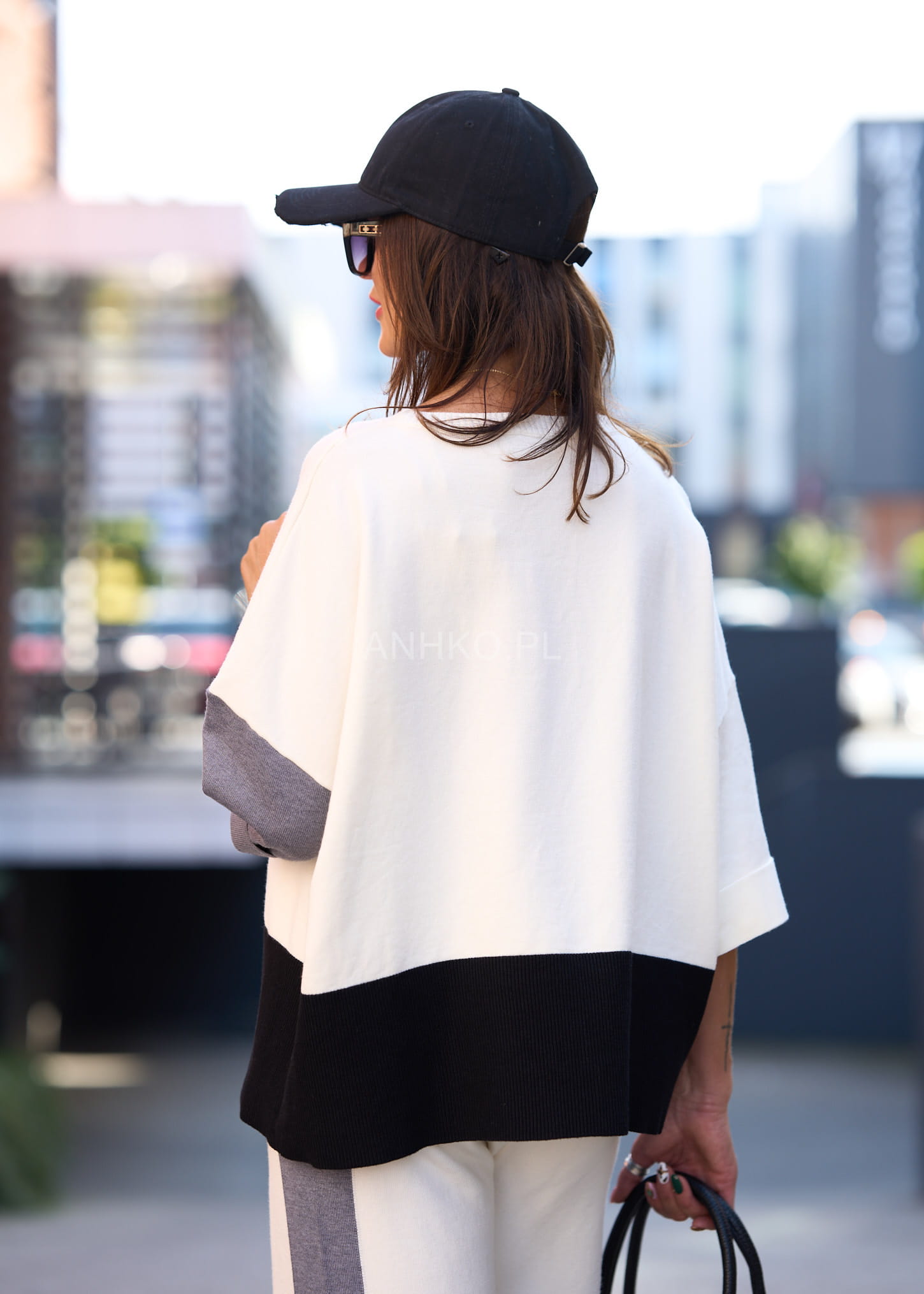 To połączenie wygody i nowoczesnego designu. Sweter o luźnym kroju w odcieniach kremu, szarego i czerni tworzy harmonijną całość ze spodniami, które zapewniają komfort dzięki gumce w pasie i miękkiemu materiałowi. Ten zestaw doskonale sprawdzi się w casualowych stylizacjach – możesz go nosić na spacer, spotkania z przyjaciółmi czy na zakupy. Dzięki eleganckiemu, ale niewymuszonemu charakterowi pasuje także do pracy w mniej formalnym biurze. Łącz go z klasycznymi sneakersami, botkami albo eleganckimi loafersami. Komplet łączy w sobie wygodę i styl, a dzięki starannemu wykonaniu będzie ulubionym elementem Twojej garderoby na wiele sezonów.