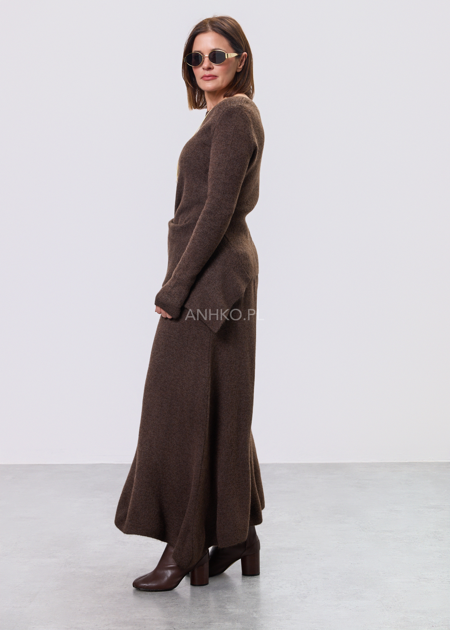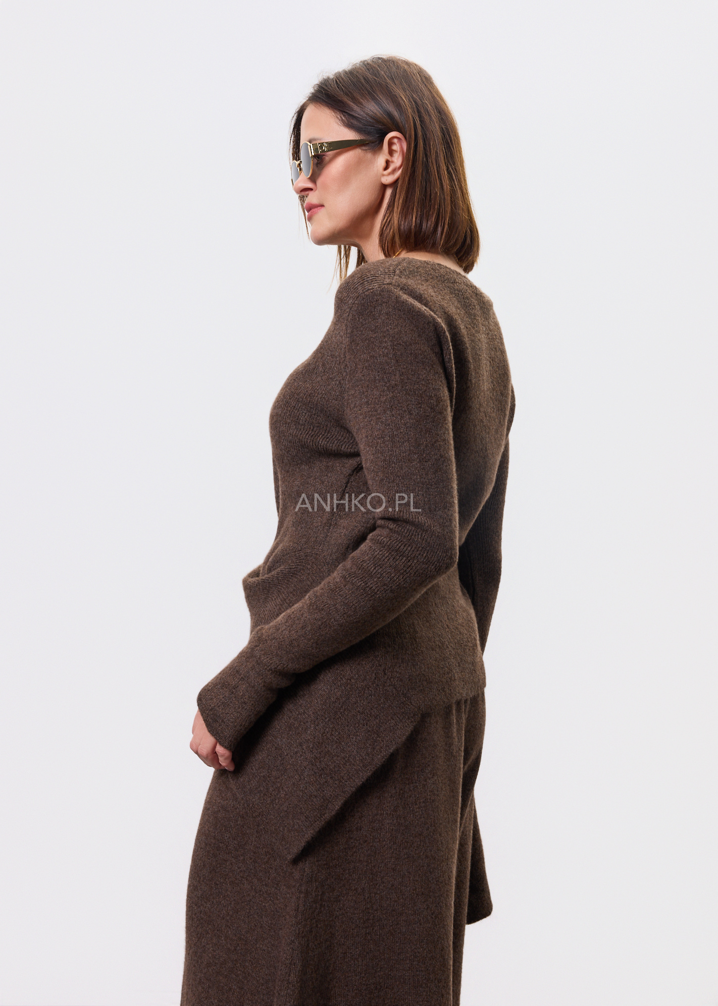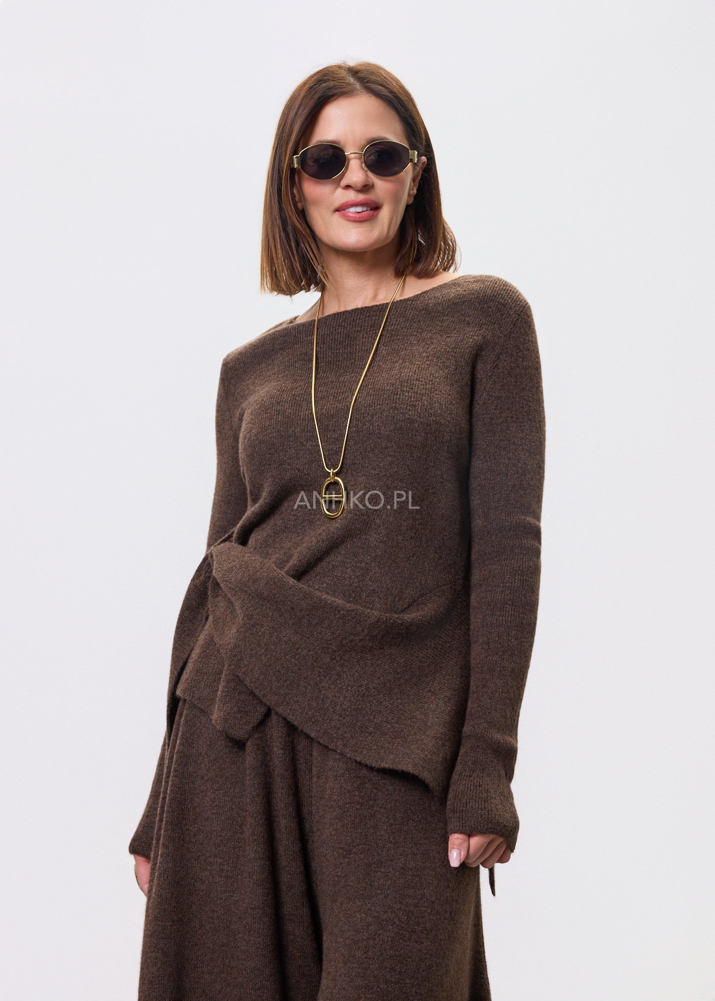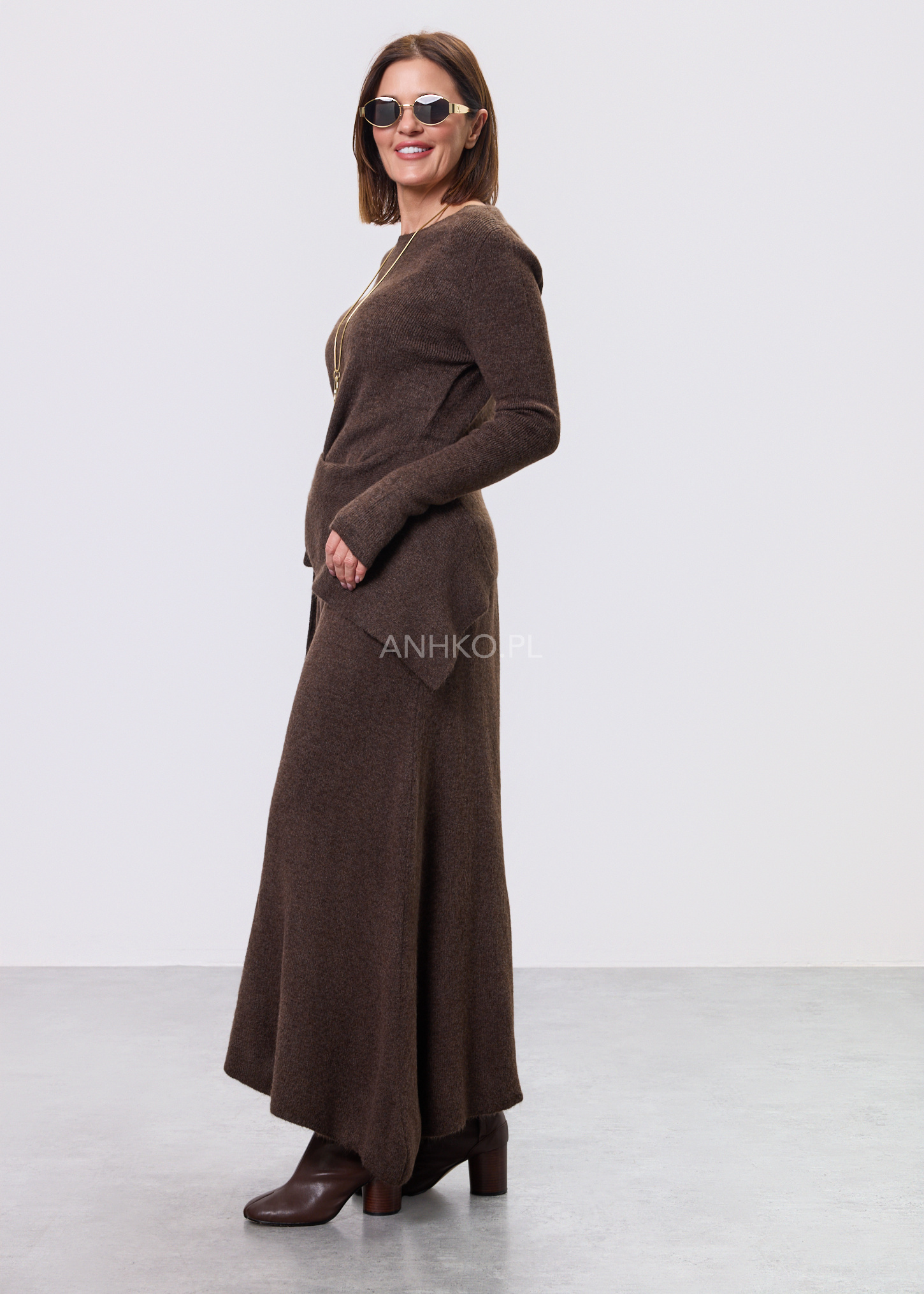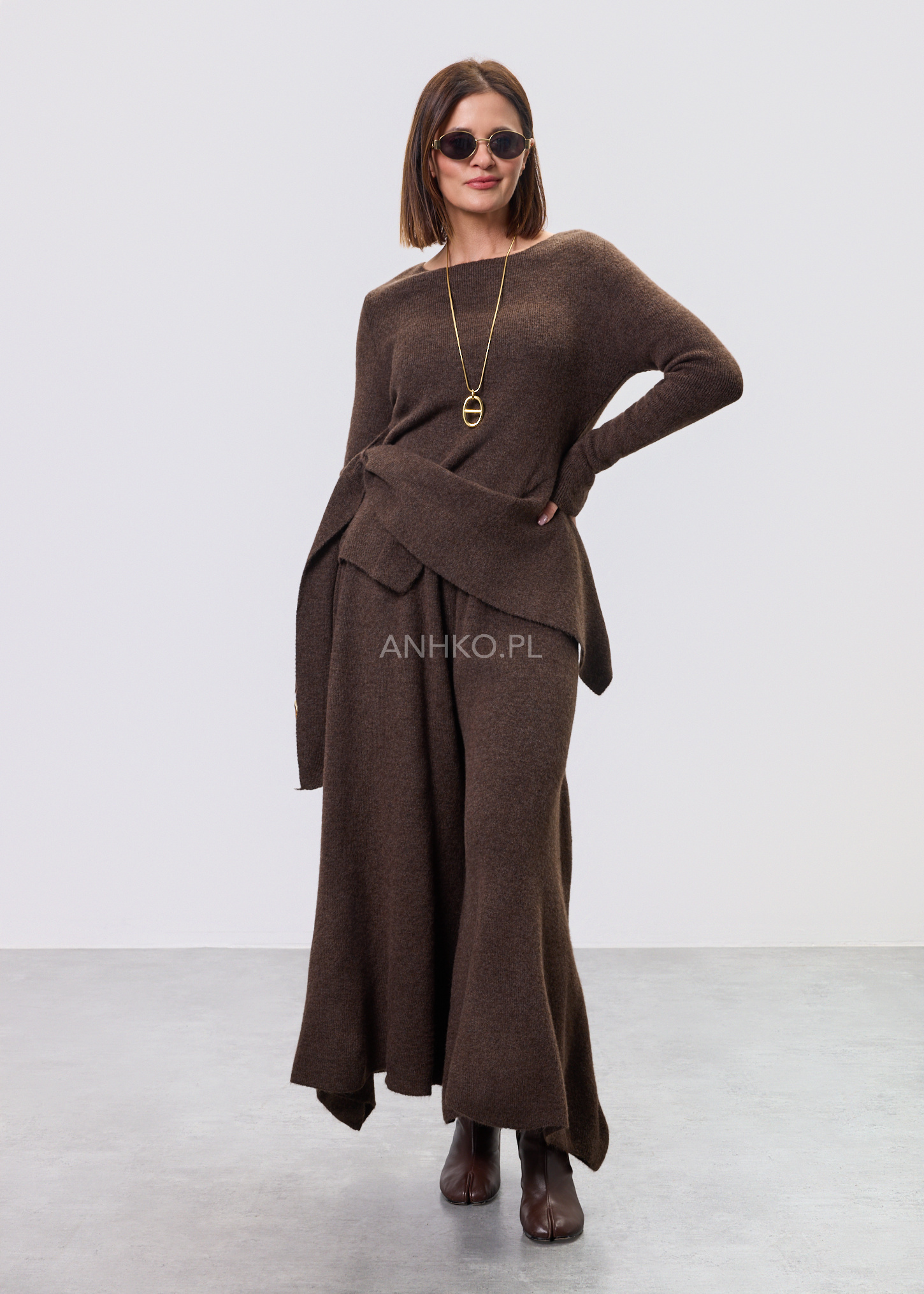Ten komplet dzianinowy damski w odcieniu głębokiego brązu przyciąga uwagę elegancką prostotą i dopracowaną formą. Asymetryczna tunika z dekoracyjnym marszczeniem w talii subtelnie modeluje sylwetkę, a ukośny panel nadaje całości dynamicznego, designerskiego charakteru. Ciepły, nasycony kolor pięknie współgra z minimalistycznymi dodatkami i tworzy spójną, wyrafinowaną stylizację.