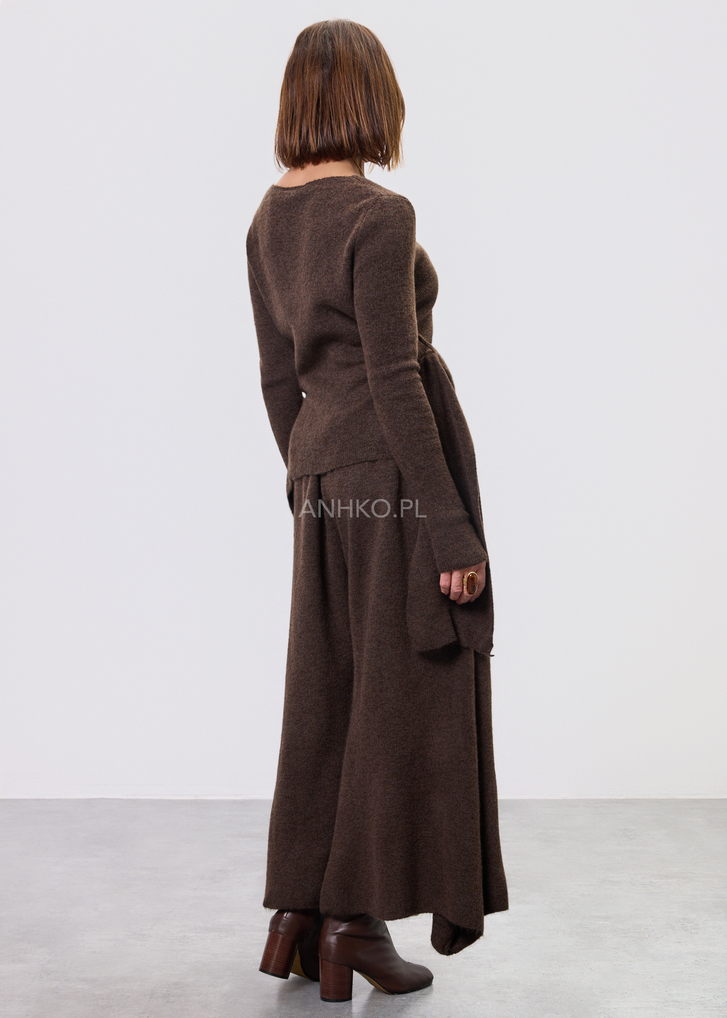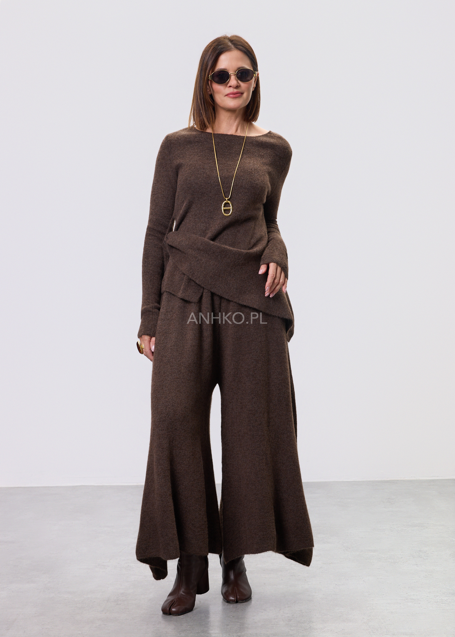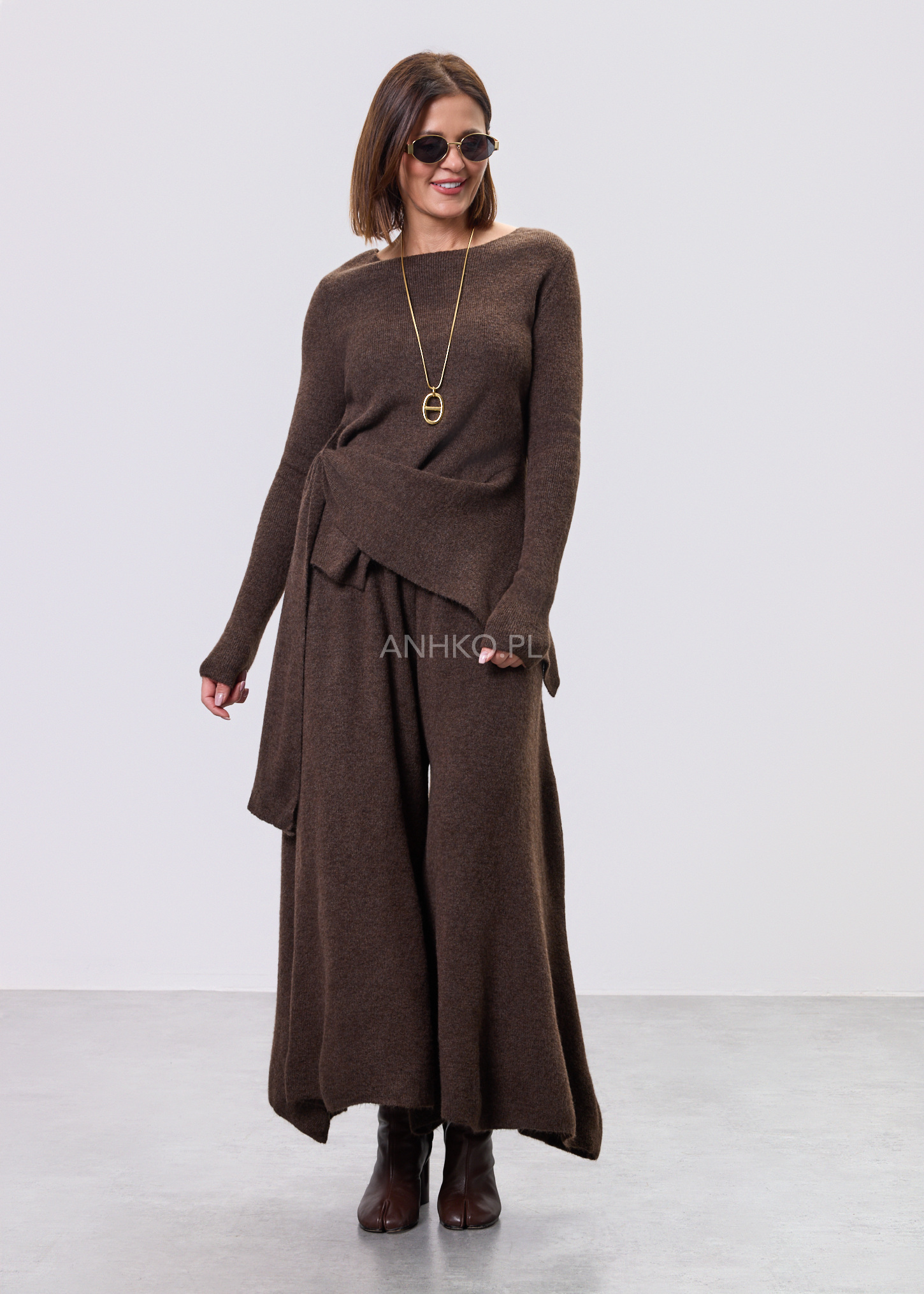 Szerokie, lejące spodnie miękko opadają wzdłuż nóg, wydłużając optycznie sylwetkę i zapewniając pełną swobodę ruchu. Elastyczna dzianina z dodatkiem alpaki jest przyjemna w dotyku i komfortowa w noszeniu, a dwuczęściowa konstrukcja pozwala nosić elementy razem lub osobno. To model dla kobiet ceniących minimalistyczny design i wygodę w eleganckim wydaniu.