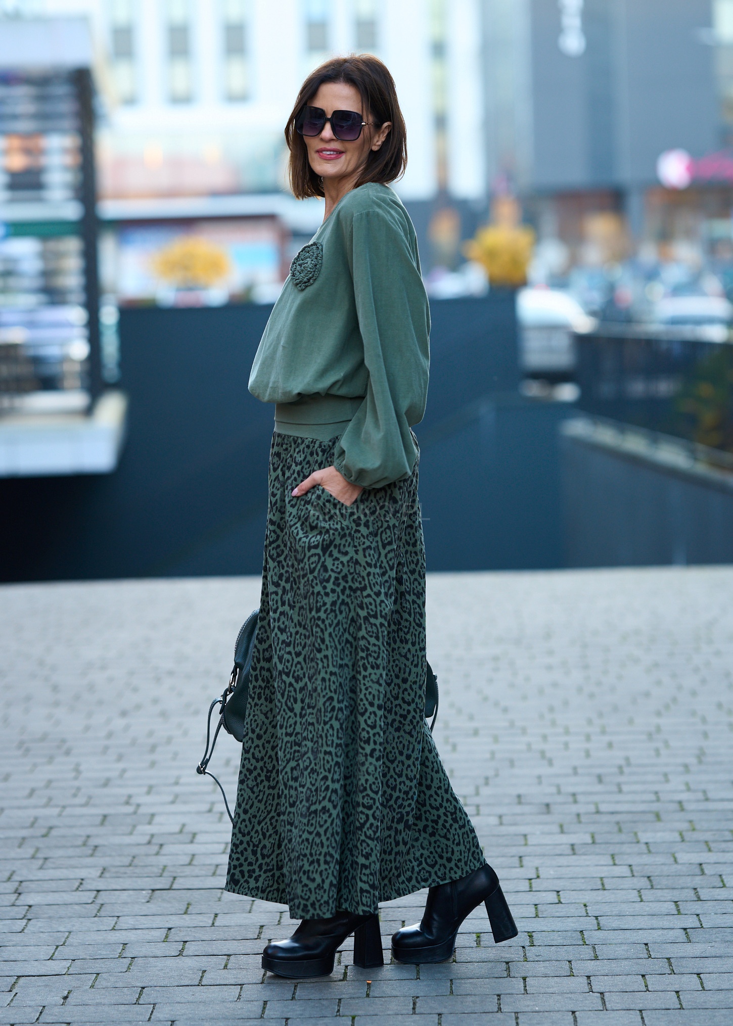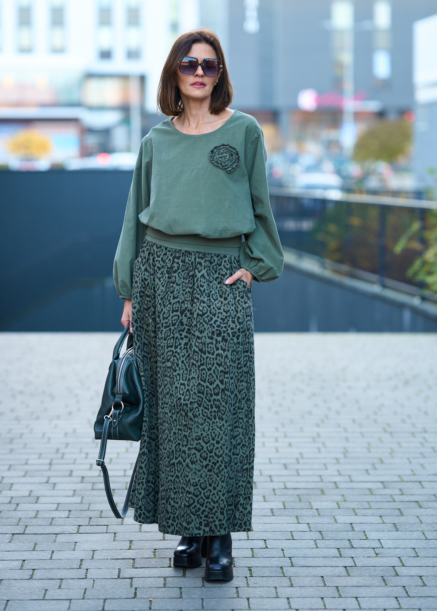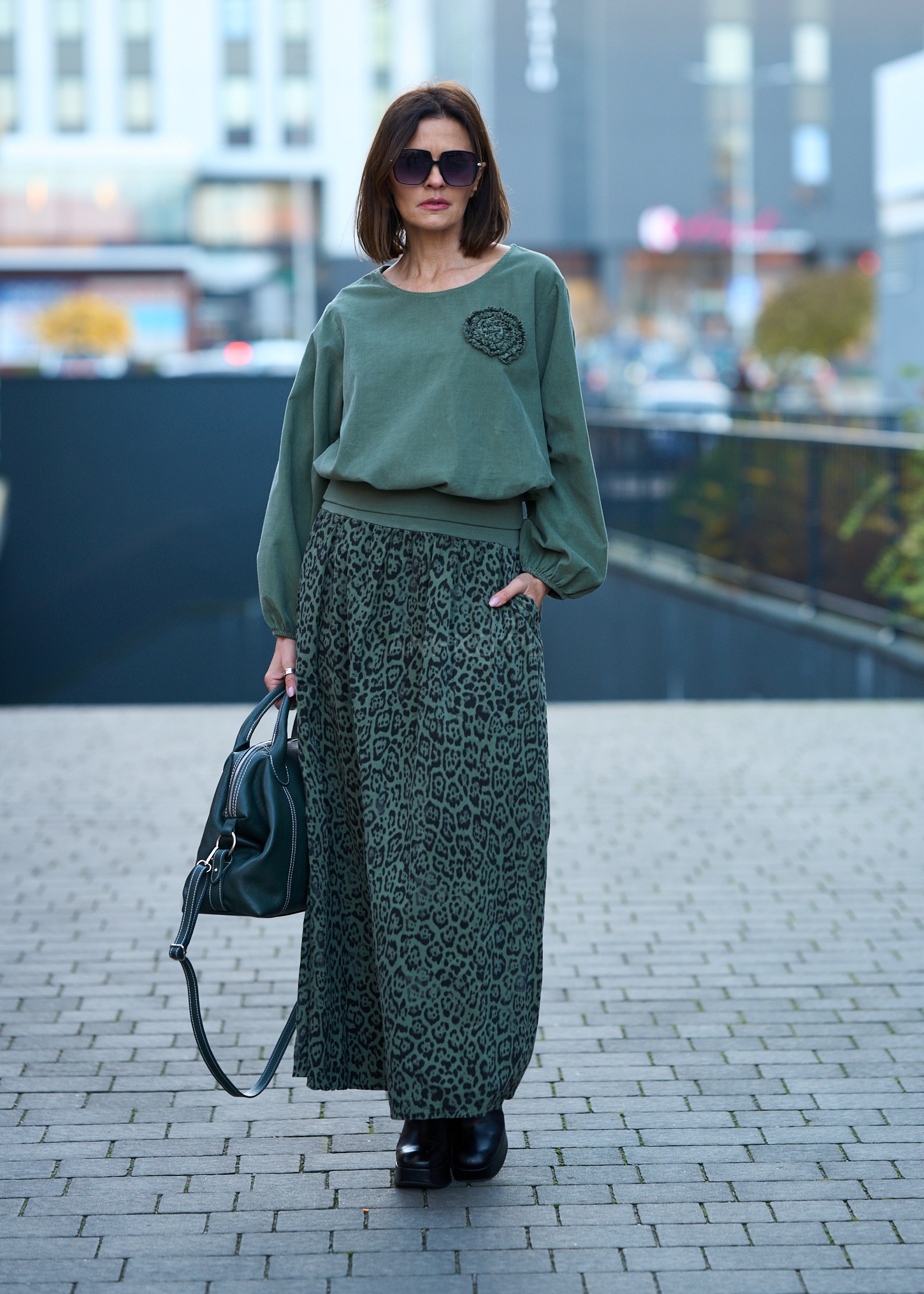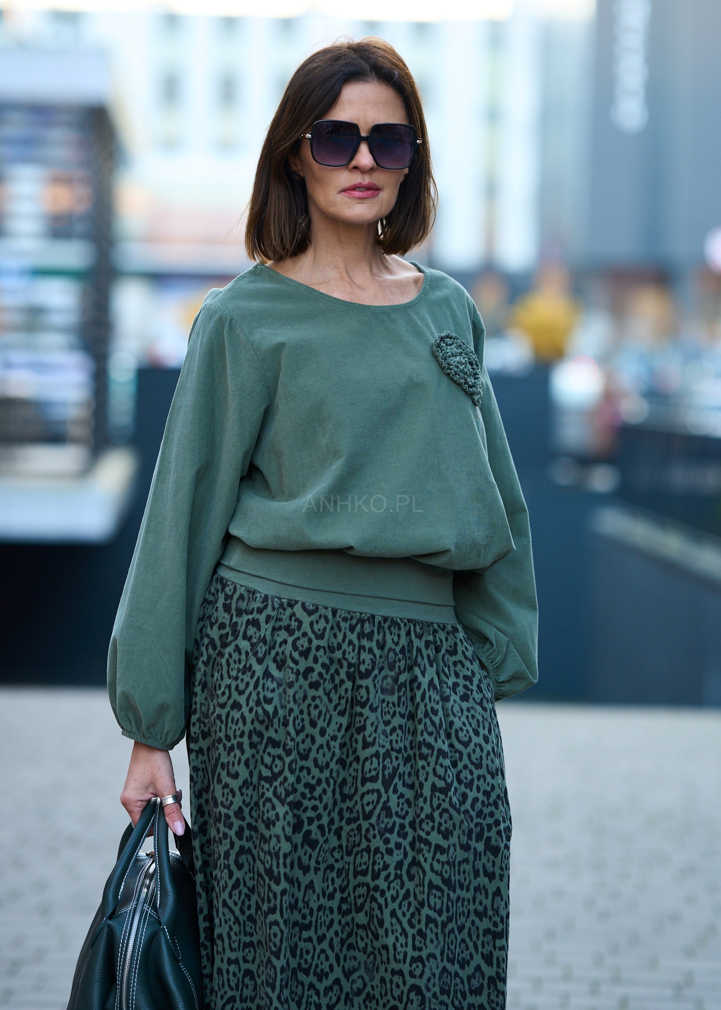 Wyjątkowy komplet, który składa się z bluzki oraz spódnicy. Ten zestaw to idealna propozycja dla kobiet, które cenią sobie styl, wygodę i odrobinę drapieżności w swojej garderobie.