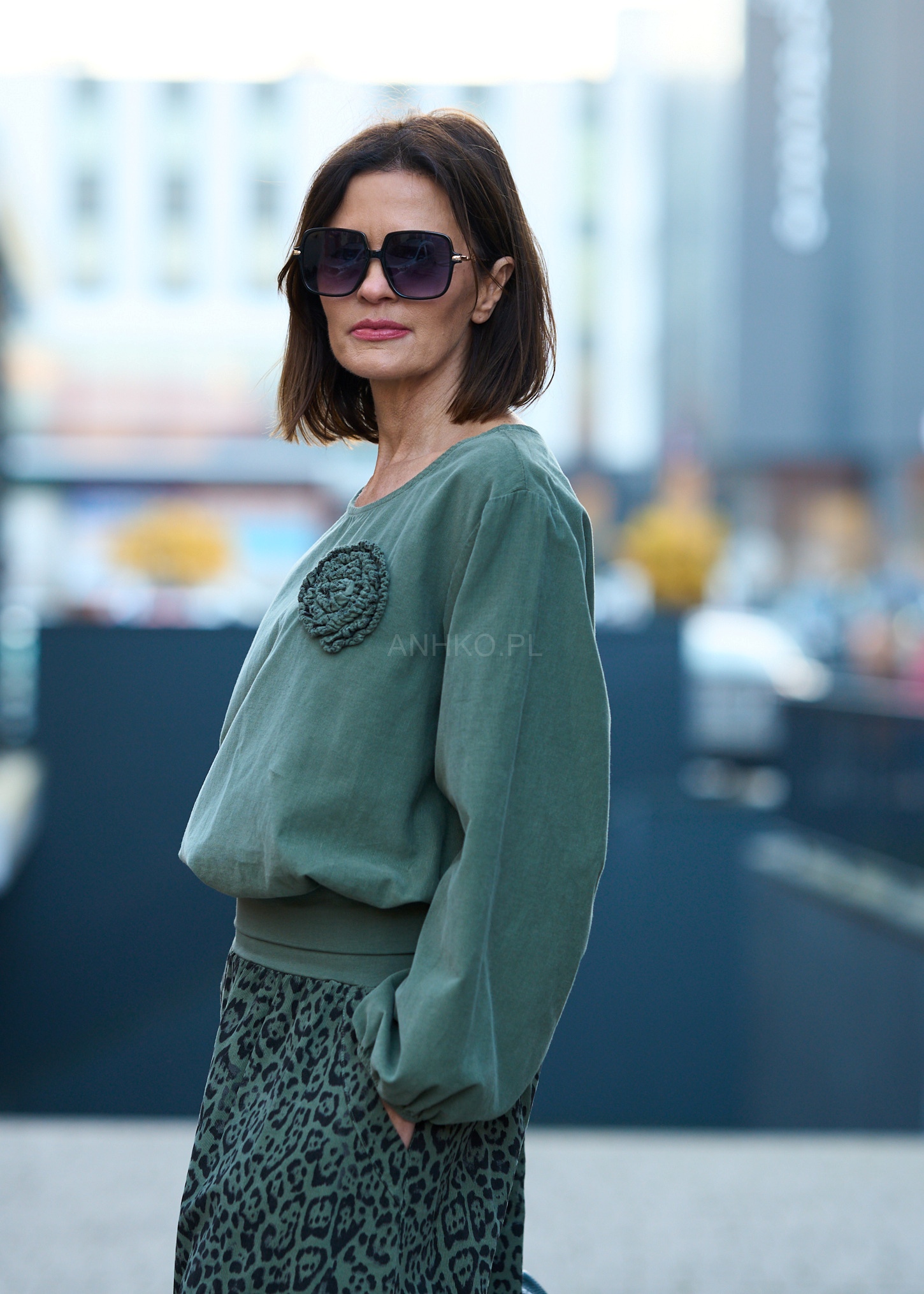 Bluzka Spantin- bluzka koszulowa to kwintesencja subtelności i elegancji. Jej długi rękaw zakończony jest elastyczną gumką, co nadaje mu delikatny wygląd. Ozdobny kwiat na przodzie dodaje bluzce uroku i kobiecego wdzięku. Idealna do noszenia na wiele okazji, ta bluzka z pewnością przyciągnie uwagę swoim delikatnym stylem.
